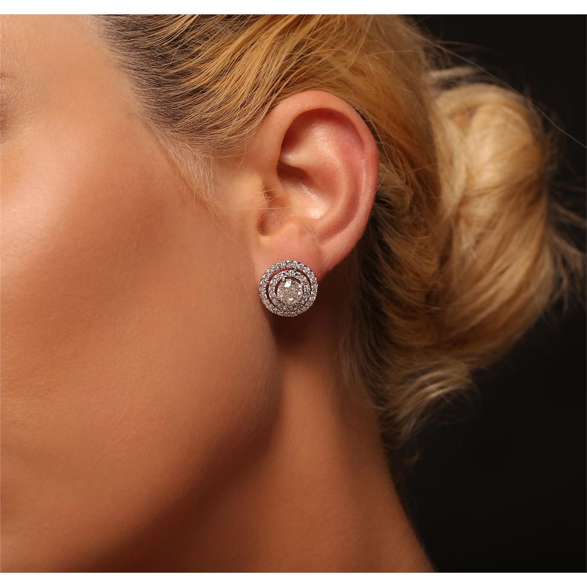 One pair electronically tested 14KT white gold Ladies combination cast & die struck stud earrings with friction posts with a bright polish finish. Condition is new. Containing: Two prong set round brilliant cut diamonds, measuring 6.16 - 6.14 x 3.69mm (depth est.) approximate. Total Weight of 2 Stones = 1.70ct. Clarity: I-2 to I-3. Color: H - I, Cut is Good. Eighty-Eight prong set round brilliant cut diamonds, measuring 1.40 - 1.40 x 0.84mm (depth est.) approximate. Total Weight of 88 Stones = 0.88ct. Clarity: I-1 to I-2. Color: H - I, Cut is Good. Total Weight of Diamonds 2.58ct. Total Weight of Earrings 4.40 grams. GGL Appraised at $10,000.00.