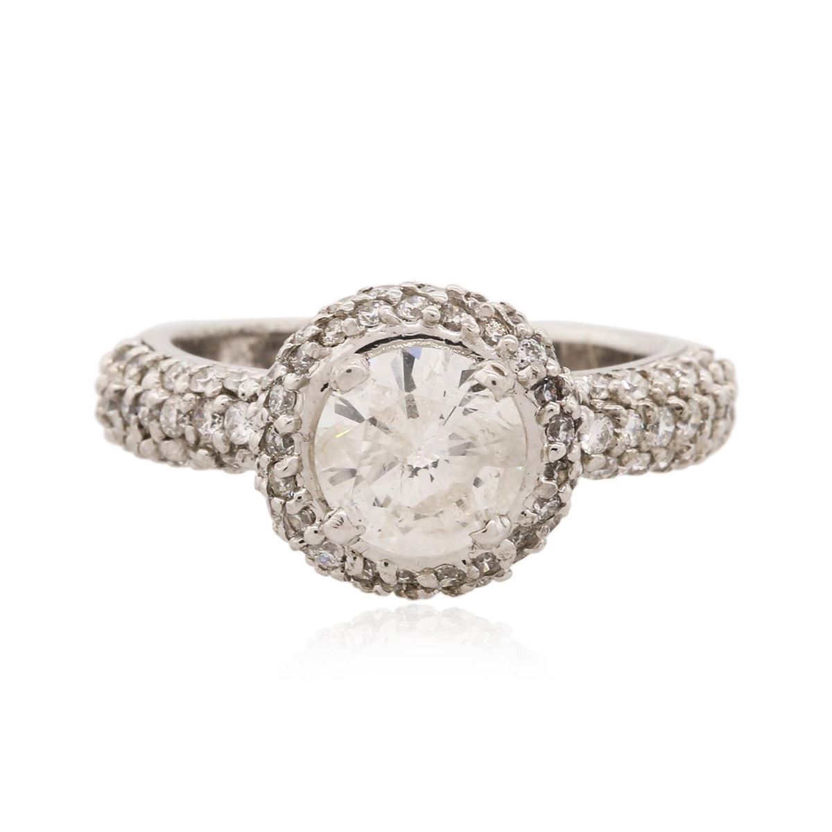 One electronically tested 14KT white gold Ladies combination cast & assembled engagement ring with a bright polish finish. Condition is very good. Identified with markings of "14K". Containing: One prong set round brilliant cut diamond, measuring 7.09 - 7.03 x 4.64mm (depth est.) approximate weight of 1.33ct. Clarity: I-2. Color: J, Cut is Good. One Hundred Thirteen bead set round brilliant cut diamonds, measuring 1.30 - 1.30 x 0.78mm (depth est.) approximate. Total Weight of 113 Stones = 1.25ct. Clarity: I-1 to I-2. Color: I - J, Cut is Good. Diamonds graded in the mounting. Total Weight of Diamonds 2.58ct. Total Weight of Ring 5.90 grams. GGL Appraised at $14,525.00.