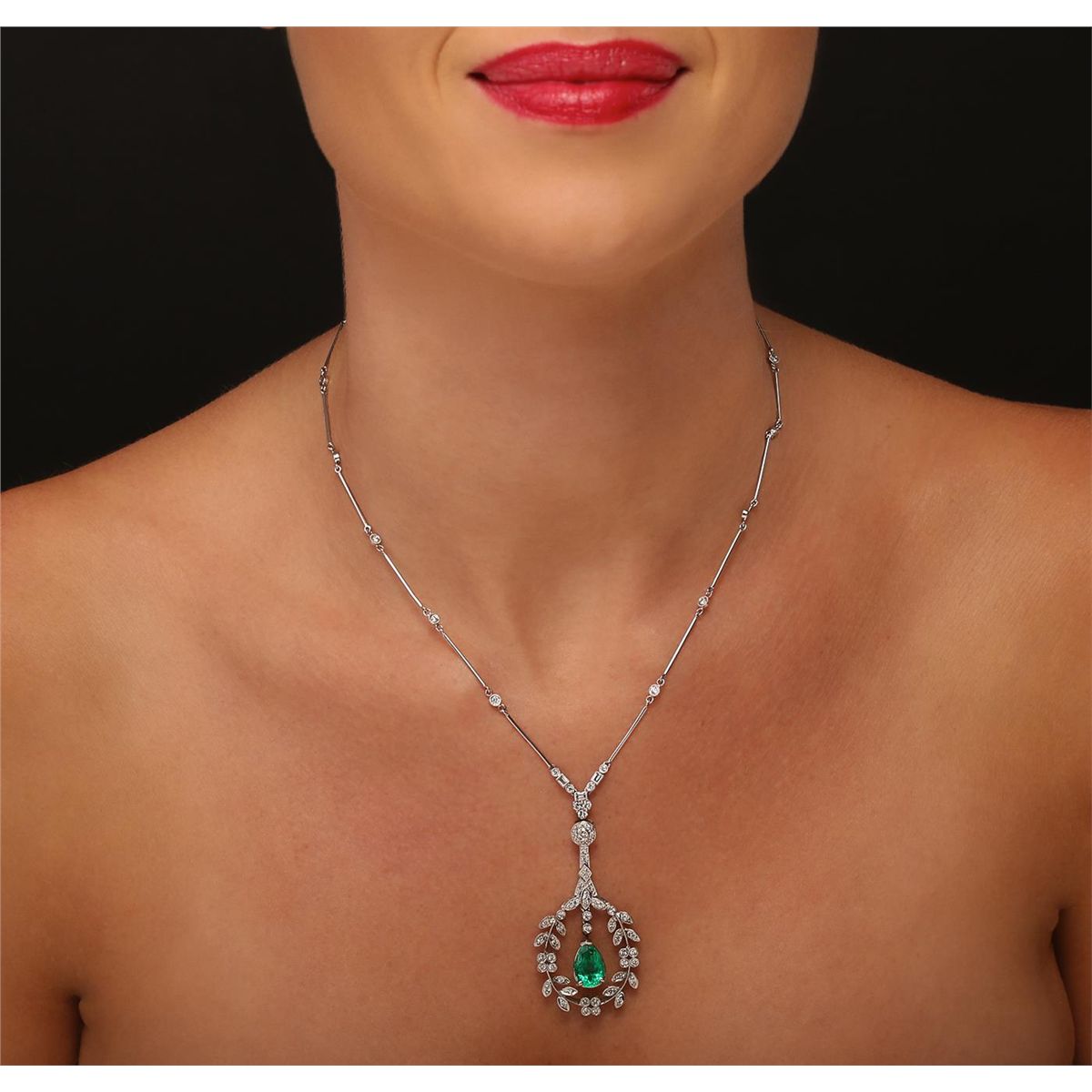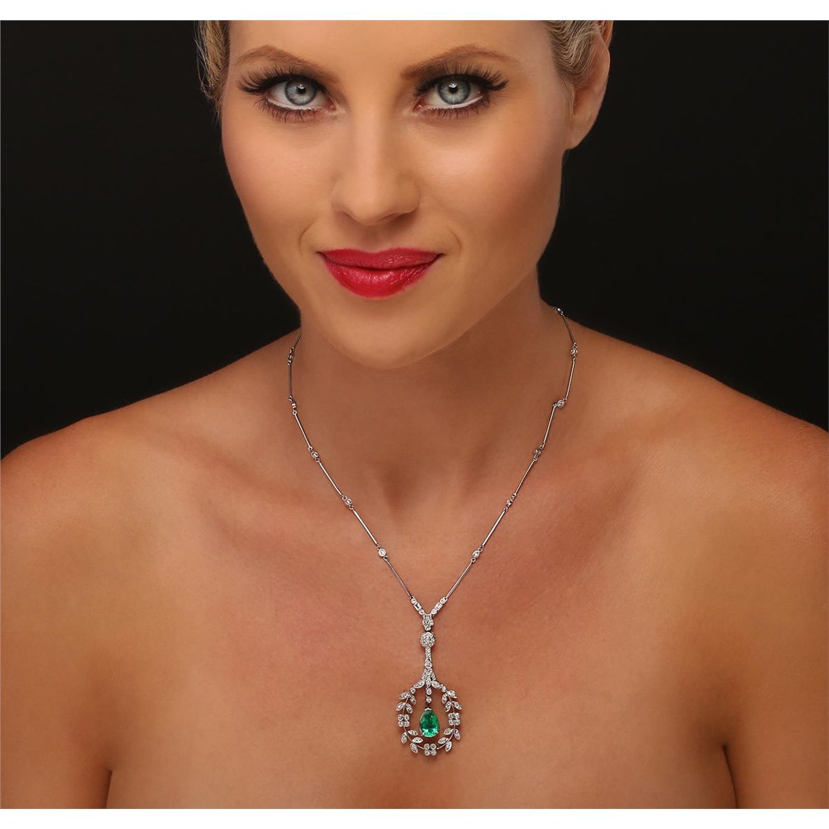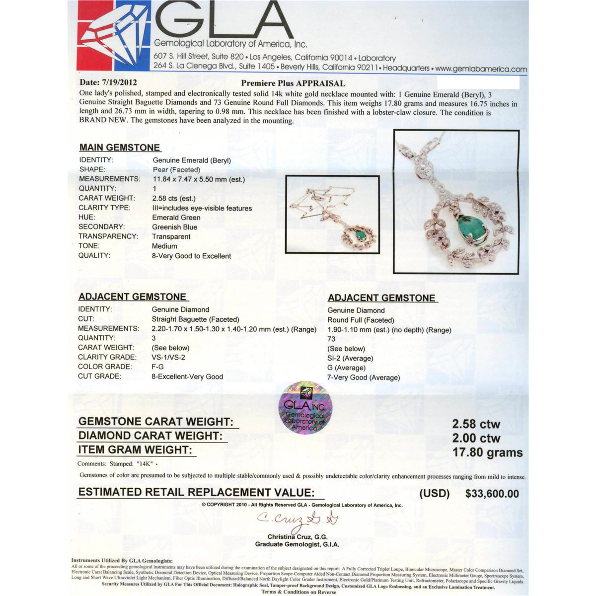 One Ladies polished, stamped and electronically tested solid 14KT white gold necklace mounted with 1 genuine emerald (beryl) 3 genuine straight baguette diamonds and 73 genuine round full diamonds. This item weighs 17.80 grams and measures 16.75 inches in length and 26.73mm in width, tapering to 0.98mm. This necklace has been finished with a lobster-claw closure. The condition is brand new. The gemstones have been analyzed in the mounting. Main gemstone identity genuine emerald (beryl). Shape pear faceted. Measurements 11.84 x 7.47 x 5.50mm (est). Quantity 1. Carat weight 2.58cts (est). Clarity type III-includes eye visible features. Hue emerald green. Secondary greenish blue. Transparency transparent. Tone medium. Quality 8 very good to excellent. Adjacent gemstone identity genuine diamond. Cut straight baguette (faceted). Measurements 2.20-1.70x1.50-1.30x1.40-1.20mm (est) (range). Quantity 3. Carat weight see below. Clarity grade VS-1/VS-2. Color grade F-G. Cut grade 8 - excellent - very good. Adjacent gemstone identity genuine diamond. Cut round full (faceted). Measurements 1.90-1.10mm (est) (no depth) (range). Quantity 73. Carat weight see below. Clarity grade SI-2 (average). Color grade G (Average). Cut grade 7 - very good (average). Gemstone carat weight 2.58ctw. Diamond carat weight 2.00ctw. Item gram weight 17.80 grams. GLA Appraised at $33,600.00.