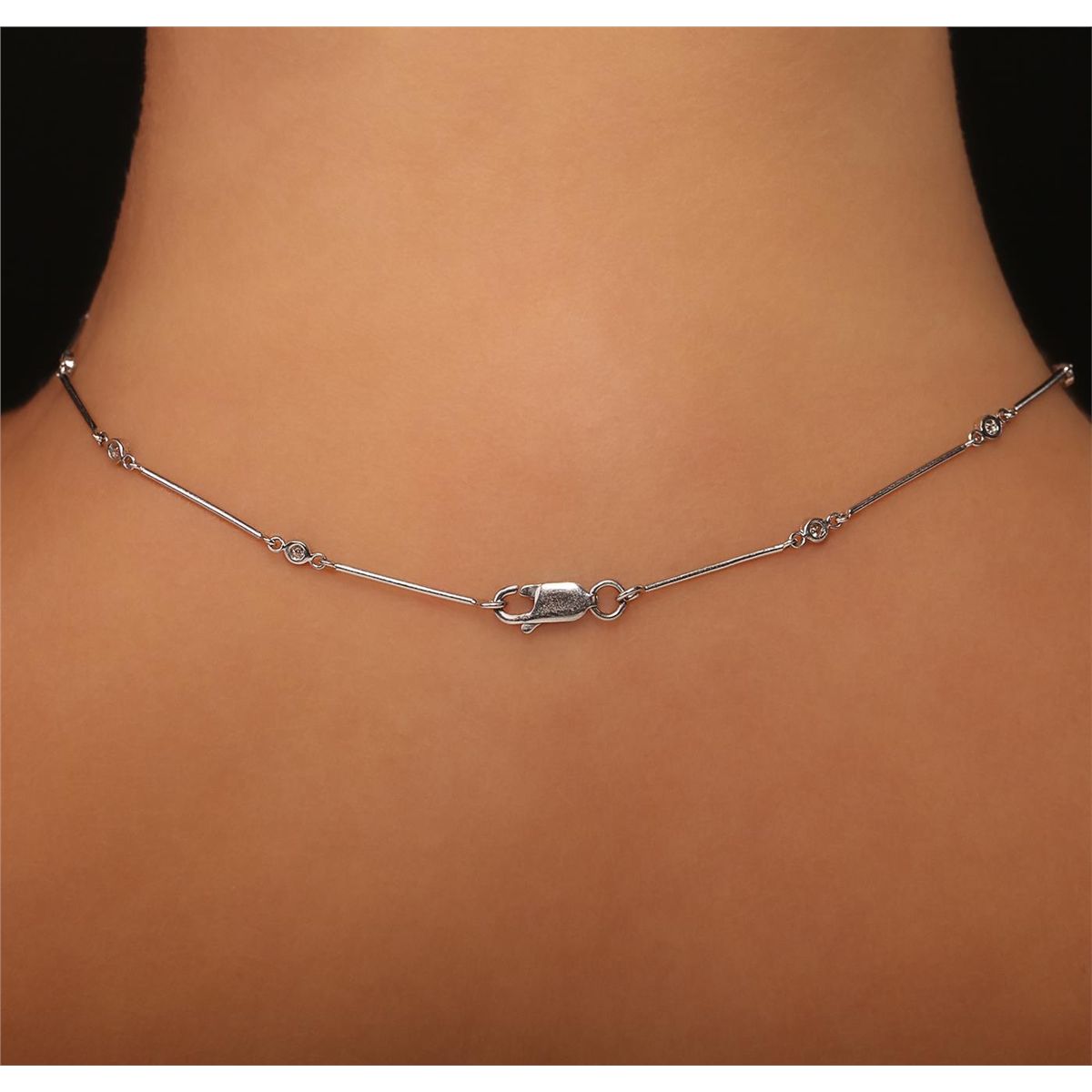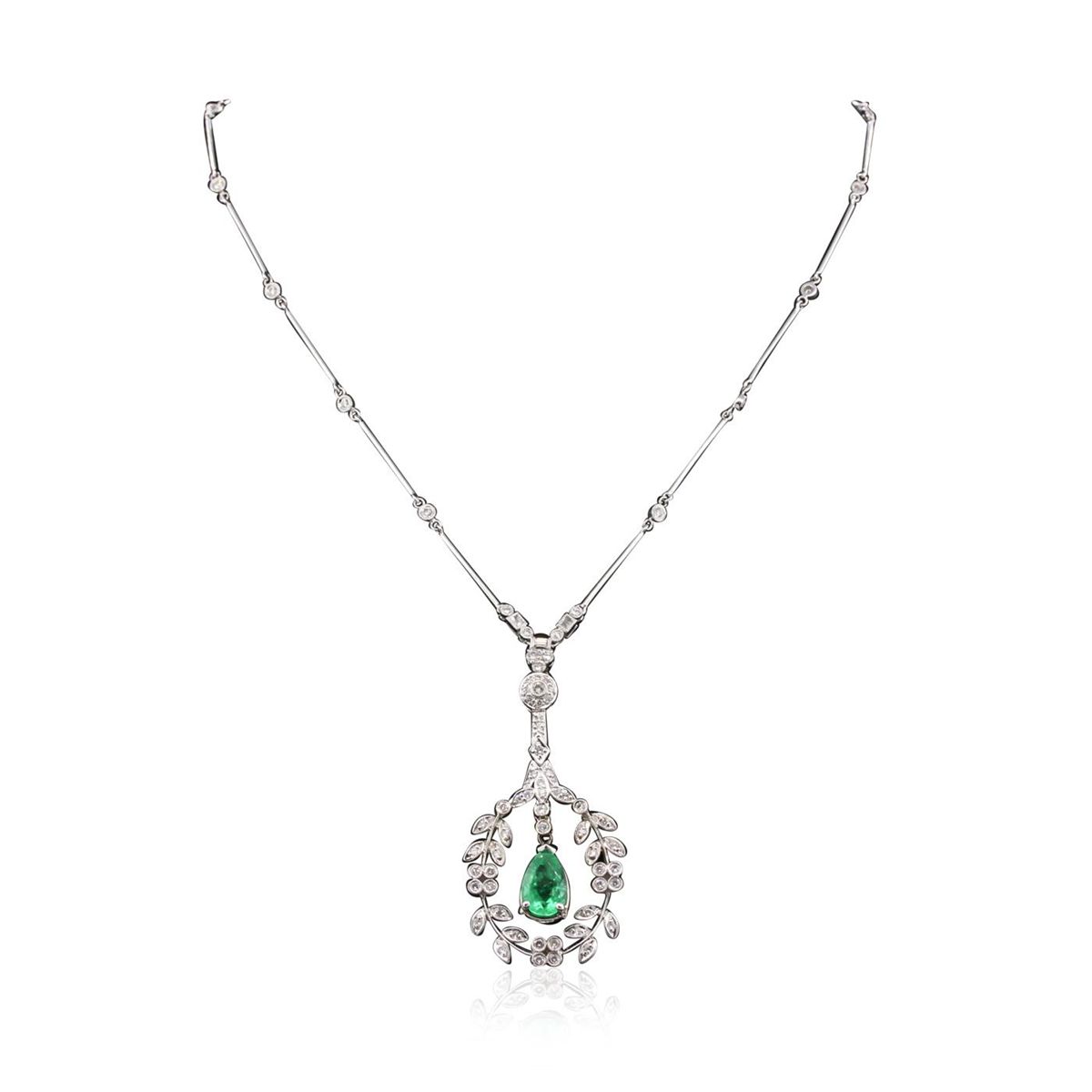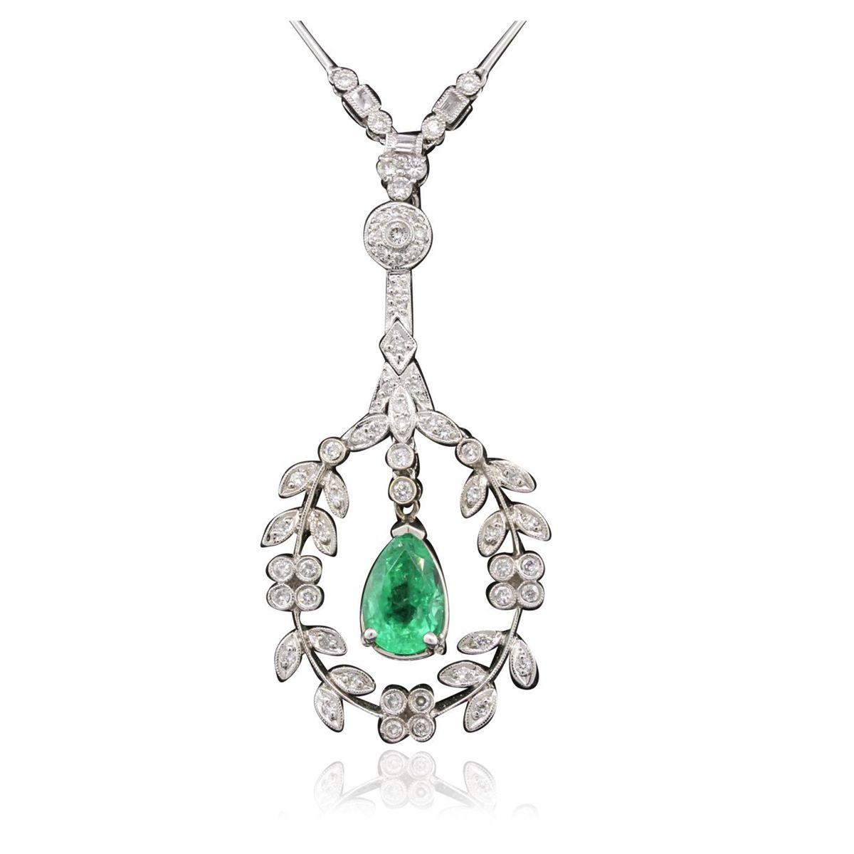 One Ladies polished, stamped and electronically tested solid 14KT white gold necklace mounted with 1 genuine emerald (beryl) 3 genuine straight baguette diamonds and 73 genuine round full diamonds. This item weighs 17.80 grams and measures 16.75 inches in length and 26.73mm in width, tapering to 0.98mm. This necklace has been finished with a lobster-claw closure. The condition is brand new. The gemstones have been analyzed in the mounting. Main gemstone identity genuine emerald (beryl). Shape pear faceted. Measurements 11.84 x 7.47 x 5.50mm (est). Quantity 1. Carat weight 2.58cts (est). Clarity type III-includes eye visible features. Hue emerald green. Secondary greenish blue. Transparency transparent. Tone medium. Quality 8 very good to excellent. Adjacent gemstone identity genuine diamond. Cut straight baguette (faceted). Measurements 2.20-1.70x1.50-1.30x1.40-1.20mm (est) (range). Quantity 3. Carat weight see below. Clarity grade VS-1/VS-2. Color grade F-G. Cut grade 8 - excellent - very good. Adjacent gemstone identity genuine diamond. Cut round full (faceted). Measurements 1.90-1.10mm (est) (no depth) (range). Quantity 73. Carat weight see below. Clarity grade SI-2 (average). Color grade G (Average). Cut grade 7 - very good (average). Gemstone carat weight 2.58ctw. Diamond carat weight 2.00ctw. Item gram weight 17.80 grams. GLA Appraised at $33,600.00.