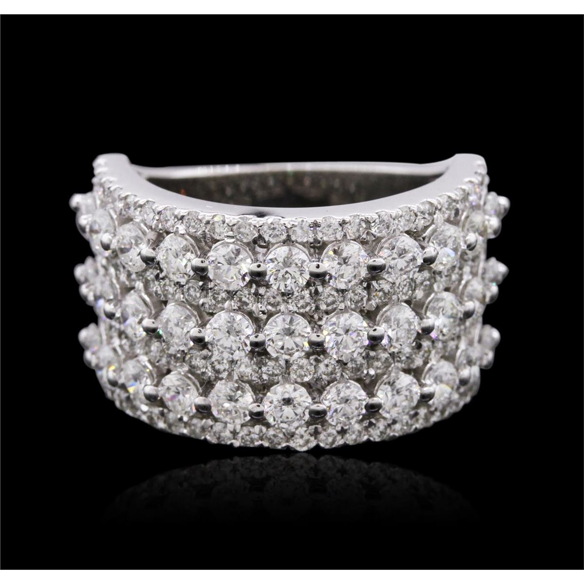 One electronically tested 14KT white gold ladies combination cast & assembled diamond ring with a flat shank with a bright polish finish. Identified with markings of "K14". Condition is new. Containing: Thirty-Three prong set round brilliant cut diamonds, measuring 2.50 - 2.50 x 1.50mm (depth est.) approximate total weight of 33 Stones = 1.88ct. Clarity: SI-2 to I-1. Color: H - I, Cut is Good. Eighty-Eight prong set round brilliant cut diamonds, measuring 1.30 - 1.30 x 0.78mm (depth est.) approximate total weight of 88 Stones = 0.70ct. Clarity: SI-2 to I-2. Color: H - I, Cut is Good. All diamonds are graded in the mounting, unless otherwise stated. Total Weight of Diamonds 2.59ct. Total Weight of Ring 9.80 grams. GGL Appraised at $7,175.00.