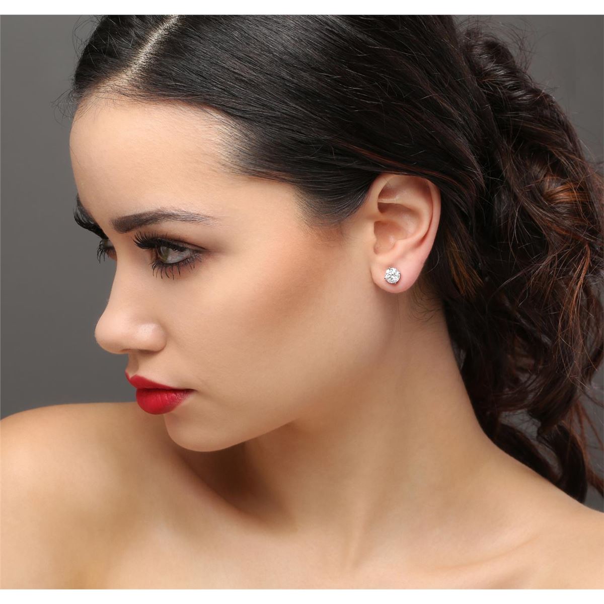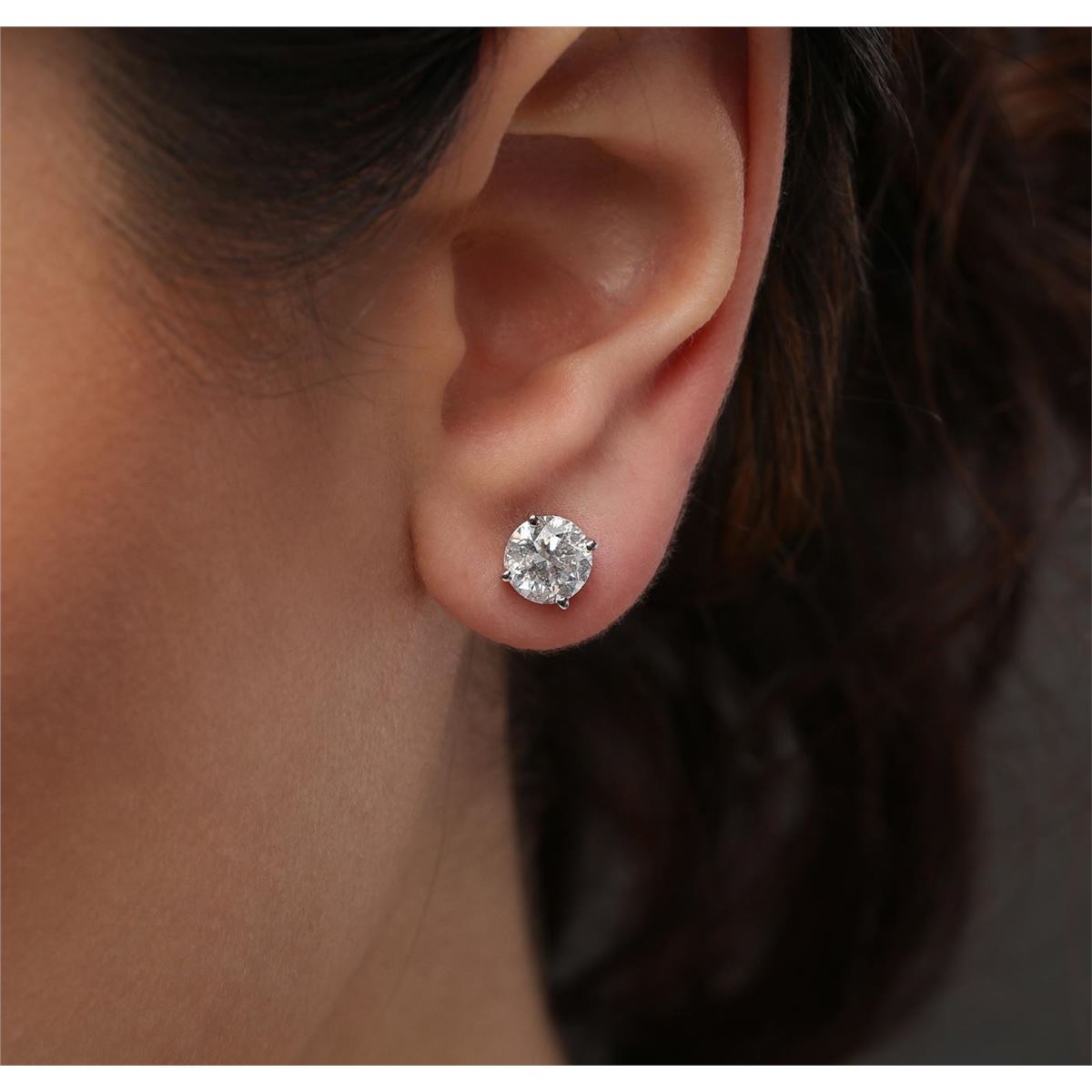 One pair electronically tested 14KT white gold ladies cast diamond stud earrings with friction posts with a bright polish finish. Identified with markings of "14K". Condition is new. Containing: One prong set round brilliant cut diamond, measuring 7.20 - 7.10 x 4.29mm (depth est.) approximate weight of 1.34ct. Clarity: I-1. Color: J, Cut is Good. One prong set round brilliant cut diamond, measuring 7.00 - 7.00 x 4.20mm (depth est.) approximate weight of 1.26ct. Clarity: I-2. Color: I, Cut is Good. All diamonds are graded in the mounting, unless otherwise stated. Total Weight of Diamonds 2.59ct. Total Weight of Earrings 2.00 grams. GGL Appraised at $13,110.00.