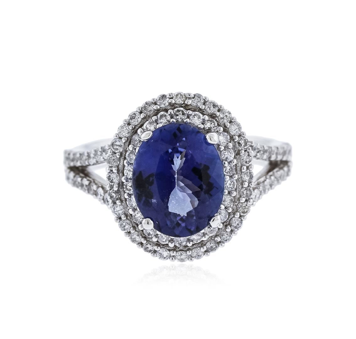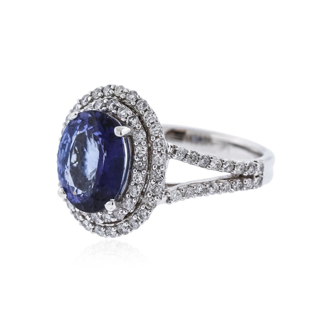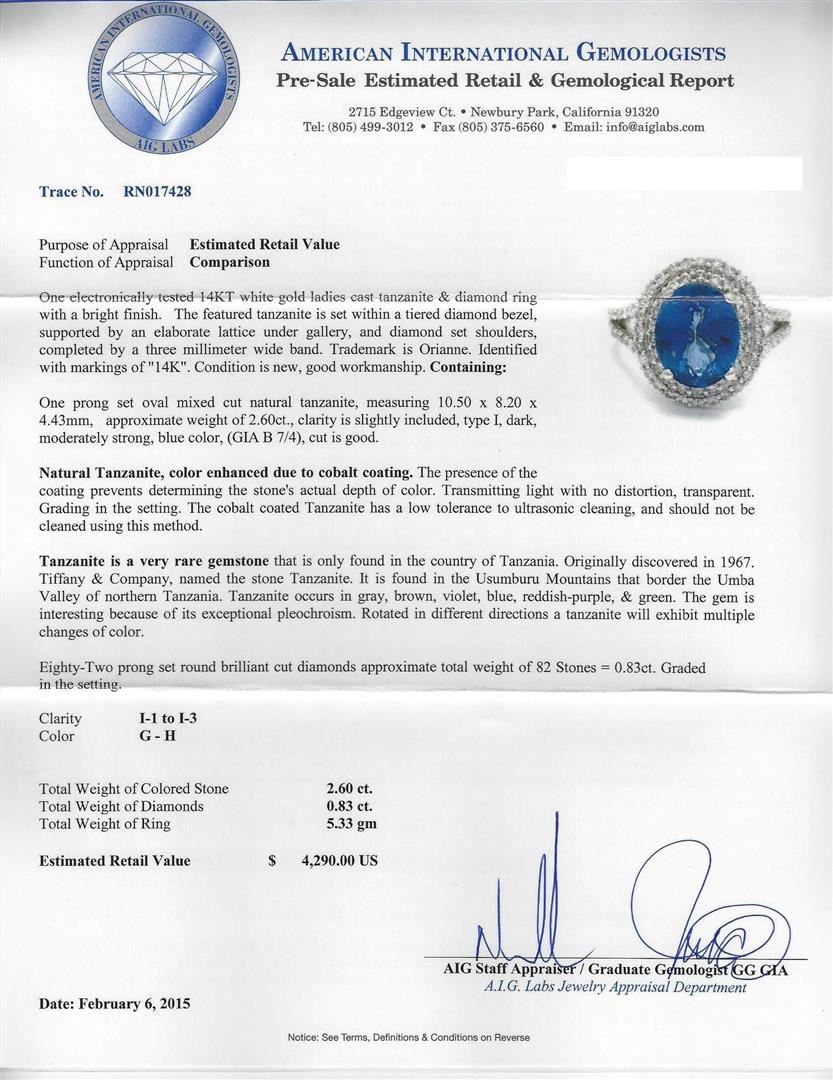 One electronically tested 14KT white gold ladies cast tanzanite & diamond ring with a bright finish. The featured tanzanite is set within a tiered diamond bezel, supported by an elaborate lattice under gallery, and diamond set shoulders, completed by a three millimeter wide band. Trademark is Orianne. Identified with markings of "14K". Condition is new, good workmanship. Containing: One prong set oval mixed cut natural tanzanite, measuring 10.50 x 8.20 x 4.43mm, approximate weight of 2.60ct., clarity is slightly included, type I, dark, moderately strong, blue color, (GIA B 7/4), cut is good. Natural Tanzanite, color enhanced due to cobalt coating. The presence of the coating prevents determining the stone's actual depth of color. Transmitting light with no distortion, transparent. Grading in the setting. The cobalt coated Tanzanite has a low tolerance to ultrasonic cleaning, and should not be cleaned using this method. Tanzanite is a very rare gemstone that is only found in the country of Tanzania. Originally discovered in 1967. Tiffany & Company, named the stone Tanzanite. It is found in the Usumburu Mountains that border the Umba Valley of northern Tanzania. Tanzanite occurs in gray, brown, violet, blue, reddish-purple, & green. The gem is interesting because of its exceptional pleochroism. Rotated in different directions a tanzanite will exhibit multiple changes of color. Eighty-Two prong set round brilliant cut diamonds approximate total weight of 82 Stones = 0.83ct. Graded in the setting. Clarity: I-1 to I-3. Color: G - H. Total Weight of Colored Stones 2.60ct. Total Weight of Diamonds 0.83ct. Total Weight of Ring 5.33 grams. AIG Appraised at $4,290.00.