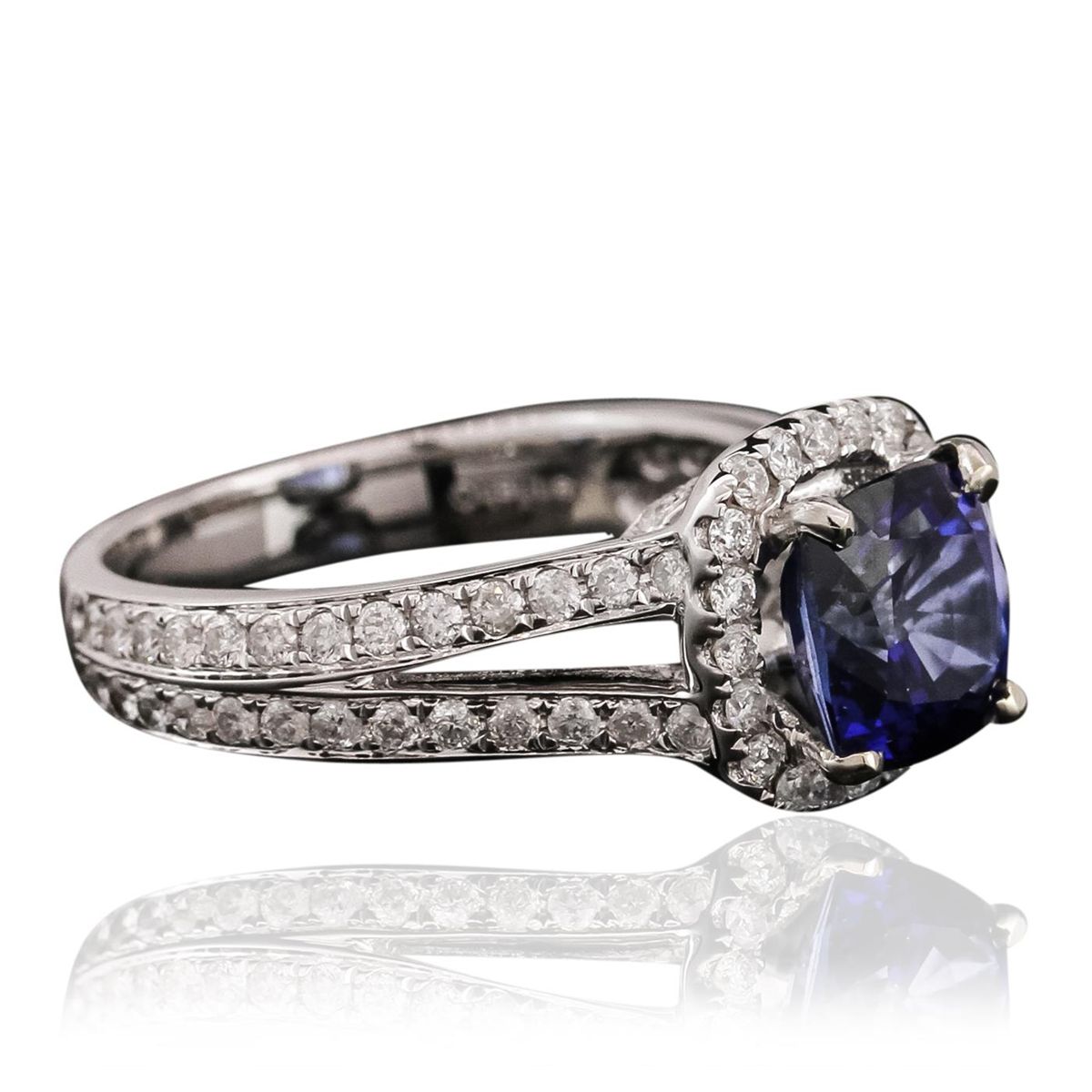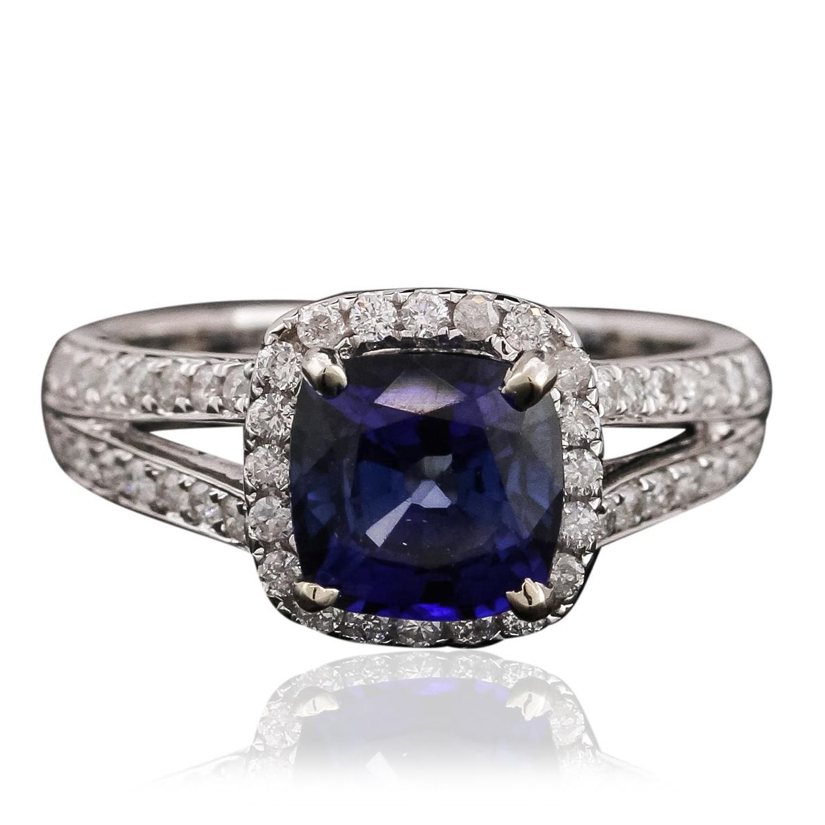 One electronically tested 14KT white gold ladies combination cast & assembled sapphire and diamond ring with a split shank with a bright polish finish. Identified with markings of "14K". Condition is new. Containing: One prong set square cushion modified brilliant cut natural blue sapphire, measuring 7.53 x 7.50 x 4.89mm, approximate weight of 2.60ct., clarity is eye clean, type II, medium, moderately strong, blue color, (GIA B 5/4), cut is good. Forty-Five prong set round brilliant cut diamonds, measuring 1.30 - 1.30 x 0.78mm (depth est.) approximate total weight of 45 Stones = 0.36ct. Clarity: I-1 to I-2. Color: I - J, Cut is Good. Colored gemstones are presumed to have been subjected to commonly used enhancement processes. All diamonds and colored gemstones are graded in the mounting, unless otherwise stated. Total Weight of Colored Stones 2.60ct. Total Weight of Diamonds 0.36ct. Total Weight of Ring 5.10 grams. GGL Appraised at $7,555.00.