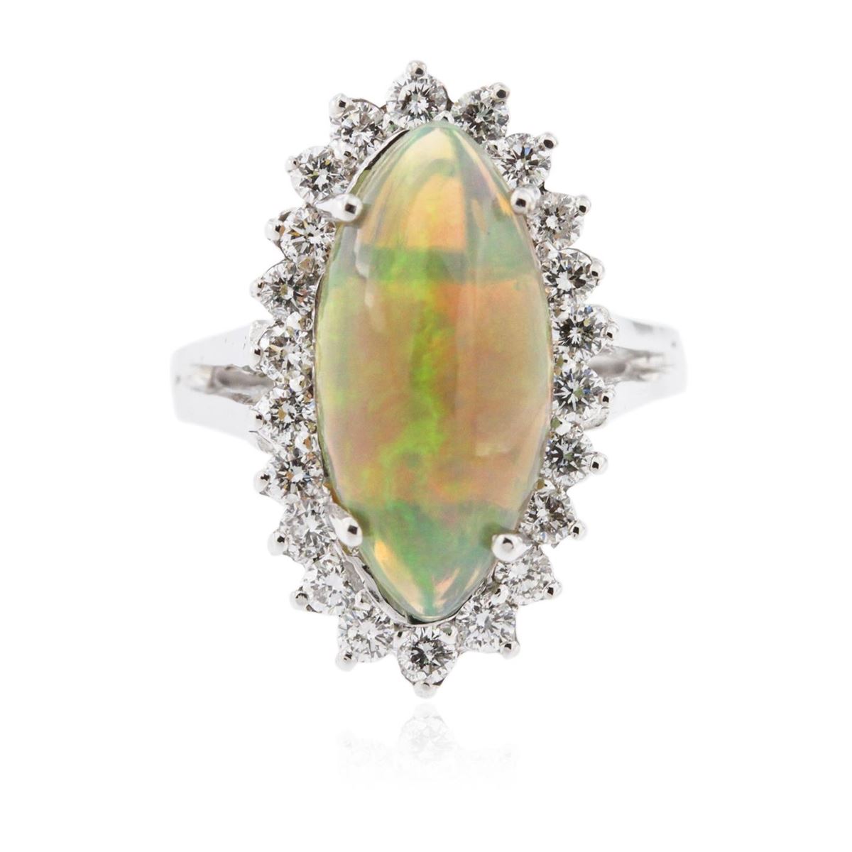 One ring featuring: 14KT white gold weighing 4.70 grams containing one opal center stone with a total weight of 2.61ct and prong set round diamonds with a total weight of 0.65ct.