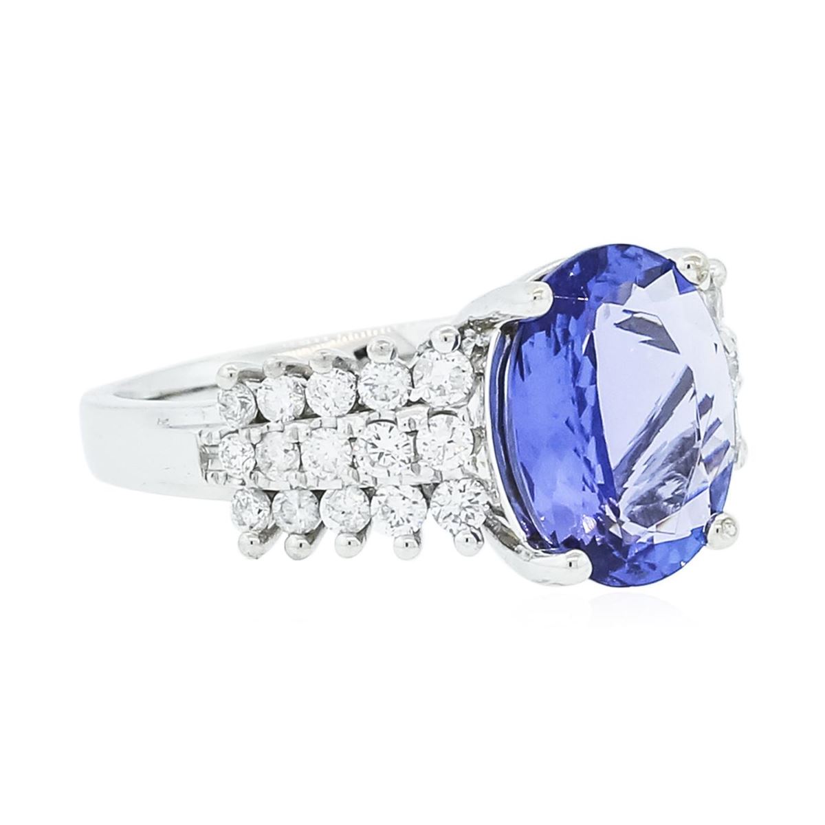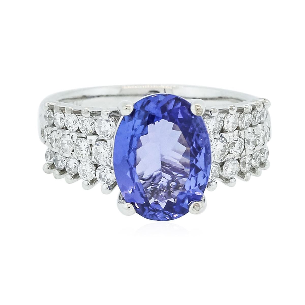 One electronically tested 14KT white gold ladies combination cast & assembled tanzanite and diamond ring with a flat shank with a bright polish finish. Identified with markings of "14K". Condition is new. Containing: One prong set oval modified brilliant cut natural tanzanite, measuring 11.40 x 8.60 x 3.90mm, approximate weight of 2.61ct., clarity is eye clean, type I, medium light, very slightly grayish, violet color, (GIA V 4/3), cut is good. Thirty prong set round brilliant cut diamonds, measuring 1.90 - 1.70 x 1.08mm (depth est.) stated total weight of 30 Stones = 0.64ct. Clarity: I-1 to I-2. Color: H - I, Cut is Good. Colored gemstones are presumed to have been subjected to commonly used enhancement processes. All diamonds and colored gemstones are graded in the mounting, unless otherwise stated total weight of Colored Stones 2.61ct. Total Weight of Diamonds 0.64ct. Total Weight of Ring 5.40 grams. GGL Appraised at $7,030.00.