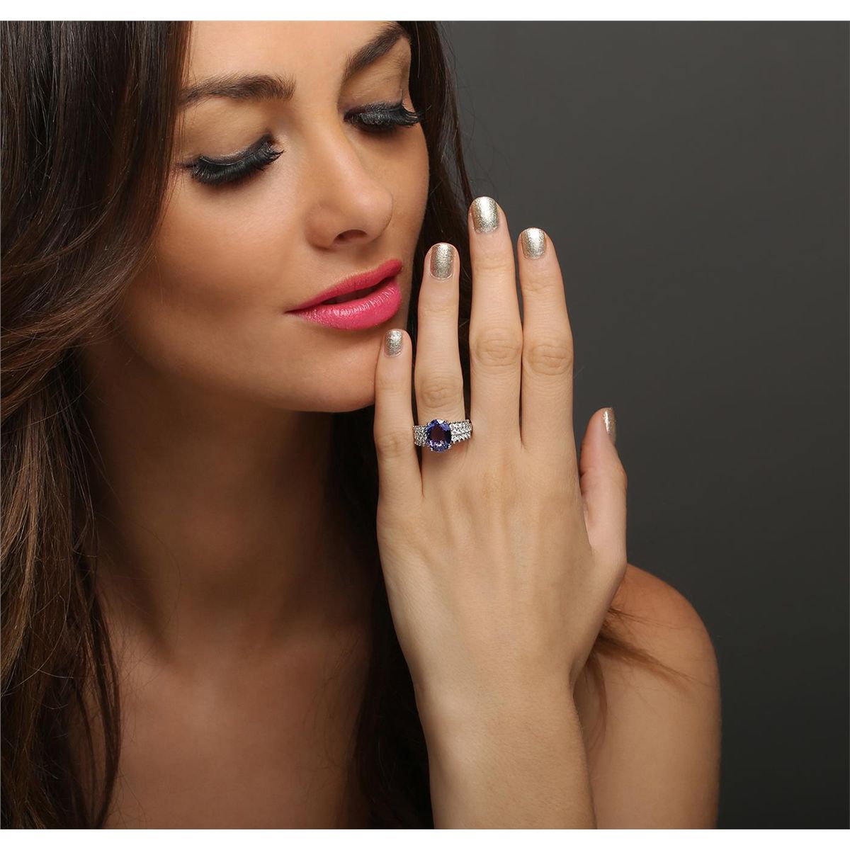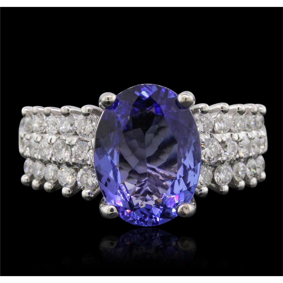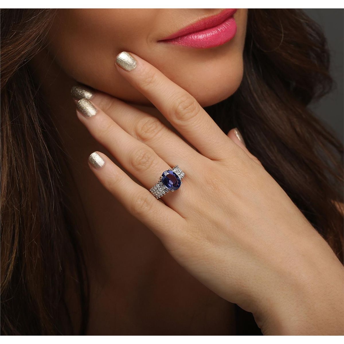 One electronically tested 14KT white gold ladies combination cast & assembled tanzanite and diamond ring with a flat shank with a bright polish finish. Identified with markings of "14K". Condition is new. Containing: One prong set oval modified brilliant cut natural tanzanite, measuring 11.40 x 8.60 x 3.90mm, approximate weight of 2.61ct., clarity is eye clean, type I, medium light, very slightly grayish, violet color, (GIA V 4/3), cut is good. Thirty prong set round brilliant cut diamonds, measuring 1.90 - 1.70 x 1.08mm (depth est.) stated total weight of 30 Stones = 0.64ct. Clarity: I-1 to I-2. Color: H - I, Cut is Good. Colored gemstones are presumed to have been subjected to commonly used enhancement processes. All diamonds and colored gemstones are graded in the mounting, unless otherwise stated total weight of Colored Stones 2.61ct. Total Weight of Diamonds 0.64ct. Total Weight of Ring 5.40 grams. GGL Appraised at $7,030.00.