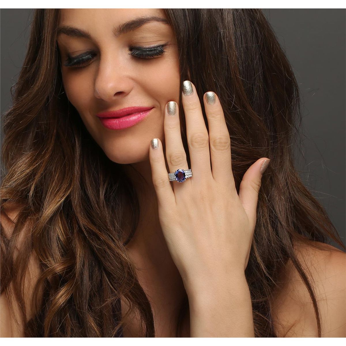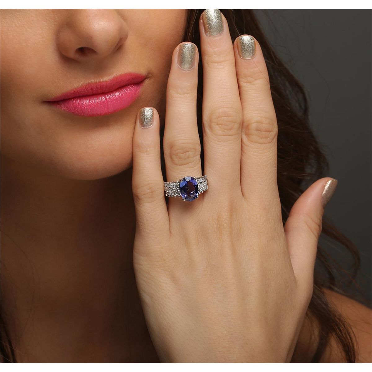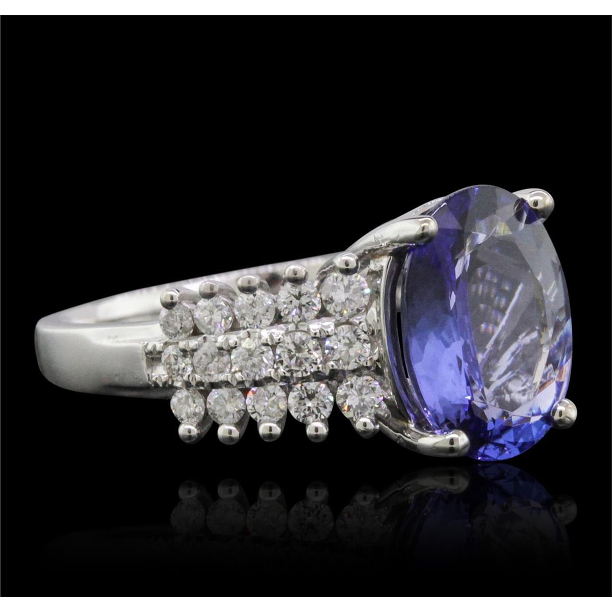 One electronically tested 14KT white gold ladies combination cast & assembled tanzanite and diamond ring with a flat shank with a bright polish finish. Identified with markings of "14K". Condition is new. Containing: One prong set oval modified brilliant cut natural tanzanite, measuring 11.40 x 8.60 x 3.90mm, approximate weight of 2.61ct., clarity is eye clean, type I, medium light, very slightly grayish, violet color, (GIA V 4/3), cut is good. Thirty prong set round brilliant cut diamonds, measuring 1.90 - 1.70 x 1.08mm (depth est.) stated total weight of 30 Stones = 0.64ct. Clarity: I-1 to I-2. Color: H - I, Cut is Good. Colored gemstones are presumed to have been subjected to commonly used enhancement processes. All diamonds and colored gemstones are graded in the mounting, unless otherwise stated total weight of Colored Stones 2.61ct. Total Weight of Diamonds 0.64ct. Total Weight of Ring 5.40 grams. GGL Appraised at $7,030.00.