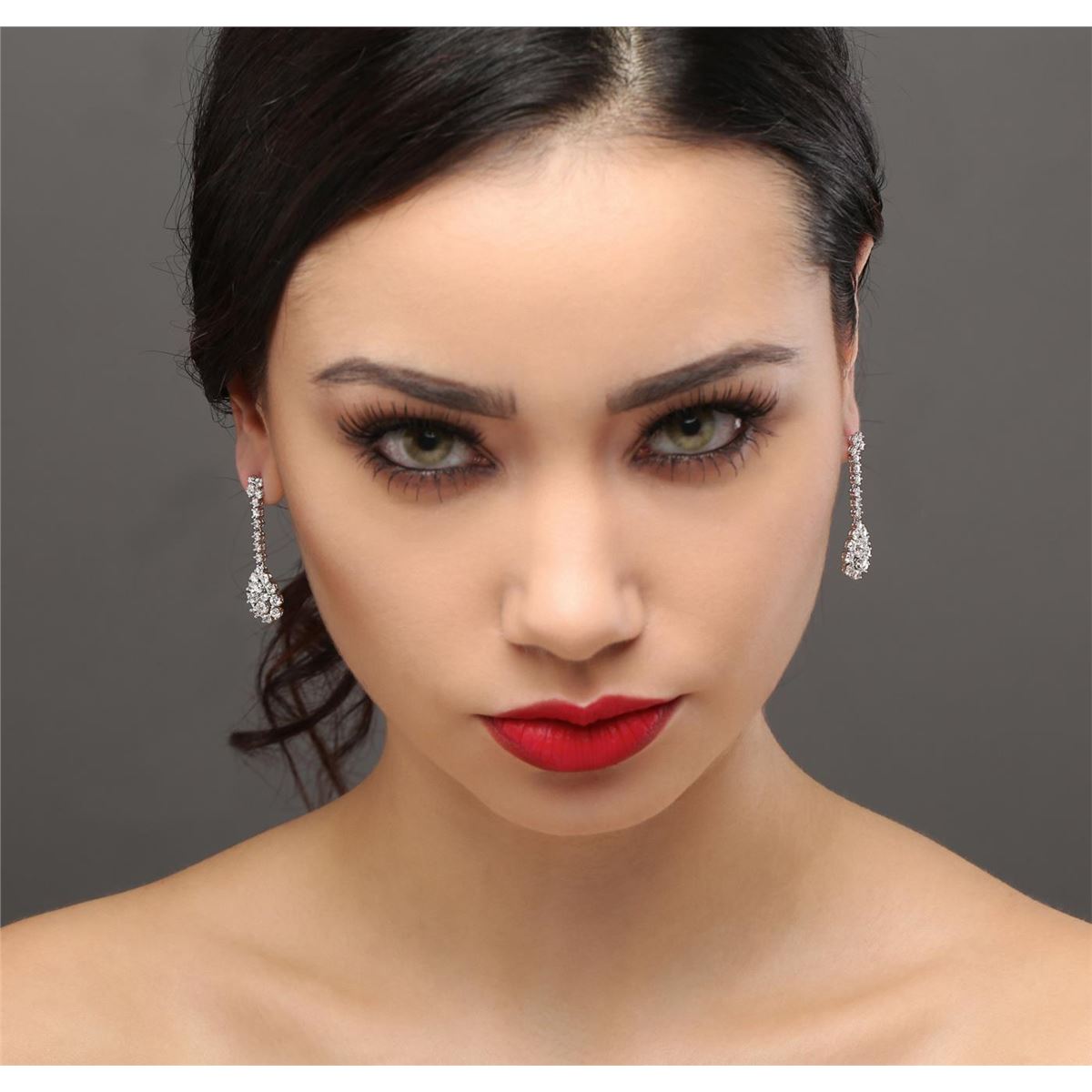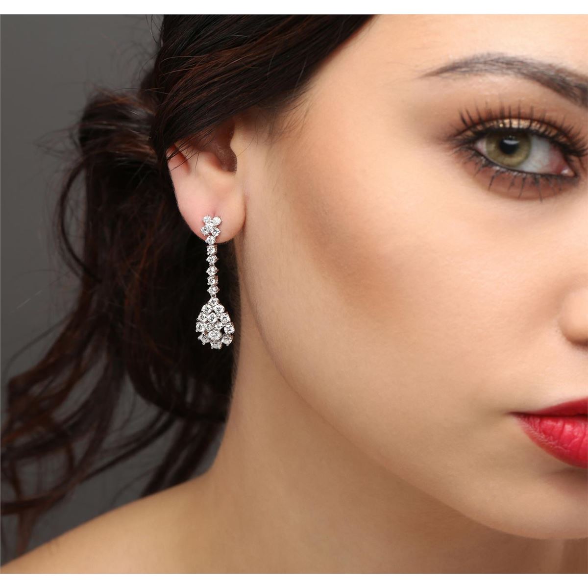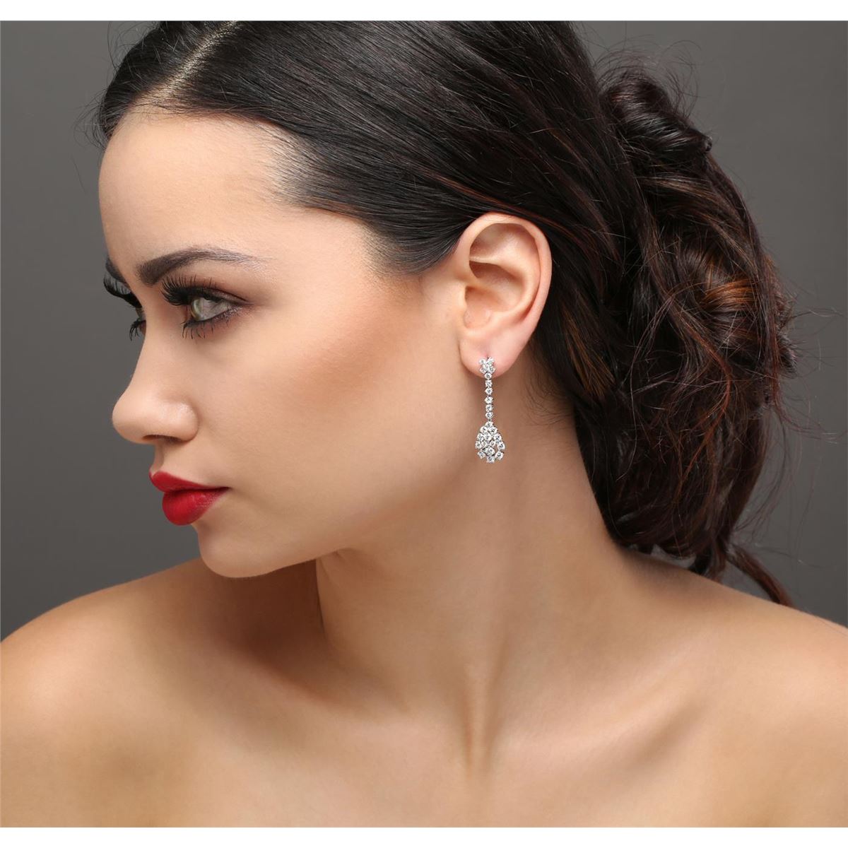 One pair electronically tested 14KT white gold ladies combination cast & assembled dangle diamond earrings with friction posts with a bright polish finish. Identified with markings of "585". Condition is new. Containing: Two prong set round brilliant cut diamonds, measuring 3.00 - 3.00 x 1.80mm (depth est.) approximate total weight of 2 Stones = 0.20ct. Clarity: SI-2. Color: J - K, Cut is Good. Twenty-Eight prong set round brilliant cut diamonds, measuring 2.80 - 2.80 x 1.68mm (depth est.) approximate total weight of 28 Stones = 2.25ct. Clarity: SI-1 to SI-2. Color: J - K, Cut is Good. Twenty prong set round brilliant cut diamonds, measuring 1.30 - 1.30 x 0.78mm (depth est.) approximate total weight of 20 Stones = 0.16ct. Clarity: SI-2 to I-1. Color: J - K, Cut is Good. All diamonds are graded in the mounting, unless otherwise stated. Total Weight of Diamonds 2.61ct. Total Weight of Earrings 6.10 grams. GGL Appraised at $6,710.00.