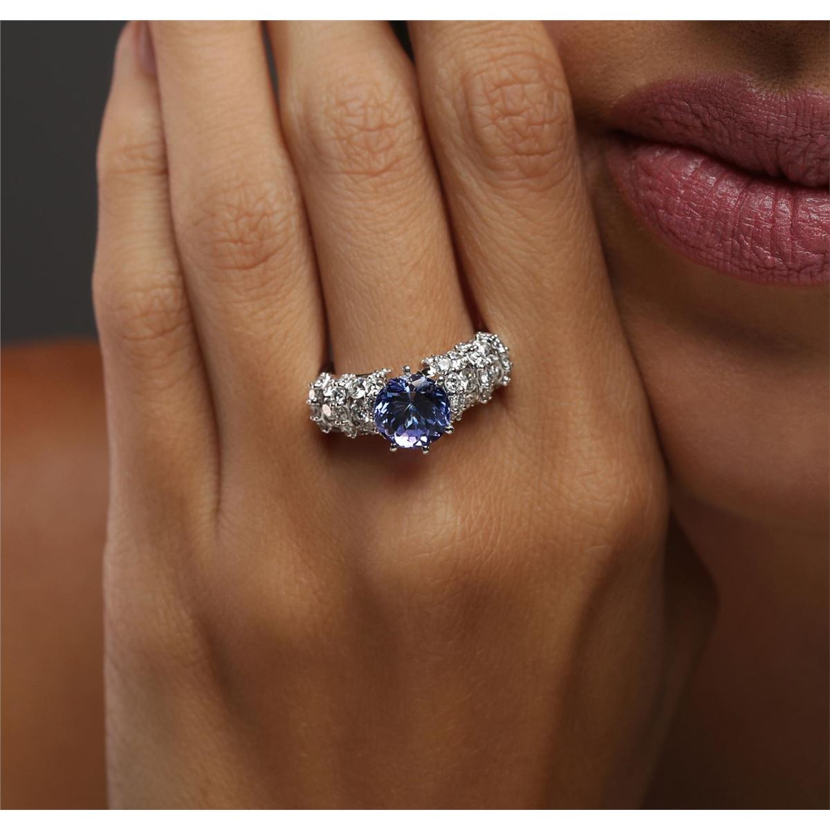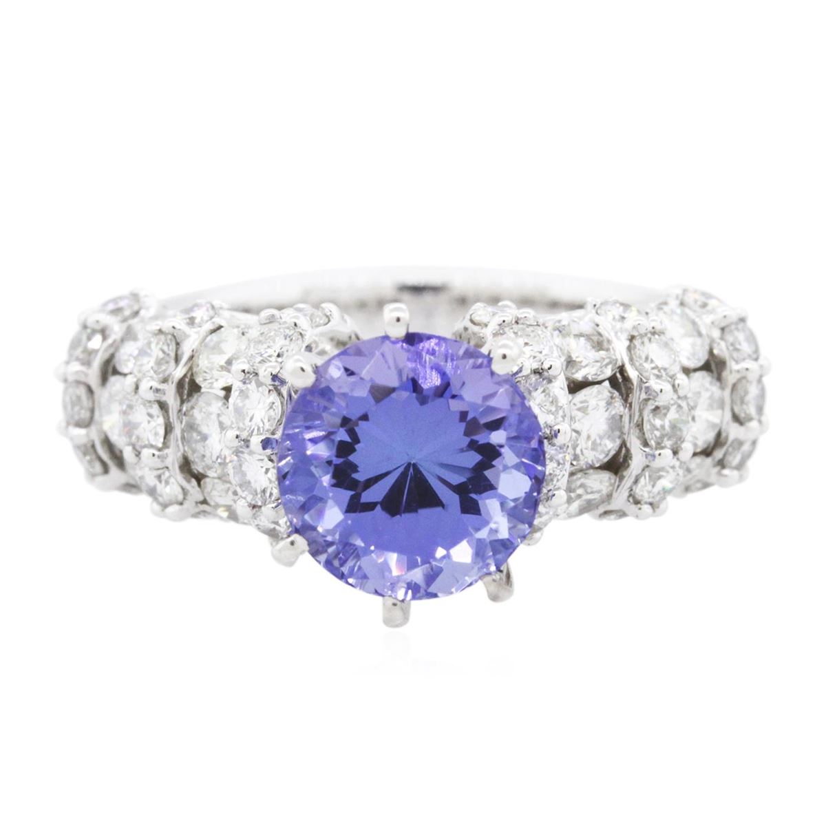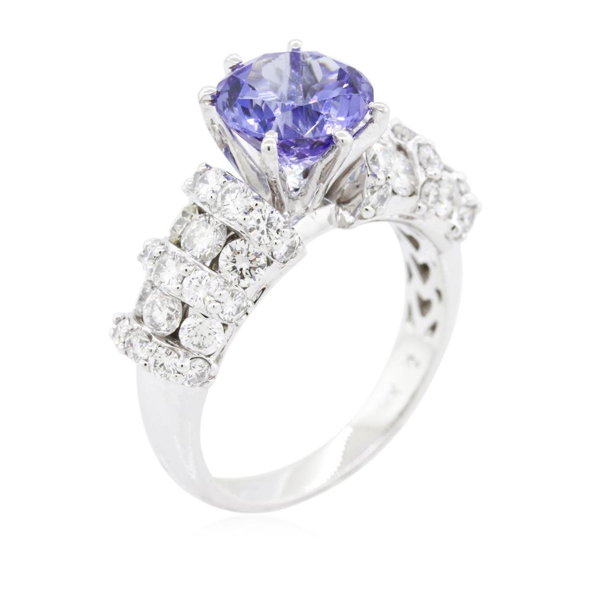One electronically tested 14KT white gold ladies combination cast & assembled tanzanite and diamond ring with a flat shank with a bright polish finish. Identified with markings of "K14". Condition is new. Containing: One prong set round modified brilliant cut natural tanzanite, measuring 8.44 - 8.44 x 5.49 mm, approximate weight of 2.62ct., clarity is eye clean, type I, medium light, moderately strong, violet color, (GIA V 4/4), cut is good. Thirty-Two prong set round brilliant cut diamonds, measuring 1.80 - 1.80 x 1.08mm (depth est.) approximate total weight of 32 Stones = 0.68ct. Clarity: SI-1 to SI-2. Color: H - I, Cut is Good. Twelve tension set round brilliant cut diamonds, measuring 2.70 - 2.50 x 1.56mm (depth est.) approximate total weight of 12 Stones = 0.77ct. Clarity: SI-1 to SI-2. Color: H - I, Cut is Very Good. Colored gemstones are presumed to have been subjected to commonly used enhancement processes. All diamonds and colored gemstones are graded in the mounting, unless otherwise stated. Total Weight of Colored Stones 2.62ct. Total Weight of Diamonds 1.45ct. Total Weight of Ring 5.80 grams. GGL Appraised at $10,215.00.