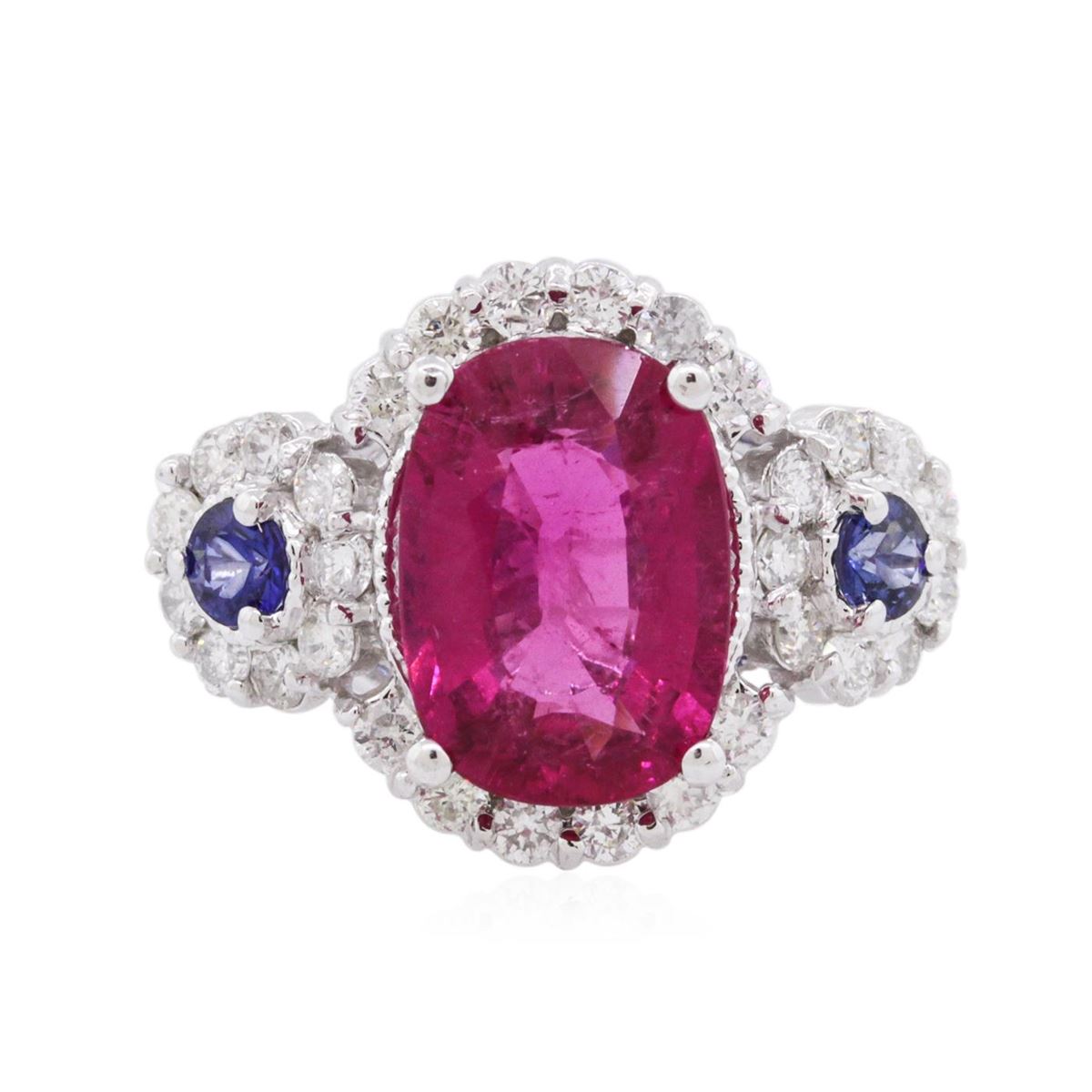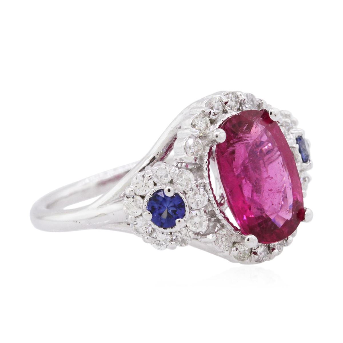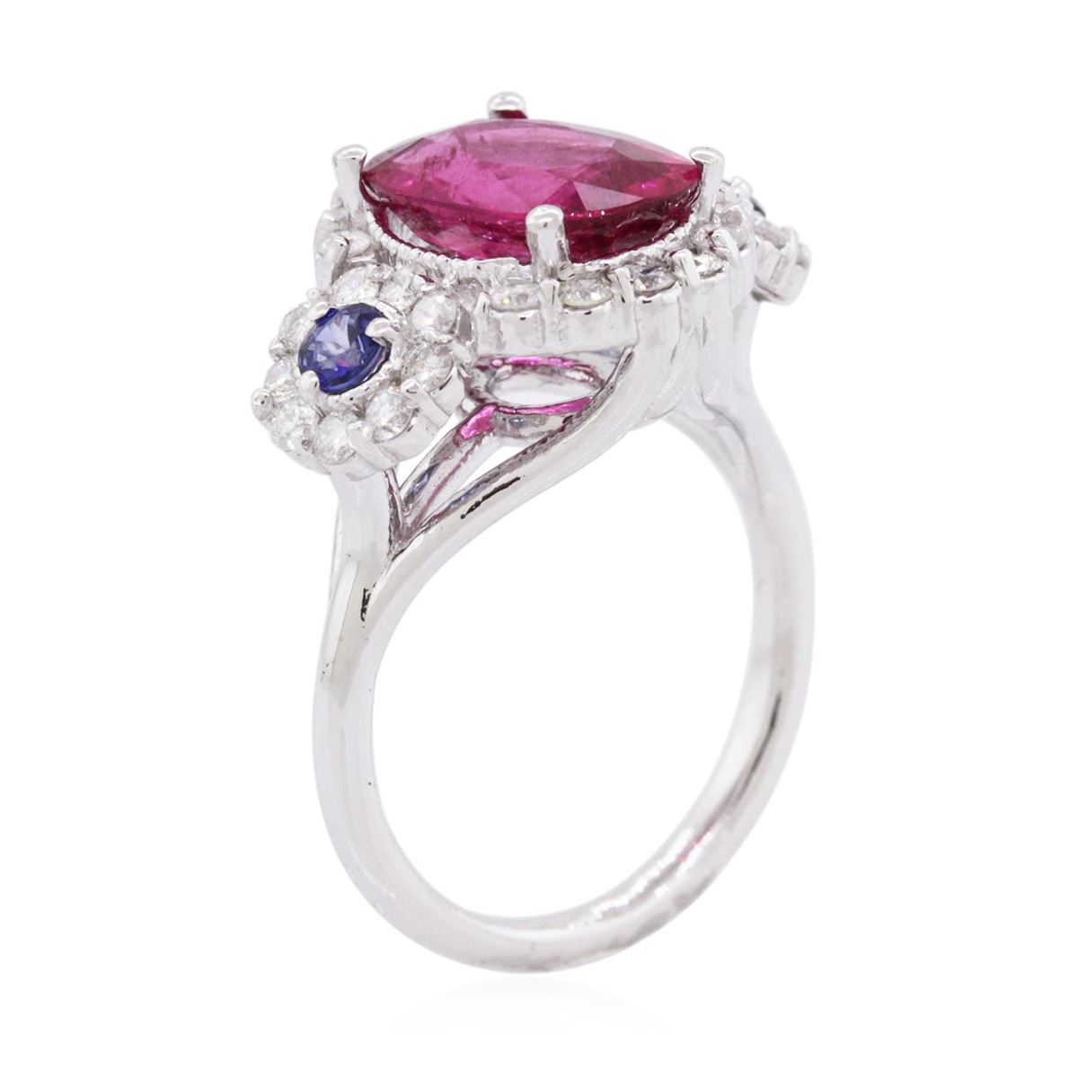 One electronically tested 14KT white gold ladies combination cast & assembled tourmaline, sapphire & diamond Ring with a half round shank with a bright polish finish. Identified with markings of "14K". Condition is new. Containing: One prong set oval modified brilliant cut natural pink tourmaline, measuring 11.20 x 7.91 x 4.60mm, approximate weight of 2.62ct., clarity is moderately included, type II, medium, moderately strong, purple red color, (GIA PR 5/4), cut is good. Two prong set round modified brilliant cut natural blue sapphires, measuring 3.20 - 3.20 x 2.08 mm, approximate total weight of 0.34ct., clarity is slightly included, type II, medium dark, moderately strong, blue color, (GIA B 6/4), cut is good. Thirty prong set round brilliant cut diamonds, measuring 1.50 - 1.50 x 0.90mm (depth est.) approximate total weight of 30 Stones = 0.37ct. Clarity: I-1. Color: I - J, Cut is Good. All diamonds and colored gemstones are graded in the mounting, unless otherwise stated. Colored gemstones are presumed to have been subjected to commonly used enhancement processes. Total Weight of Colored Stones 2.96ct. Total Weight of Diamonds 0.37ct. Total Weight of Ring 6.40 grams. GGL Appraised at $3,810.00.