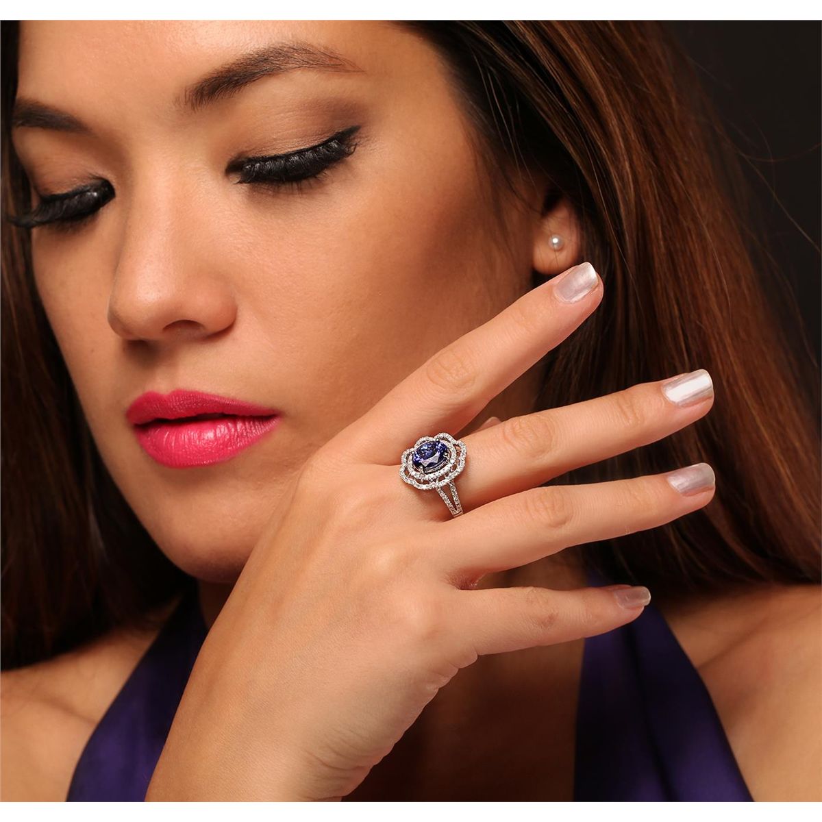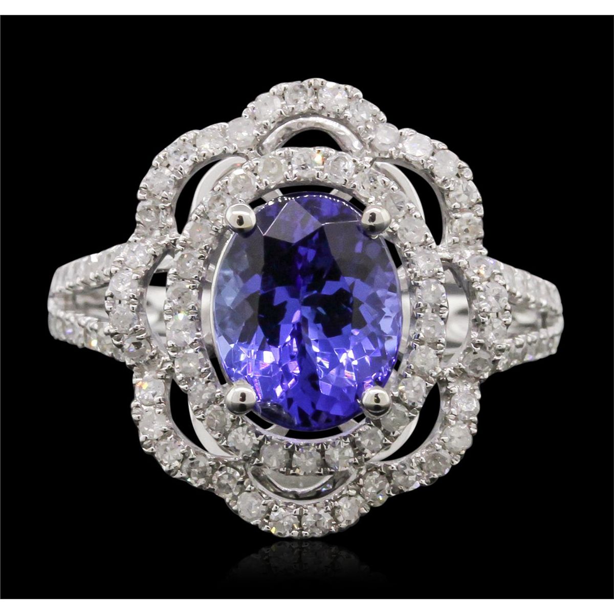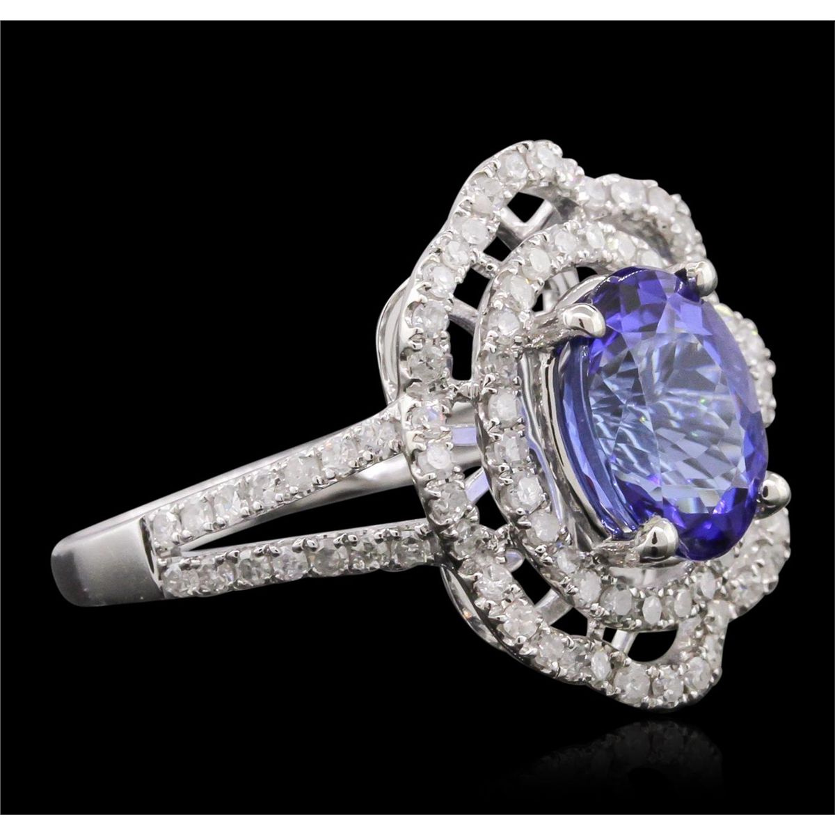 One electronically tested 14KT white gold Ladies combination cast & assembled ring with a bright polish finish. Condition is new. Identified with markings of "14K". Containing: Eighty-Six bead set single cut diamonds, measuring 1.20 - 1.20 x 0.72mm (depth est.) approximate. Total Weight of 86 Stones = 0.79ct. Clarity: I-1 to I-3. Color: I - J, Cut is Good. One prong set oval modified brilliant cut natural tanzanite, measuring 9.40 x 7.30 x 4.75mm, exact weight 2.62ct., clarity is eye clean, type I, medium light, moderately strong, bluish violet color, (GIA bV 4/4), cut is very good. Colored gemstones are presumed to have been subjected to commonly used color/clarity enhancement processes. Total Weight of Colored Stones 2.62ct. Total Weight of Diamonds 0.79ct. Total Weight of Ring 4.20 grams. GGL Appraised at $6,425.00.