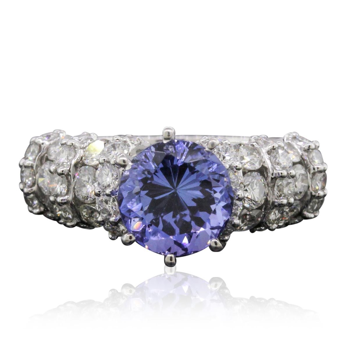 One electronically tested 14KT white gold ladies combination cast & assembled tanzanite and diamond ring with a flat shank with a bright polish finish. Identified with markings of "K14". Condition is new. Containing: One prong set round modified brilliant cut natural tanzanite, measuring 8.44 - 8.44 x 5.49 mm, approximate weight of 2.62ct., clarity is eye clean, type I, medium light, moderately strong, violet color, (GIA V 4/4), cut is good. Thirty-Two prong set round brilliant cut diamonds, measuring 1.80 - 1.80 x 1.08mm (depth est.) approximate total weight of 32 Stones = 0.68ct. Clarity: SI-1 to SI-2. Color: H - I, Cut is Good. Twelve tension set round brilliant cut diamonds, measuring 2.70 - 2.50 x 1.56mm (depth est.) approximate total weight of 12 Stones = 0.77ct. Clarity: SI-1 to SI-2. Color: H - I, Cut is Very Good. Colored gemstones are presumed to have been subjected to commonly used enhancement processes. All diamonds and colored gemstones are graded in the mounting, unless otherwise stated. Total Weight of Colored Stones 2.62ct. Total Weight of Diamonds 1.45ct. Total Weight of Ring 5.80 grams. GGL Appraised at $10,215.00.
