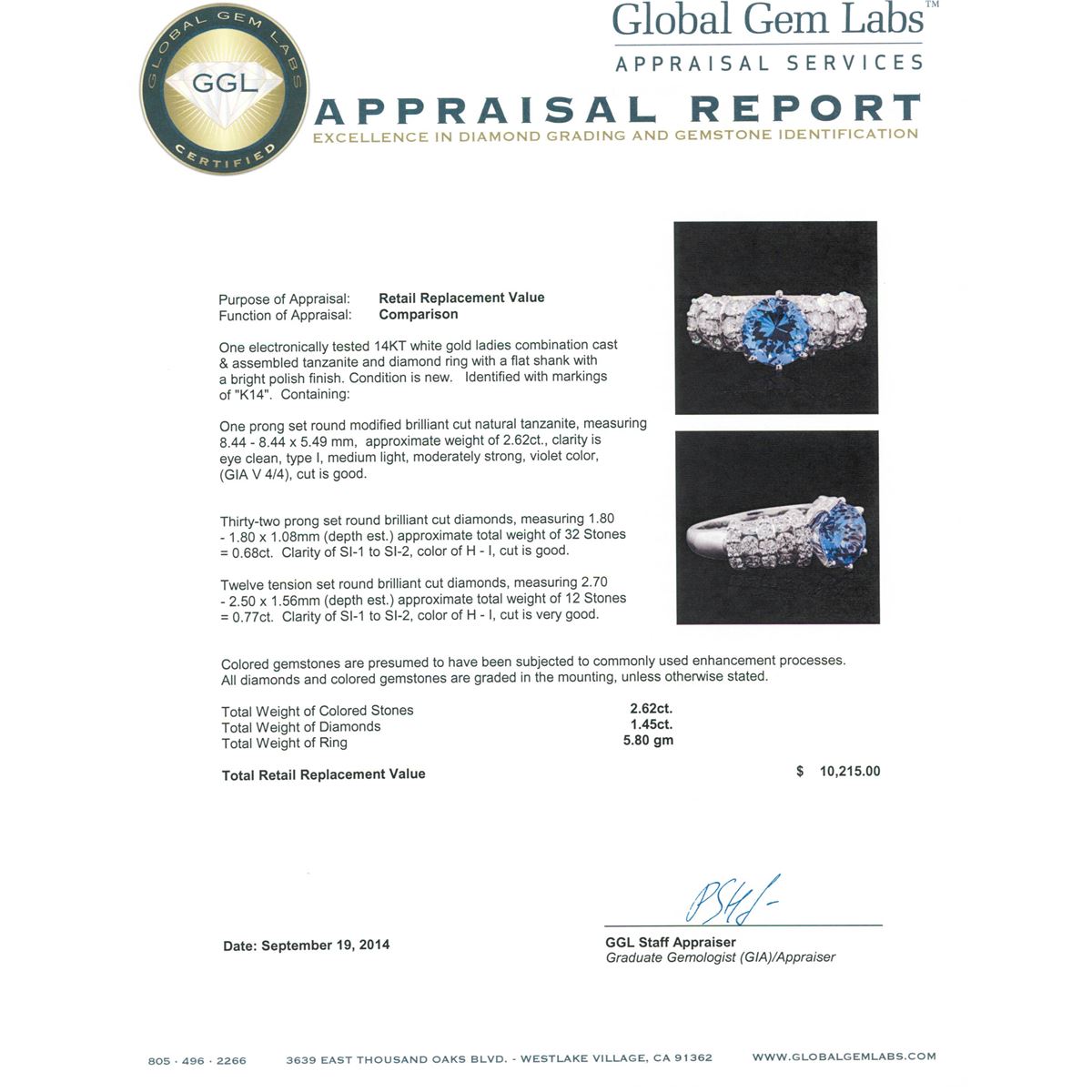 One electronically tested 14KT white gold ladies combination cast & assembled tanzanite and diamond ring with a flat shank with a bright polish finish. Identified with markings of "K14". Condition is new. Containing: One prong set round modified brilliant cut natural tanzanite, measuring 8.44 - 8.44 x 5.49 mm, approximate weight of 2.62ct., clarity is eye clean, type I, medium light, moderately strong, violet color, (GIA V 4/4), cut is good. Thirty-Two prong set round brilliant cut diamonds, measuring 1.80 - 1.80 x 1.08mm (depth est.) approximate total weight of 32 Stones = 0.68ct. Clarity: SI-1 to SI-2. Color: H - I, Cut is Good. Twelve tension set round brilliant cut diamonds, measuring 2.70 - 2.50 x 1.56mm (depth est.) approximate total weight of 12 Stones = 0.77ct. Clarity: SI-1 to SI-2. Color: H - I, Cut is Very Good. Colored gemstones are presumed to have been subjected to commonly used enhancement processes. All diamonds and colored gemstones are graded in the mounting, unless otherwise stated. Total Weight of Colored Stones 2.62ct. Total Weight of Diamonds 1.45ct. Total Weight of Ring 5.80 grams. GGL Appraised at $10,215.00.