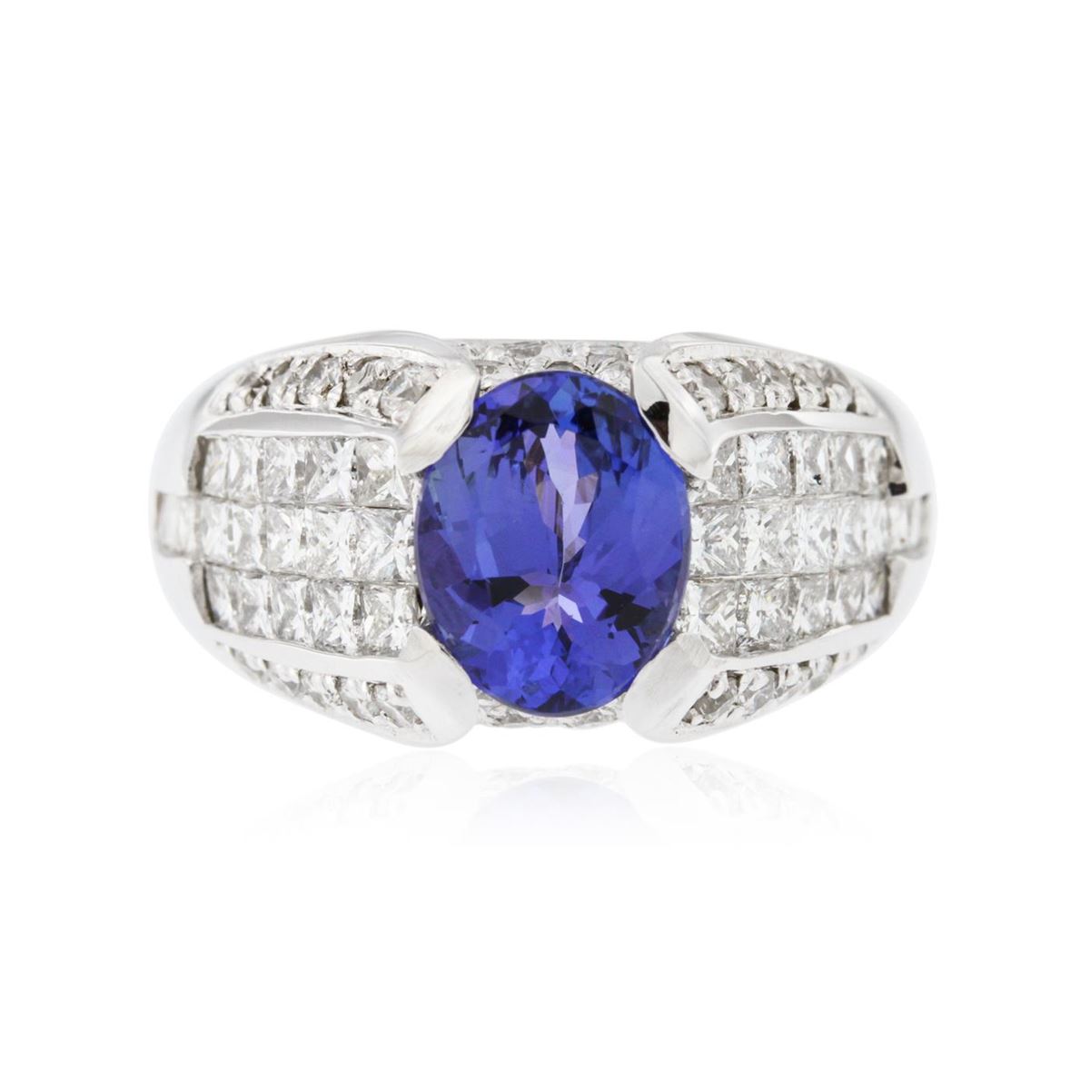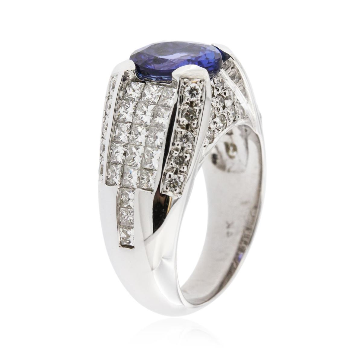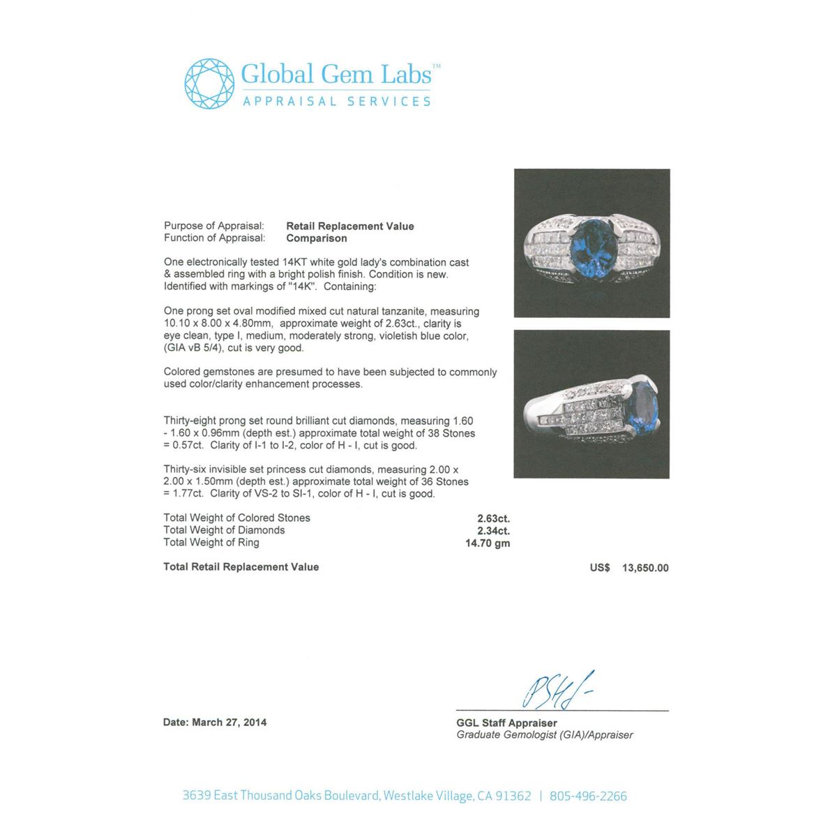 One electronically tested 14KT white gold Ladies combination cast & assembled ring with a bright polish finish. Condition is new. Identified with markings of "14K". Containing: One prong set oval modified mixed cut natural tanzanite, measuring 10.10 x 8.00. x 4.80mm, approximate weight of 2.63ct., clarity is eye clean, type I, medium, moderately strong, violetish blue color, (GIA vB 5/4), cut is very good. Colored gemstones are presumed to have been subjected to commonly used color/clarity enhancement processes. Thirty-Eight prong set round brilliant cut diamonds, measuring 1.60 - 1.60 x 0.96mm (depth est.) approximate. Total Weight of 38 Stones = 0.57ct. Clarity: I-1 to I-2. Color: H - I, Cut is Good. Thirty-Six invisible set princess cut diamonds, measuring 2.00. x 2.00. x 1.50mm (depth est.) approximate. Total Weight of 36 Stones = 1.77ct. Clarity: VS-2 to SI-1. Color: H - I, Cut is Good. Total Weight of Colored Stones 2.63ct. Total Weight of Diamonds 2.34ct. Total Weight of Ring 14.70 grams. GGL Appraised at $13,650.00.