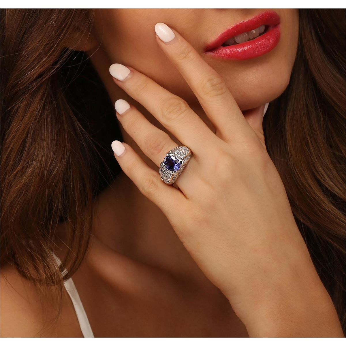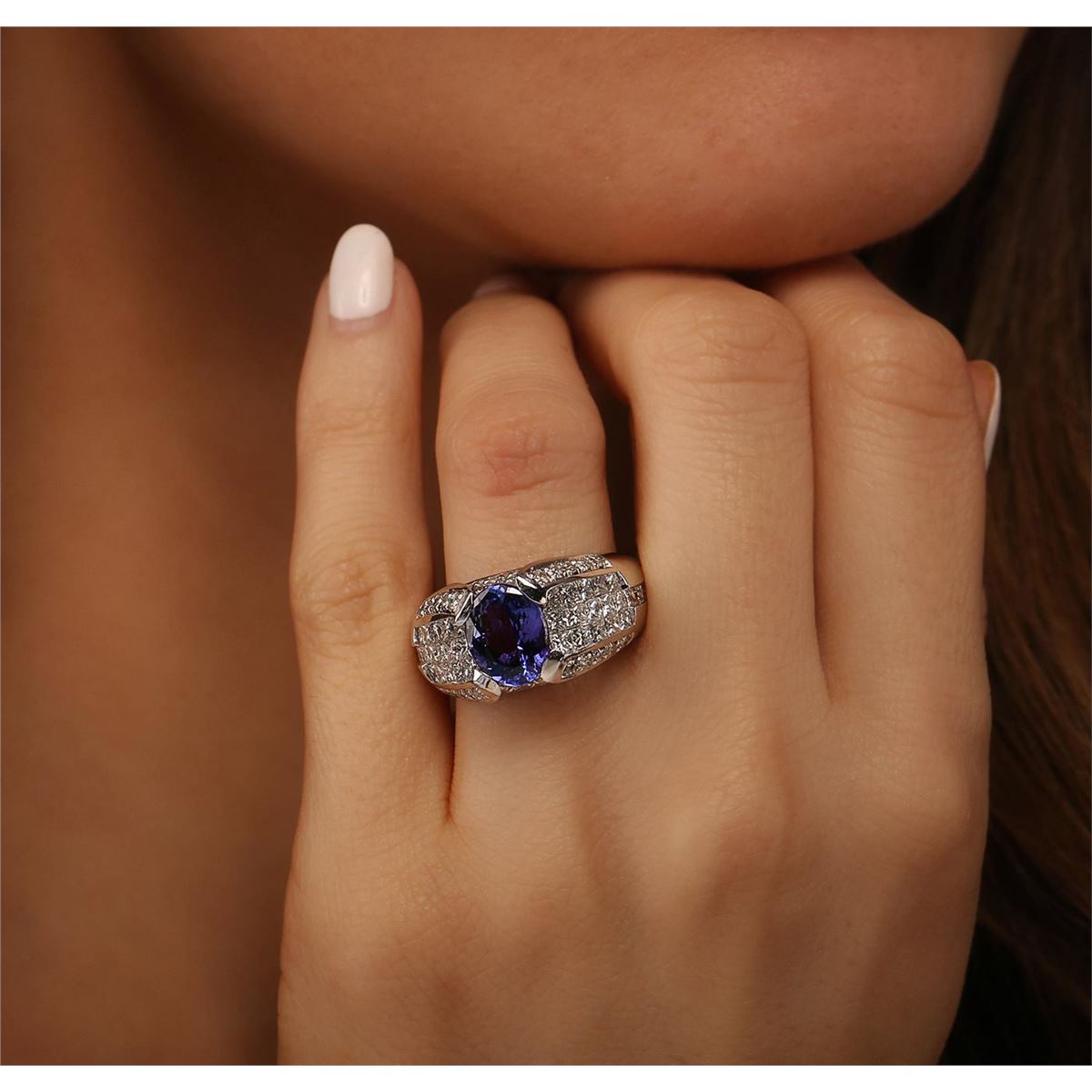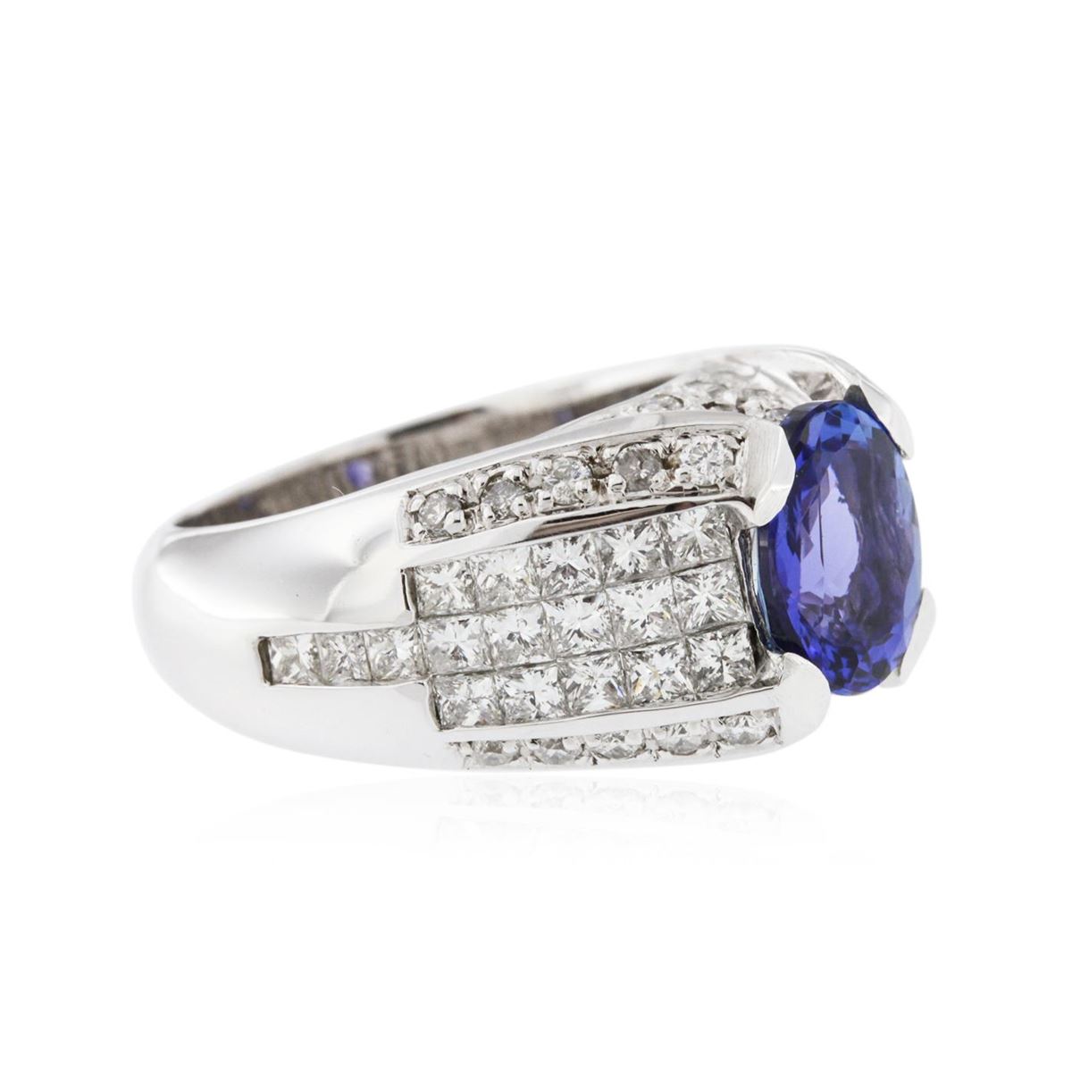 One electronically tested 14KT white gold Ladies combination cast & assembled ring with a bright polish finish. Condition is new. Identified with markings of "14K". Containing: One prong set oval modified mixed cut natural tanzanite, measuring 10.10 x 8.00. x 4.80mm, approximate weight of 2.63ct., clarity is eye clean, type I, medium, moderately strong, violetish blue color, (GIA vB 5/4), cut is very good. Colored gemstones are presumed to have been subjected to commonly used color/clarity enhancement processes. Thirty-Eight prong set round brilliant cut diamonds, measuring 1.60 - 1.60 x 0.96mm (depth est.) approximate. Total Weight of 38 Stones = 0.57ct. Clarity: I-1 to I-2. Color: H - I, Cut is Good. Thirty-Six invisible set princess cut diamonds, measuring 2.00. x 2.00. x 1.50mm (depth est.) approximate. Total Weight of 36 Stones = 1.77ct. Clarity: VS-2 to SI-1. Color: H - I, Cut is Good. Total Weight of Colored Stones 2.63ct. Total Weight of Diamonds 2.34ct. Total Weight of Ring 14.70 grams. GGL Appraised at $13,650.00.