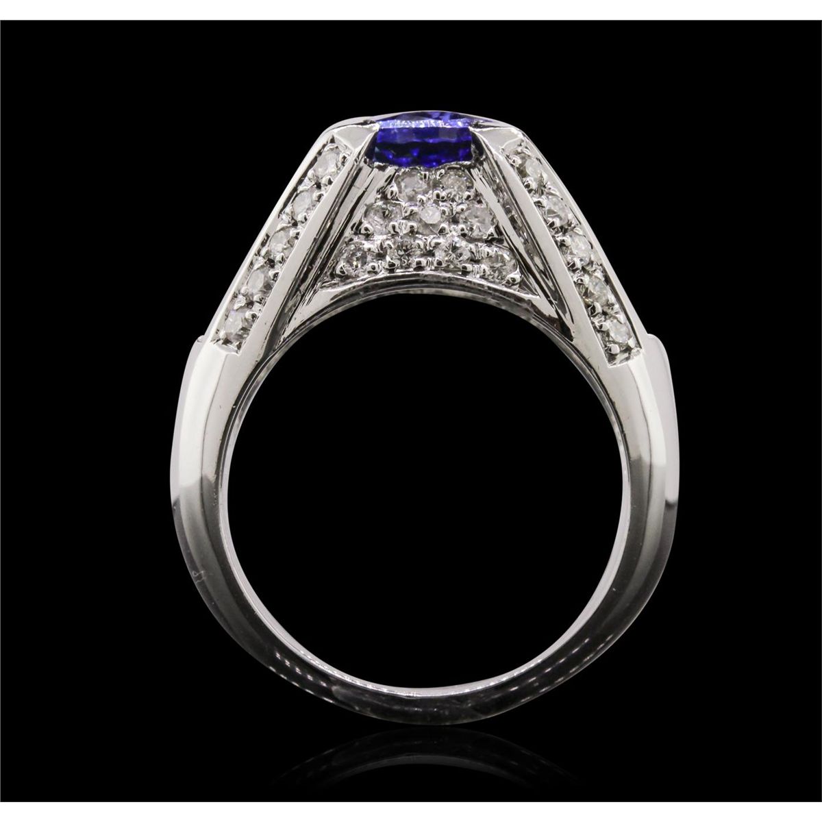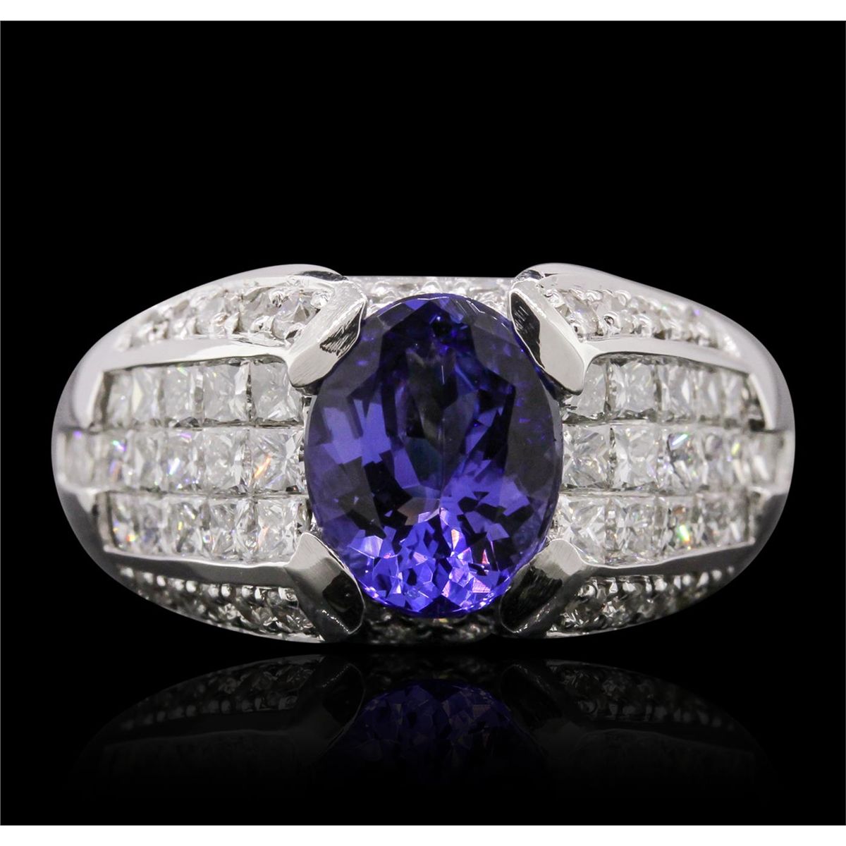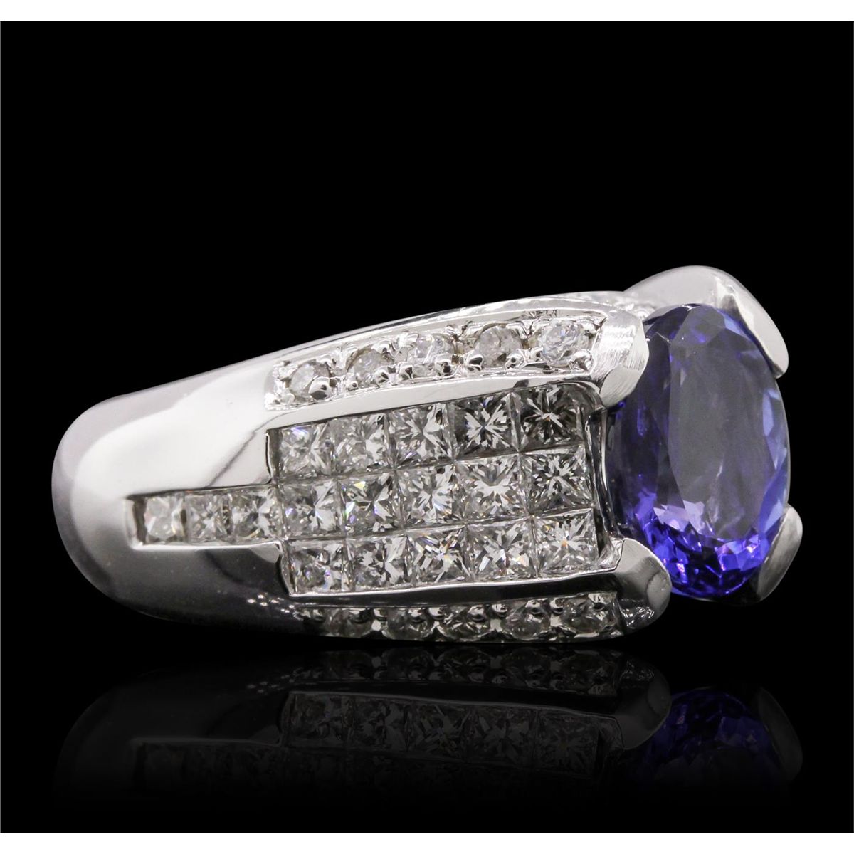 One electronically tested 14KT white gold Ladies combination cast & assembled ring with a bright polish finish. Condition is new. Identified with markings of "14K". Containing: One prong set oval modified mixed cut natural tanzanite, measuring 10.10 x 8.00. x 4.80mm, approximate weight of 2.63ct., clarity is eye clean, type I, medium, moderately strong, violetish blue color, (GIA vB 5/4), cut is very good. Colored gemstones are presumed to have been subjected to commonly used color/clarity enhancement processes. Thirty-Eight prong set round brilliant cut diamonds, measuring 1.60 - 1.60 x 0.96mm (depth est.) approximate. Total Weight of 38 Stones = 0.57ct. Clarity: I-1 to I-2. Color: H - I, Cut is Good. Thirty-Six invisible set princess cut diamonds, measuring 2.00. x 2.00. x 1.50mm (depth est.) approximate. Total Weight of 36 Stones = 1.77ct. Clarity: VS-2 to SI-1. Color: H - I, Cut is Good. Total Weight of Colored Stones 2.63ct. Total Weight of Diamonds 2.34ct. Total Weight of Ring 14.70 grams. GGL Appraised at $13,650.00.