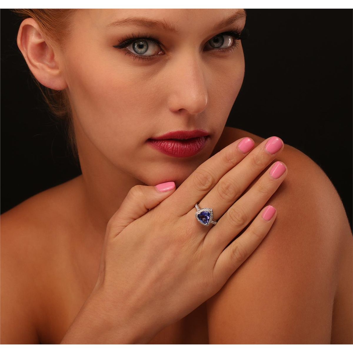 One electronically tested 14KT white gold ladies cast tanzanite and diamond ring with a bright polish finish. The featured tanzanite is set within a diamond bezel supported by diamond set shoulders, completed by a two millimeter wide band. Trademark is Orianne. Identified with markings of "14K". Condition is new, good workmanship. Containing: One prong set triangle mixed cut natural tanzanite, measuring 9.60 x 9.50 x 4.60mm, approximate weight of 2.63ct., clarity is eye clean, type I, medium dark, moderately strong, violetish blue color, (GIA vB 6/4), cut is good. Transmitting light with no distortion, transparent. Graded in the setting.Tanzanite is a very rare gemstone that is only found in the country of Tanzania. Originally discovered in 1967. Tiffany & Company, named the stone Tanzanite. It is found in the Usumburu Mountains that border the Umba Valley of northern Tanzania. Tanzanite occurs in gray, brown, violet, blue, reddish-purple, & green. The gem is interesting because of its exceptional pleochroism. Rotated in different directions a tanzanite will exhibit multiple changes of color. Tanzanite has a low tolerance to ultrasonic cleaning, and should not be cleaned using this method. Thirty-Two prong set round brilliant cut diamonds, measuring 1.50 - 1.40 x 0.87mm (depth est.) approximate. Total Weight of 32 Stones = 0.45ct. Graded in the setting. Clarity: I-1 to I-2 . Color: G - I. Total Weight of Colored Stones 2.63ct. Total Weight of Diamonds 0.45ct. Total Weight of Ring 5.38gm. AIG Appraised at $8,225.00.