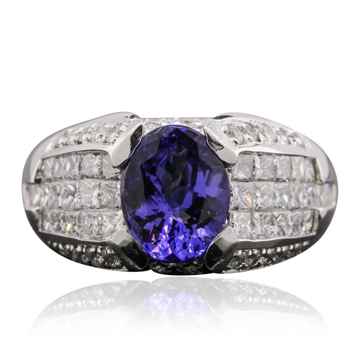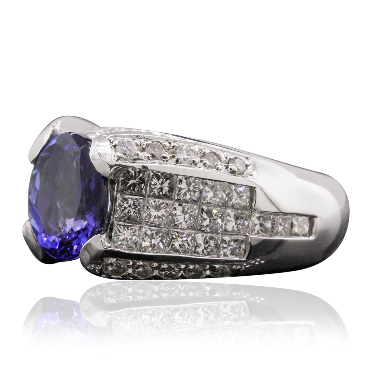 One electronically tested 14KT white gold Ladies combination cast & assembled ring with a bright polish finish. Condition is new. Identified with markings of "14K". Containing: One prong set oval modified mixed cut natural tanzanite, measuring 10.10 x 8.00. x 4.80mm, approximate weight of 2.63ct., clarity is eye clean, type I, medium, moderately strong, violetish blue color, (GIA vB 5/4), cut is very good. Colored gemstones are presumed to have been subjected to commonly used color/clarity enhancement processes. Thirty-Eight prong set round brilliant cut diamonds, measuring 1.60 - 1.60 x 0.96mm (depth est.) approximate. Total Weight of 38 Stones = 0.57ct. Clarity: I-1 to I-2. Color: H - I, Cut is Good. Thirty-Six invisible set princess cut diamonds, measuring 2.00. x 2.00. x 1.50mm (depth est.) approximate. Total Weight of 36 Stones = 1.77ct. Clarity: VS-2 to SI-1. Color: H - I, Cut is Good. Total Weight of Colored Stones 2.63ct. Total Weight of Diamonds 2.34ct. Total Weight of Ring 14.70 grams. GGL Appraised at $13,650.00.