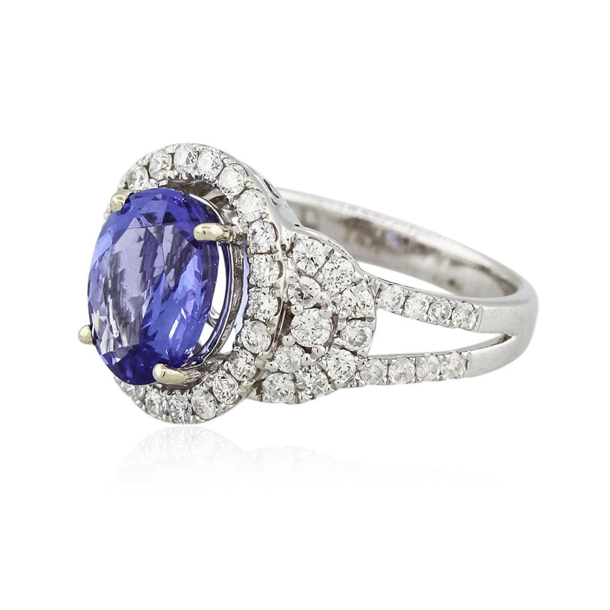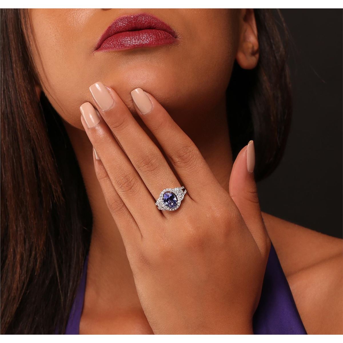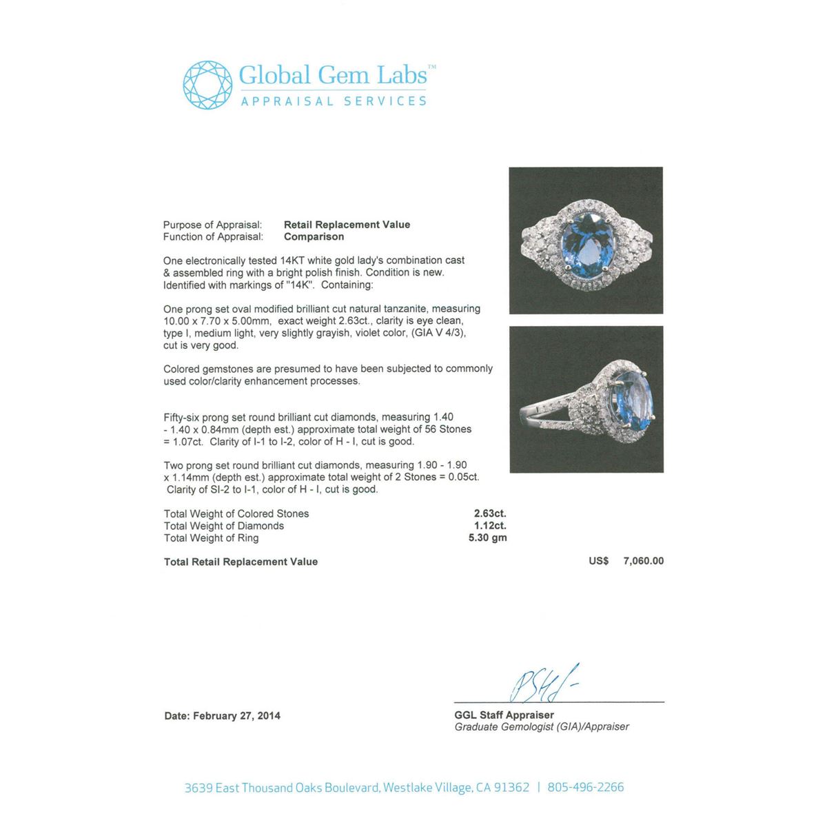 One electronically tested 14KT white gold Ladies combination cast & assembled ring with a bright polish finish. Condition is new. Identified with markings of "14K". Containing: One prong set oval modified brilliant cut natural tanzanite, measuring 10.00 x 7.70 x 5.00mm, exact weight 2.63ct., clarity is eye clean, type I, medium light, very slightly grayish, violet color, (GIA V 4/3), cut is very good. Colored gemstones are presumed to have been subjected to commonly used color/clarity enhancement processes. Fifty-Six prong set round brilliant cut diamonds, measuring 1.40 - 1.40 x 0.84mm (depth est.) approximate. Total Weight of 56 Stones = 1.07ct. Clarity: I-1 to I-2. Color: H - I, Cut is Good. Two prong set round brilliant cut diamonds, measuring 1.90 - 1.90 x 1.14mm (depth est.) approximate. Total Weight of 2 Stones = 0.05ct. Clarity: SI-2 to I-1. Color: H - I, Cut is Good. Total Weight of Colored Stones 2.63ct. Total Weight of Diamonds 1.12ct. Total Weight of Ring 5.30 grams. GGL Appraised at $7,060.00.