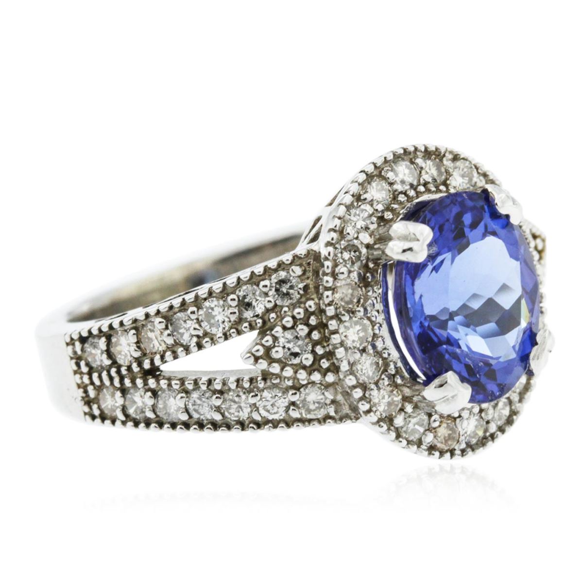 One electronically tested 14KT white gold Ladies combination cast & assembled ring with a bright polish finish. Condition is new. Identified with markings of "K14". Containing: One prong set oval modified brilliant cut natural tanzanite, measuring 9.40 x 8.00 x 5.20mm, approximate weight of 2.64ct., clarity is eye clean, type I, medium, moderately strong, bluish violet color, (GIA bV 5/4), cut is good. Colored gemstones are presumed to have been subjected to commonly used color/clarity enhancement processes. Fifty-One prong set round brilliant cut diamonds, measuring 1.50 - 1.50 x 0.90mm (depth est.) approximate. Total Weight of 51 Stones = 0.63ct. Clarity: I-1 to I-2. Color: I - J, Cut is Good. Total Weight of Colored Stones 2.64ct. Total Weight of Diamonds 0.63ct. Total Weight of Ring 7.20 grams. GGL Appraised at $6,955.00.