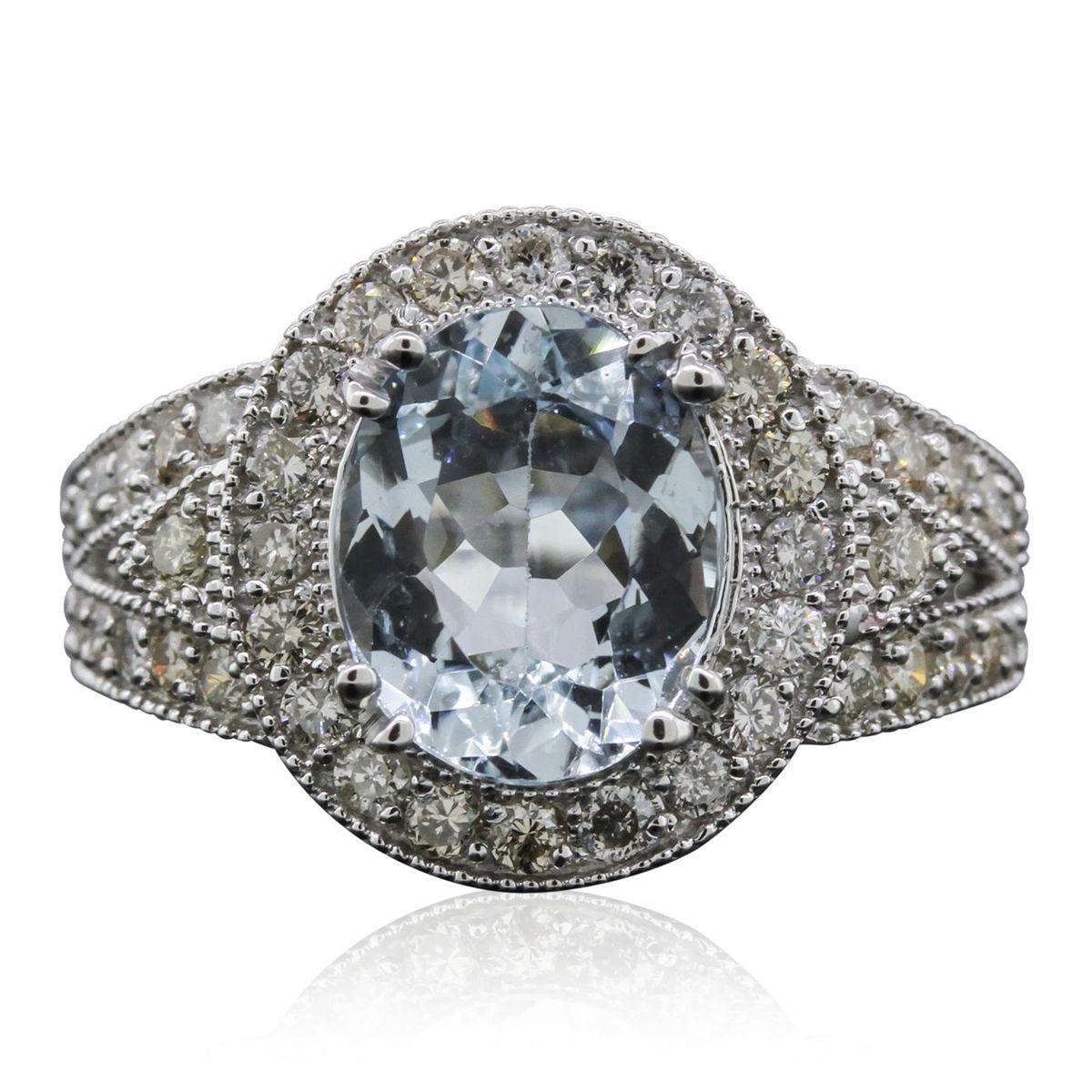 One electronically tested 14KT white gold ladies cast aquamarine and diamond ring. Condition is new, good workmanship. The featured aquamarine is set within a diamond lattice gallery, supported by diamond set split shoulders and completed by a three and one-half millimeter wide band. Bright polish finish with milgrain detailing throughout. Identified with markings of "K14". Containing: One prong set oval mixed cut natural aquamarine, measuring 10.65 x 8.50 x 4.90mm, 8%. bulge factor, approximate weight of 2.64ct., clarity is eye clean, type I, medium, very slightly grayish, blue color, (GIA B 5/3), cut is good. Transmitting light with no distortion, transparent. Refractive index testing results of 1.56 to 1.57. This is a conclusive result for Aquamarine (Beryl). Graded in the setting. Forty-Six bead set round brilliant cut diamonds, measuring 1.80 - 1.80 x 1.08mm (depth est.) approximate. Total Weight of 46 Stones = 1.08ct. Graded in the setting. Clarity: SI-1 to I-1. Color: K - M. Total Weight of Colored Stones 2.64ct. Total Weight of Diamonds 1.08ct. Total Weight of Ring 7.40 grams. AIG Appraised at $5,100.00.