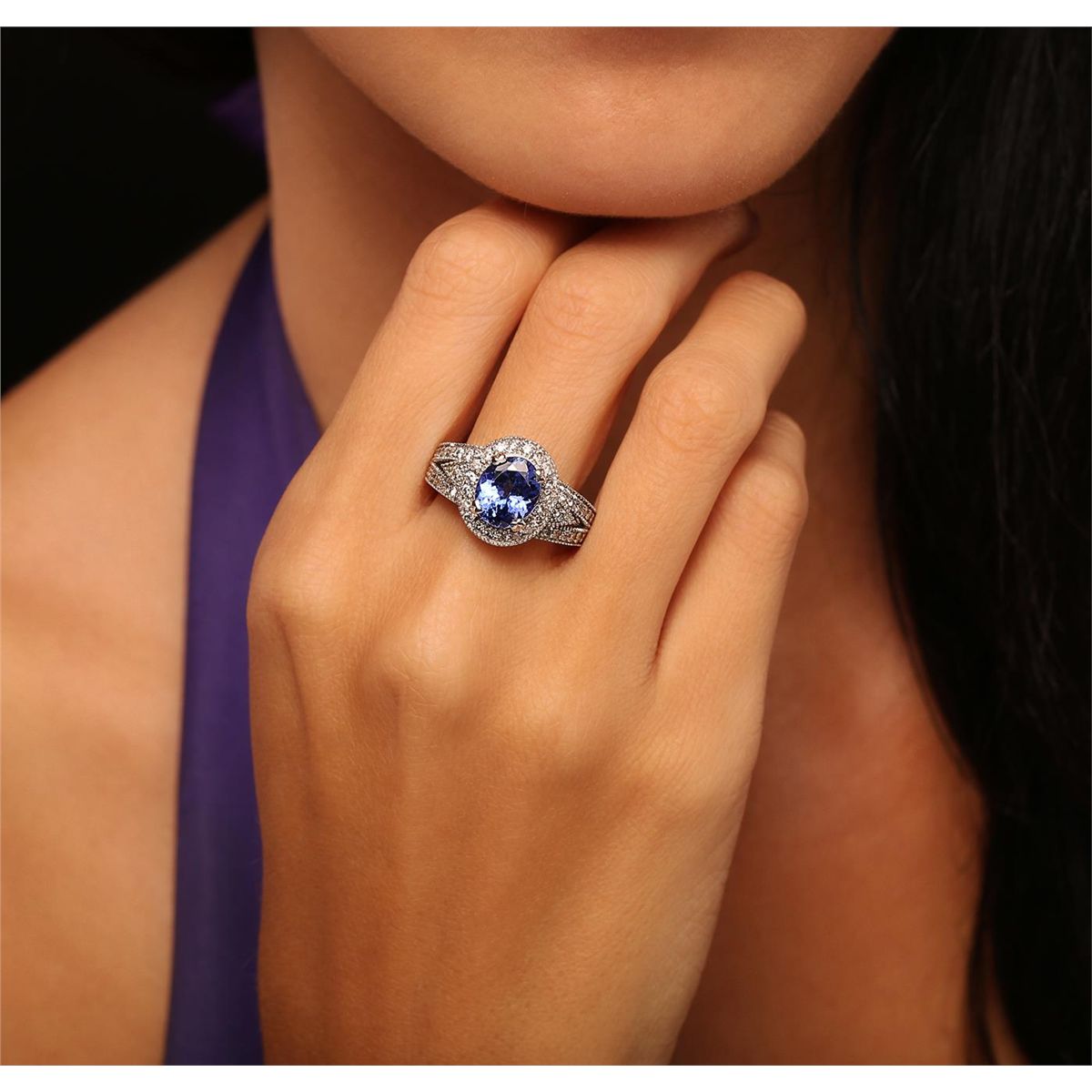 One electronically tested 14KT white gold Ladies combination cast & assembled ring with a bright polish finish. Condition is new. Identified with markings of "K14". Containing: One prong set oval modified brilliant cut natural tanzanite, measuring 9.40 x 8.00 x 5.20mm, approximate weight of 2.64ct., clarity is eye clean, type I, medium, moderately strong, bluish violet color, (GIA bV 5/4), cut is good. Colored gemstones are presumed to have been subjected to commonly used color/clarity enhancement processes. Fifty-One prong set round brilliant cut diamonds, measuring 1.50 - 1.50 x 0.90mm (depth est.) approximate. Total Weight of 51 Stones = 0.63ct. Clarity: I-1 to I-2. Color: I - J, Cut is Good. Total Weight of Colored Stones 2.64ct. Total Weight of Diamonds 0.63ct. Total Weight of Ring 7.20 grams. GGL Appraised at $6,955.00.