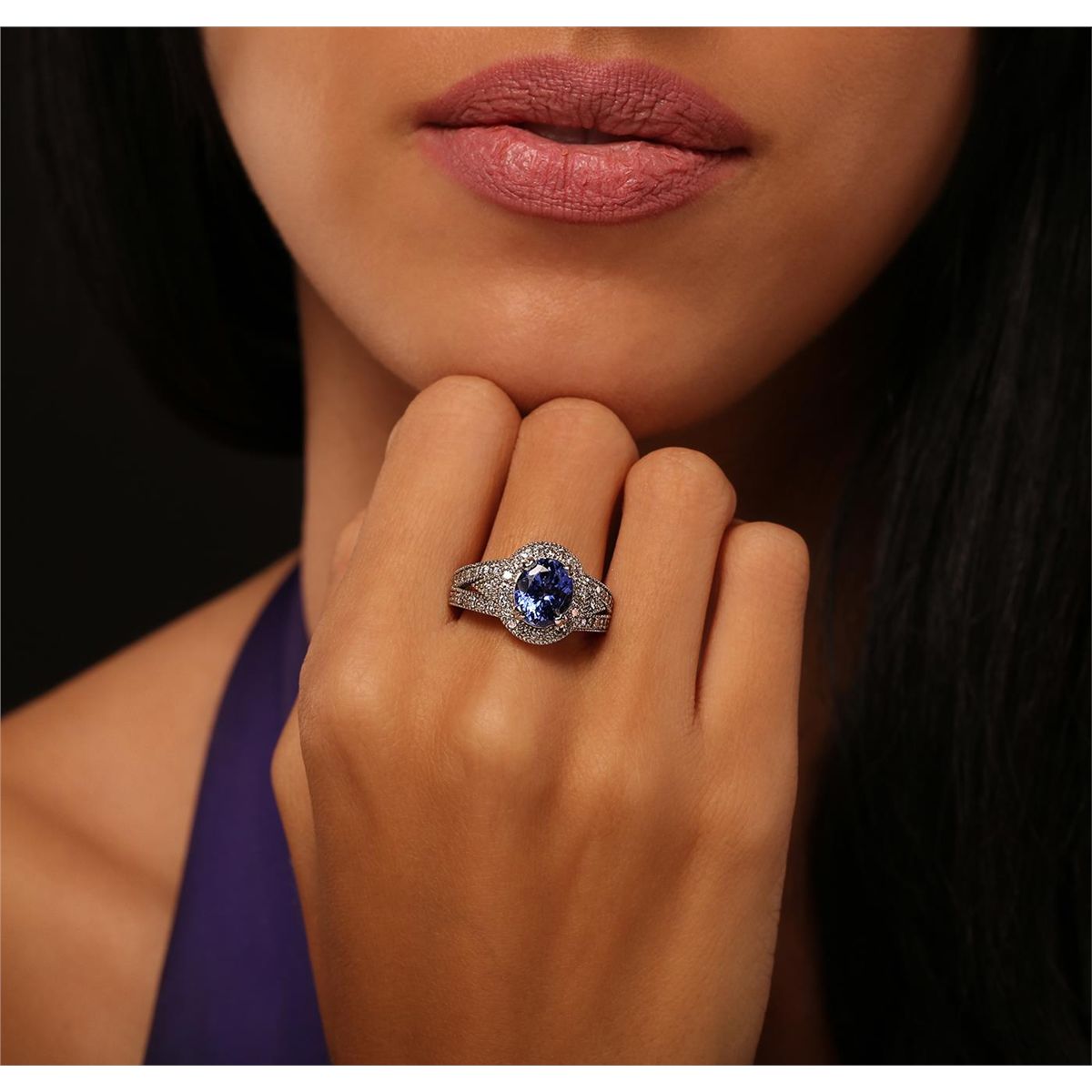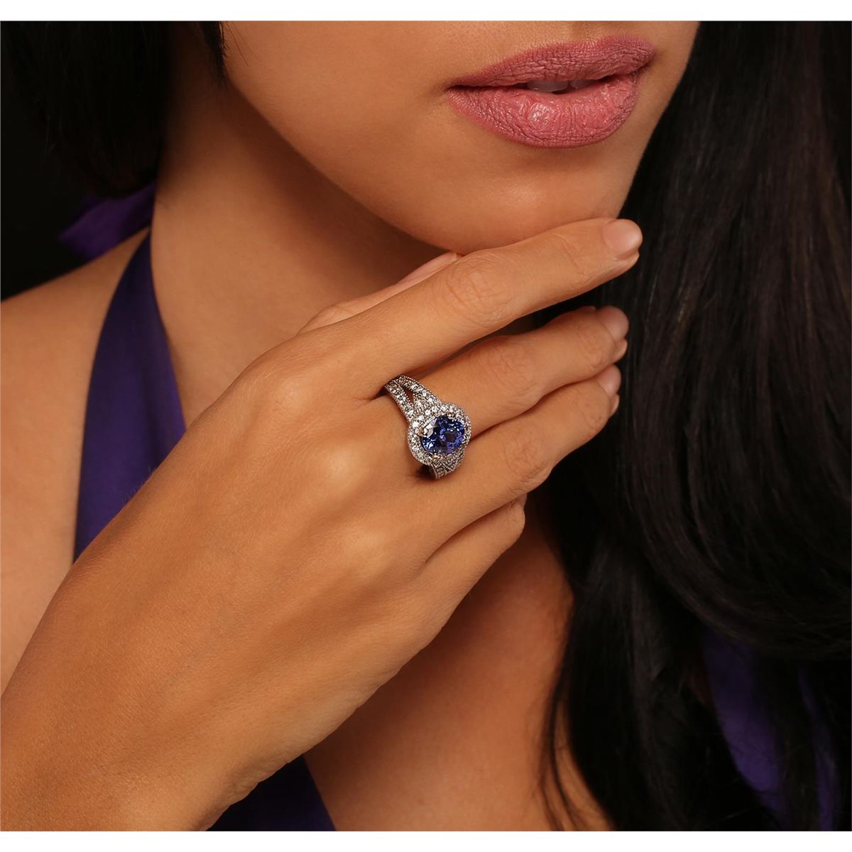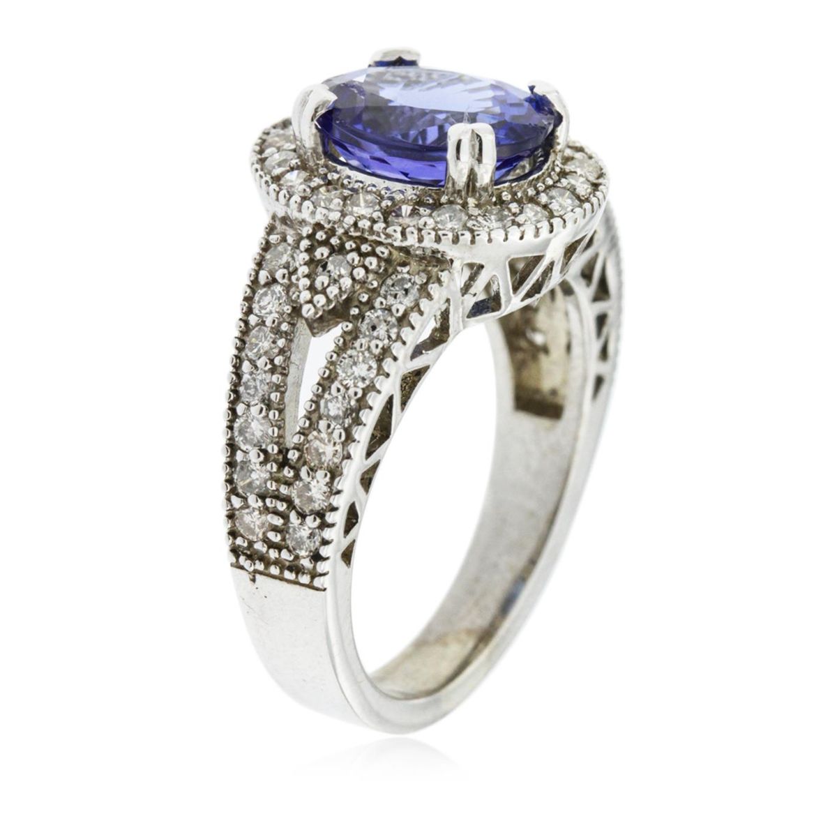 One electronically tested 14KT white gold Ladies combination cast & assembled ring with a bright polish finish. Condition is new. Identified with markings of "K14". Containing: One prong set oval modified brilliant cut natural tanzanite, measuring 9.40 x 8.00 x 5.20mm, approximate weight of 2.64ct., clarity is eye clean, type I, medium, moderately strong, bluish violet color, (GIA bV 5/4), cut is good. Colored gemstones are presumed to have been subjected to commonly used color/clarity enhancement processes. Fifty-One prong set round brilliant cut diamonds, measuring 1.50 - 1.50 x 0.90mm (depth est.) approximate. Total Weight of 51 Stones = 0.63ct. Clarity: I-1 to I-2. Color: I - J, Cut is Good. Total Weight of Colored Stones 2.64ct. Total Weight of Diamonds 0.63ct. Total Weight of Ring 7.20 grams. GGL Appraised at $6,955.00.