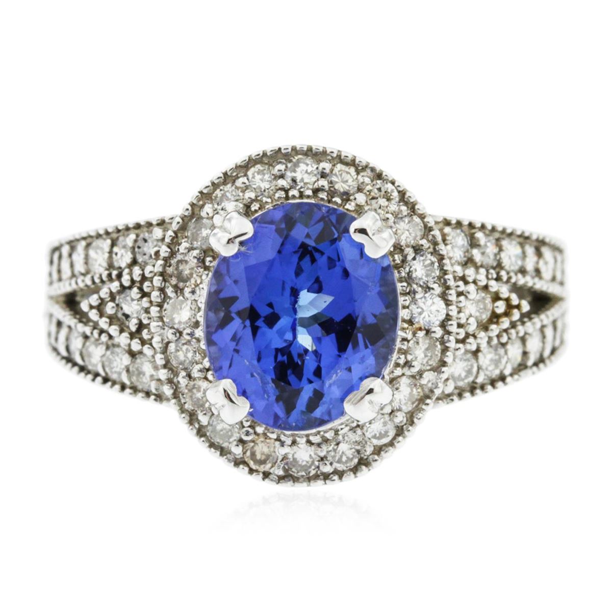 One electronically tested 14KT white gold Ladies combination cast & assembled ring with a bright polish finish. Condition is new. Identified with markings of "K14". Containing: One prong set oval modified brilliant cut natural tanzanite, measuring 9.40 x 8.00 x 5.20mm, approximate weight of 2.64ct., clarity is eye clean, type I, medium, moderately strong, bluish violet color, (GIA bV 5/4), cut is good. Colored gemstones are presumed to have been subjected to commonly used color/clarity enhancement processes. Fifty-One prong set round brilliant cut diamonds, measuring 1.50 - 1.50 x 0.90mm (depth est.) approximate. Total Weight of 51 Stones = 0.63ct. Clarity: I-1 to I-2. Color: I - J, Cut is Good. Total Weight of Colored Stones 2.64ct. Total Weight of Diamonds 0.63ct. Total Weight of Ring 7.20 grams. GGL Appraised at $6,955.00.