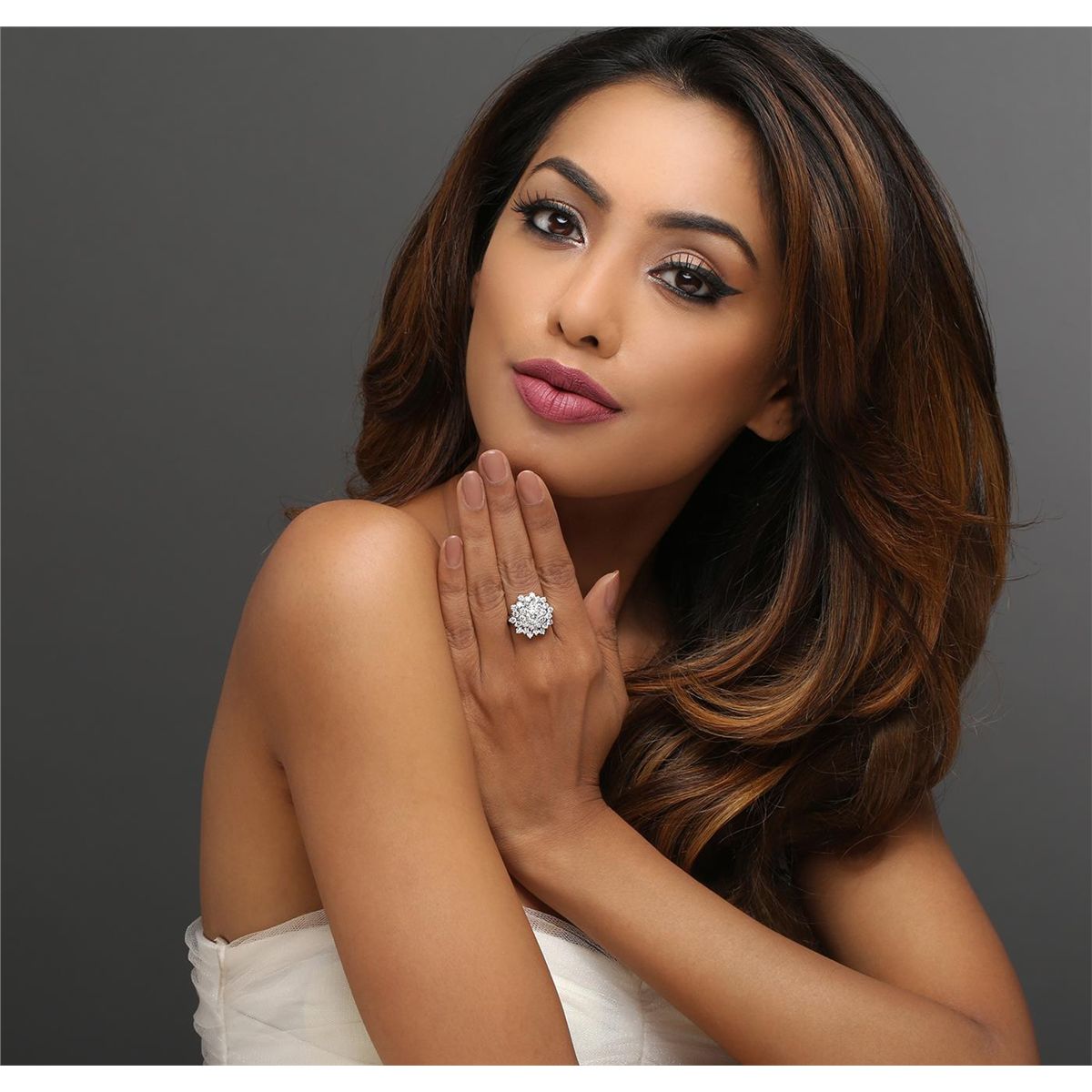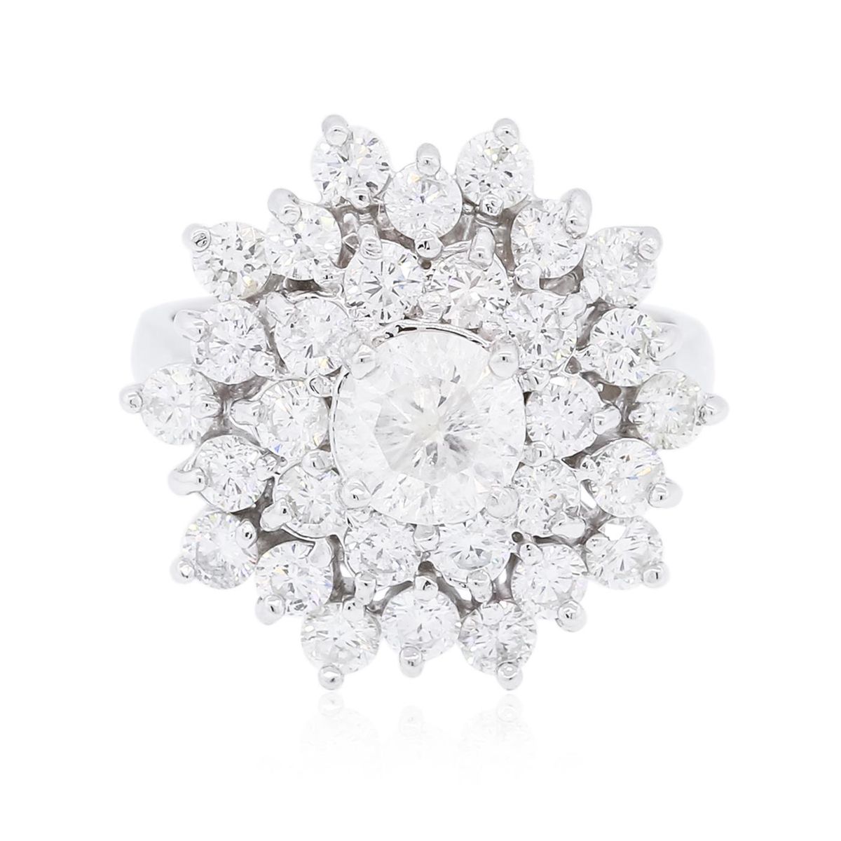 One electronically tested 14KT white gold ladies combination cast & assembled engagement ring with a flat shank with a bright polish finish. Identified with markings of "K14". Condition is new. Containing: One prong set round brilliant cut diamond, measuring 6.20 - 6.10 x 4.00mm (depth est.) approximate weight of 0.92ct. Clarity: I-2. Color: I, Cut is Good. Thirty prong set round brilliant cut diamonds, measuring 2.50 - 2.50 x 1.50mm (depth est.) approximate total weight of 30 Stones = 1.71ct. Clarity: SI-2 to I-1. Color: I - J, Cut is Good. All diamonds are graded in the mounting, unless otherwise stated. Total Weight of Diamonds 2.64ct. Total Weight of Ring 6.50 grams. GGL Appraised at $12,390.00.