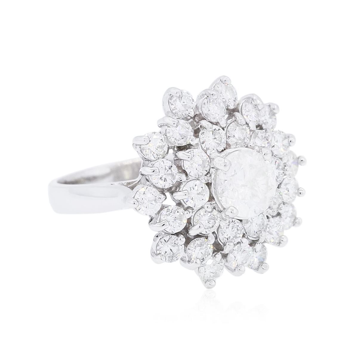 One electronically tested 14KT white gold ladies combination cast & assembled engagement ring with a flat shank with a bright polish finish. Identified with markings of "K14". Condition is new. Containing: One prong set round brilliant cut diamond, measuring 6.20 - 6.10 x 4.00mm (depth est.) approximate weight of 0.92ct. Clarity: I-2. Color: I, Cut is Good. Thirty prong set round brilliant cut diamonds, measuring 2.50 - 2.50 x 1.50mm (depth est.) approximate total weight of 30 Stones = 1.71ct. Clarity: SI-2 to I-1. Color: I - J, Cut is Good. All diamonds are graded in the mounting, unless otherwise stated. Total Weight of Diamonds 2.64ct. Total Weight of Ring 6.50 grams. GGL Appraised at $12,390.00.