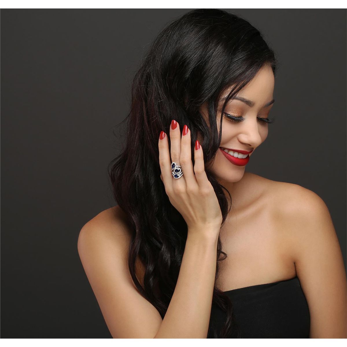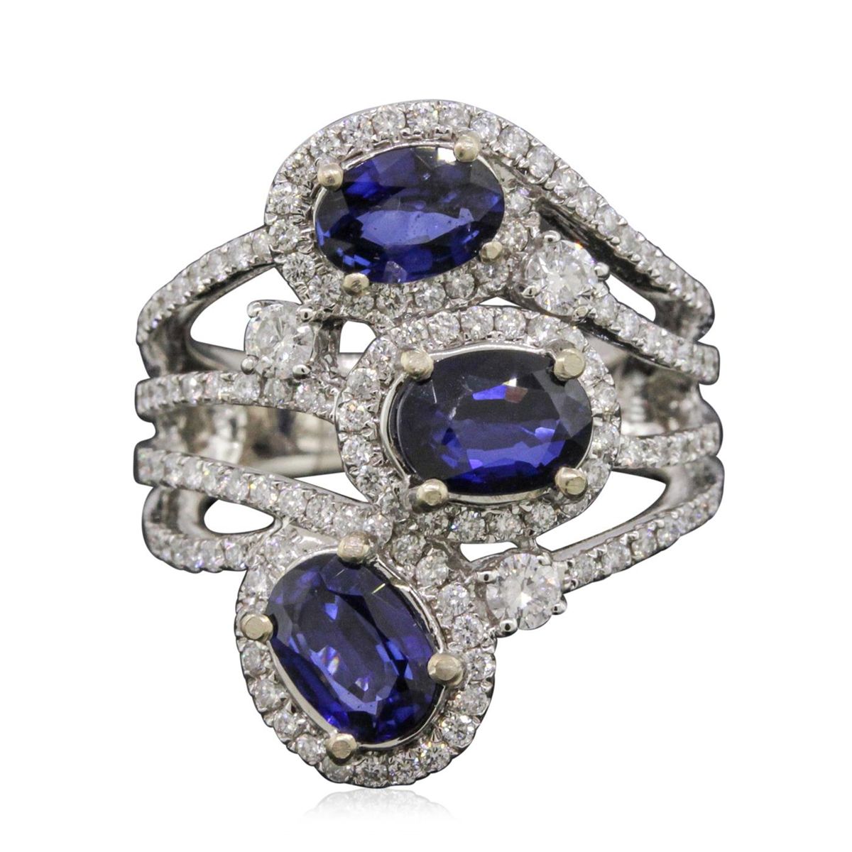 One electronically tested 14KT white gold ladies combination cast & assembled sapphire and diamond ring with a split shank with a bright polish finish. Identified with markings of "14K". Condition is new. Containing: Three prong set oval modified brilliant cut natural blue sapphires, measuring 6.82 x 4.90 x 3.19mm, approximate total weight of 2.64ct., clarity is eye clean, type II, medium dark, moderately strong, blue color, (GIA B 6/4), cut is very good. Three prong set round brilliant cut diamonds, measuring 2.80 - 2.80 x 1.68mm (depth est.) approximate total weight of 3 Stones = 0.24ct. Clarity: SI-2 to I-1. Color: I - J, Cut is Good. One Hundred Twenty prong set round brilliant cut diamonds, measuring 1.10 - 1.10 x 0.66mm (depth est.) approximate total weight of 120 Stones = 0.58ct. Clarity: I-1 to I-2. Color: I - J, Cut is Good. Colored gemstones are presumed to have been subjected to commonly used enhancement processes. All diamonds and colored gemstones are graded in the mounting, unless otherwise stated. Total Weight of Colored Stones 2.64ct. Total Weight of Diamonds 0.82ct. Total Weight of Ring 9.80 grams. GGL Appraised at $10,490.00.