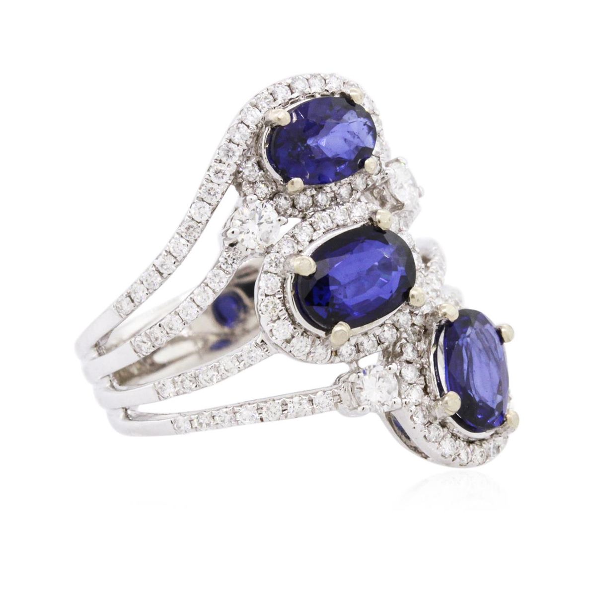 One electronically tested 14KT white gold ladies combination cast & assembled sapphire and diamond ring with a split shank with a bright polish finish. Identified with markings of "14K". Condition is new. Containing: Three prong set oval modified brilliant cut natural blue sapphires, measuring 6.82 x 4.90 x 3.19mm, approximate total weight of 2.64ct., clarity is eye clean, type II, medium dark, moderately strong, blue color, (GIA B 6/4), cut is very good. Three prong set round brilliant cut diamonds, measuring 2.80 - 2.80 x 1.68mm (depth est.) approximate total weight of 3 Stones = 0.24ct. Clarity: SI-2 to I-1. Color: I - J, Cut is Good. One Hundred Twenty prong set round brilliant cut diamonds, measuring 1.10 - 1.10 x 0.66mm (depth est.) approximate total weight of 120 Stones = 0.58ct. Clarity: I-1 to I-2. Color: I - J, Cut is Good. Colored gemstones are presumed to have been subjected to commonly used enhancement processes. All diamonds and colored gemstones are graded in the mounting, unless otherwise stated. Total Weight of Colored Stones 2.64ct. Total Weight of Diamonds 0.82ct. Total Weight of Ring 9.80 grams. GGL Appraised at $10,490.00.