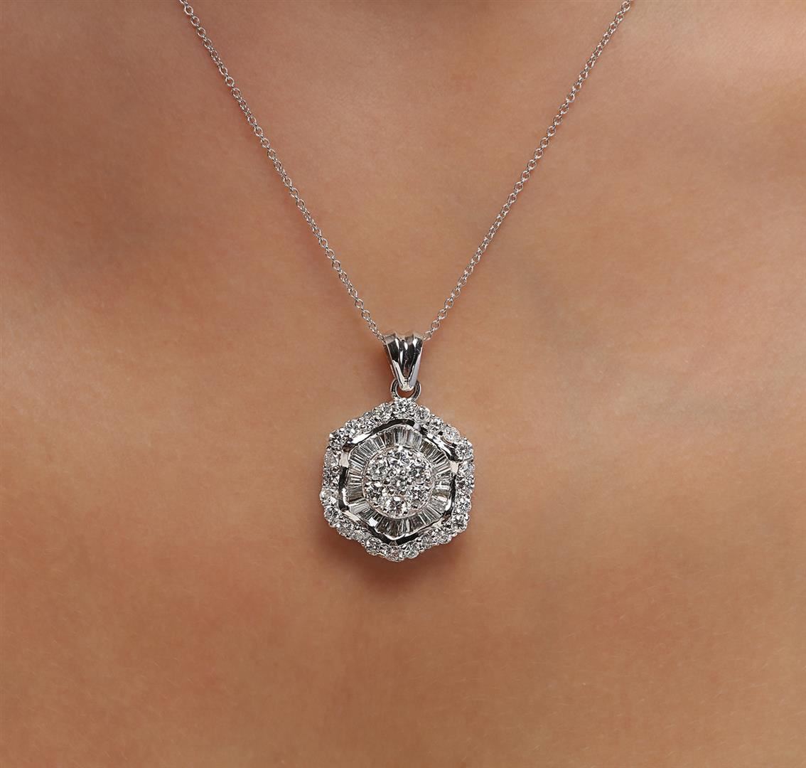 One electronically tested 14KT white gold ladies cast diamond pendant & chain 16.0" long, cable link with a spring ring clasp with a bright polish finish. Measurements: 16" in length Identified with markings of "14K". Condition is new. Containing: Thirty-Two prong set round brilliant cut diamonds, measuring 2.20 - 2.20 x 1.32mm (depth est.) approximate total weight of 32 Stones = 1.25ct. Clarity: SI-1 to SI-2. Color: I - J, Cut is Good. Thirty-Two channel set baguette cut (tapered) diamonds, measuring 2.50 x 1.50 x 1.28mm (depth est.) approximate total weight of 32 Stones = 1.41ct. Clarity: SI-1 to I-1. Color: H - I. All diamonds are graded in the mounting, unless otherwise stated. Total Weight of Diamonds 2.65ct. Total Weight of Pendant & Chain 6.10 grams. GGL Appraised at $7,685.00.