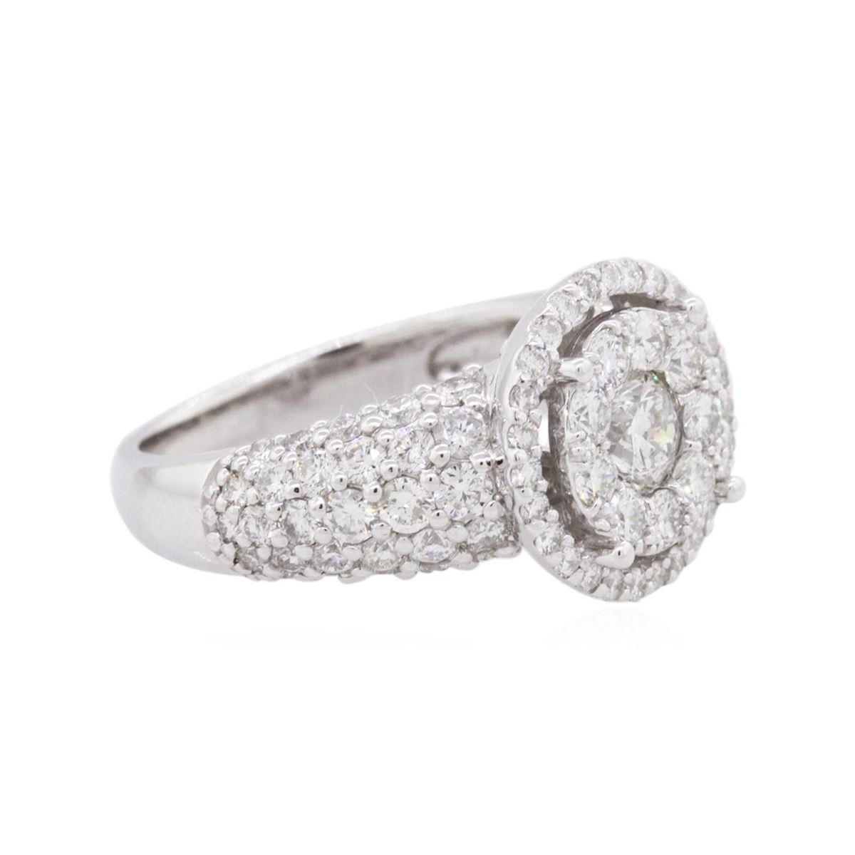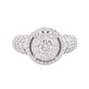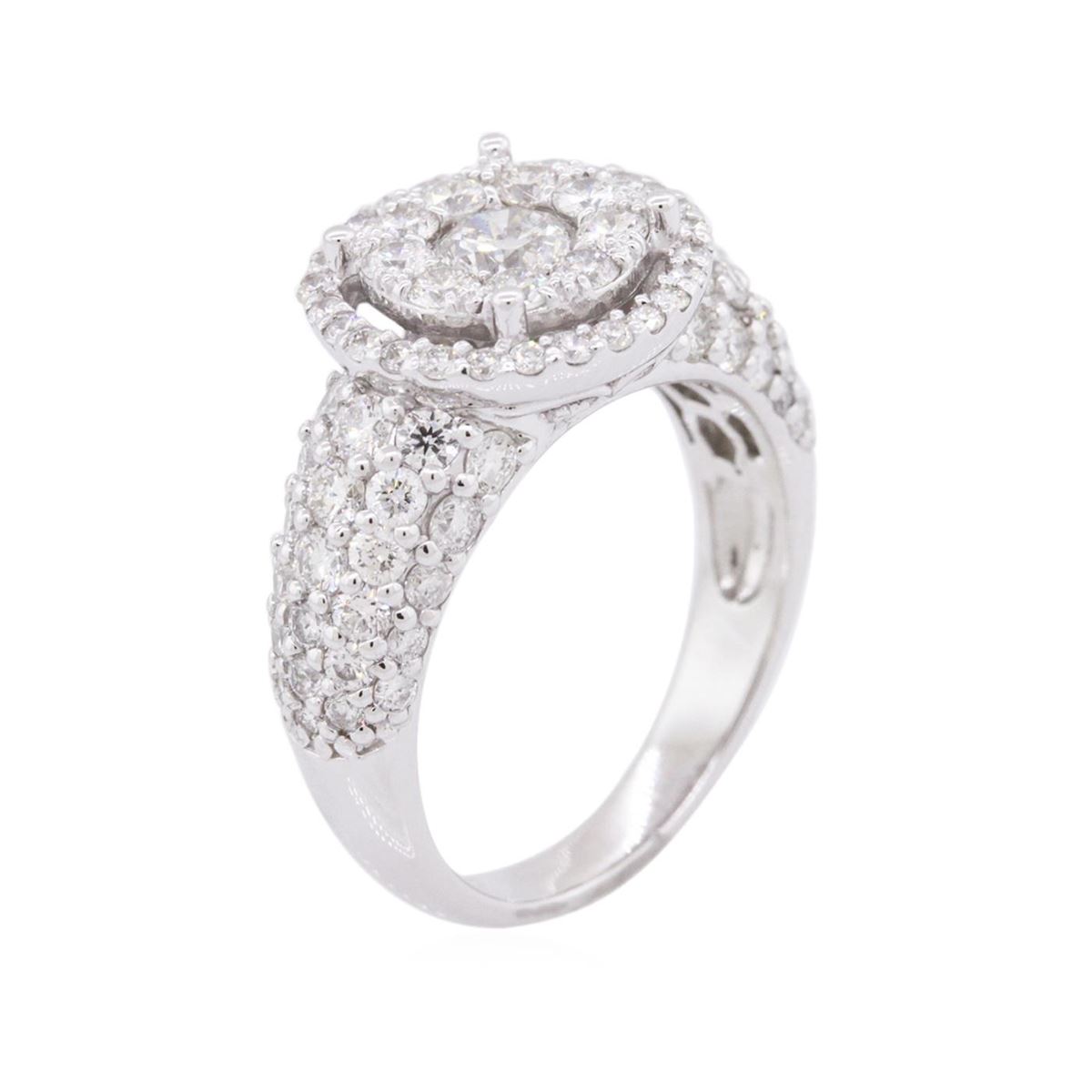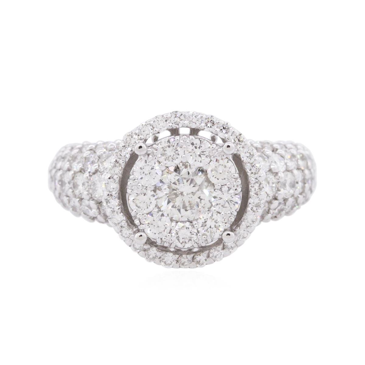 One electronically tested 14KT white gold ladies cast diamond ring with a bright polish finish. The ring features an organized diamond cluster set within a diamond bezel supported by diamond set shoulders, completed by a three millimeter wide band. Identified with markings of "14K". Condition is new, good workmanship. Containing: One prong set round brilliant cut diamond, measuring 4.90 - 4.80 x 3.00mm (depth est.) approximate weight of 0.45ct. Graded in the setting. Clarity: I-1. Color: H Sixty-Five prong set round brilliant cut diamonds, measuring 2.00 - 1.90 x 1.17mm (depth est.) approximate total weight of 65 Stones = 1.85ct. Graded in the setting. Clarity: SI-1 to I-1. Color: G - I Twenty-Seven prong set round brilliant cut diamonds, measuring 1.40 - 1.30 x 0.81mm (depth est.) approximate total weight of 27 Stones = 0.35ct. Graded in the setting. Clarity: SI-1 to I-1. Color: G - I. Total Weight of Diamonds 2.65ct. Total Weight of Ring 6.61 grams. AIG Appraised at $9,040.00.