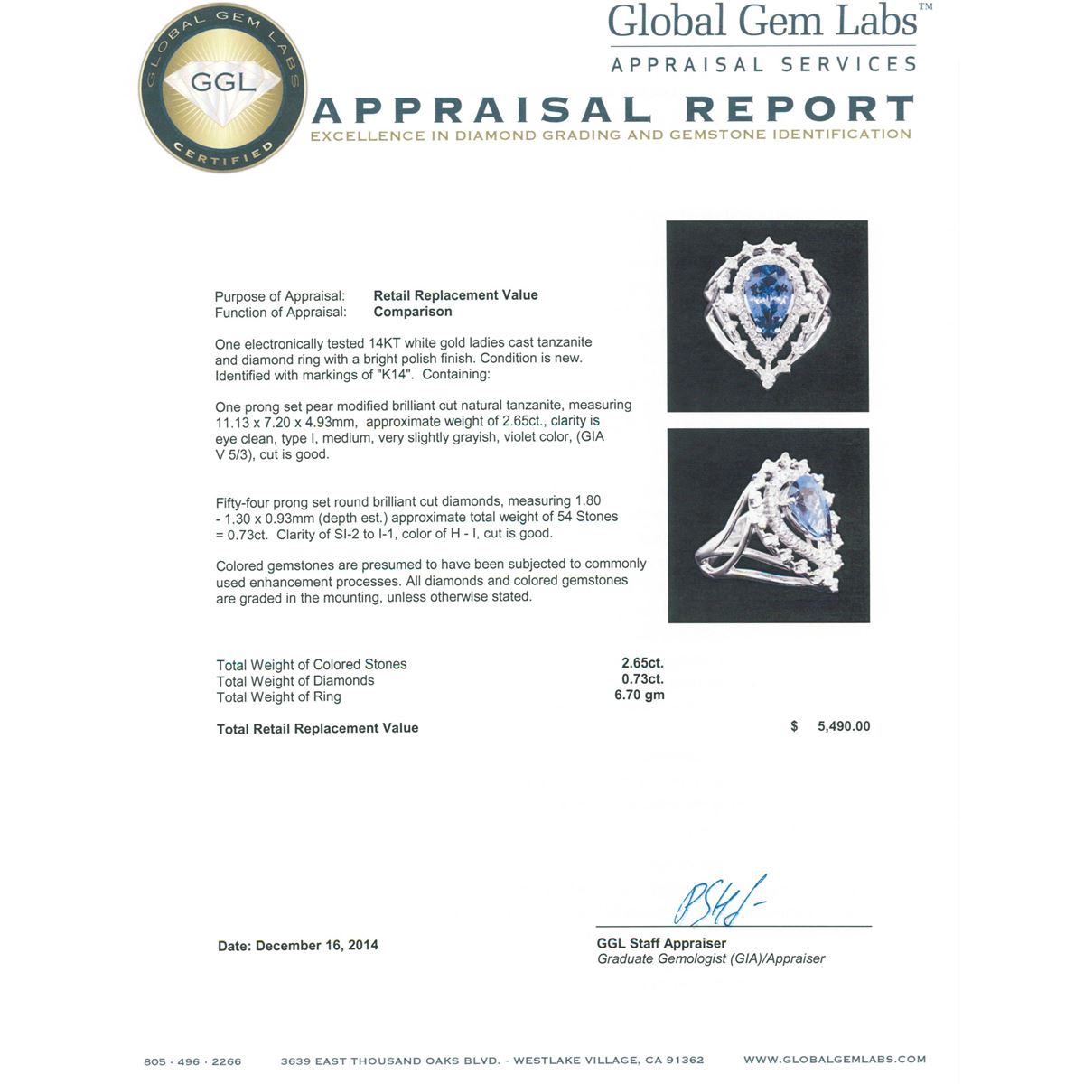 One electronically tested 14KT white gold ladies cast tanzanite and diamond ring with a bright polish finish. Identified with markings of "K14". Condition is new. Containing: One prong set pear modified brilliant cut natural tanzanite, measuring 11.13 x 7.20 x 4.93mm, approximate weight of 2.65ct., clarity is eye clean, type I, medium, very slightly grayish, violet color, (GIA V 5/3), cut is good. Fifty-Four prong set round brilliant cut diamonds, measuring 1.80 - 1.30 x 0.93mm (depth est.) approximate total weight of 54 Stones = 0.73ct. Clarity: SI-2 to I-1. Color: H - I, Cut is Good. Colored gemstones are presumed to have been subjected to commonly used enhancement processes. All diamonds and colored gemstones are graded in the mounting, unless otherwise stated. Total Weight of Colored Stones 2.65ct. Total Weight of Diamonds 0.73ct. Total Weight of Ring 6.70 grams. GGL Appraised at $5,490.00.