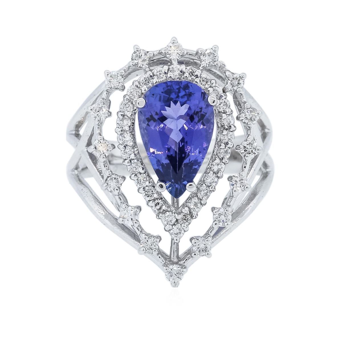 One electronically tested 14KT white gold ladies cast tanzanite and diamond ring with a bright polish finish. Identified with markings of "K14". Condition is new. Containing: One prong set pear modified brilliant cut natural tanzanite, measuring 11.13 x 7.20 x 4.93mm, approximate weight of 2.65ct., clarity is eye clean, type I, medium, very slightly grayish, violet color, (GIA V 5/3), cut is good. Fifty-Four prong set round brilliant cut diamonds, measuring 1.80 - 1.30 x 0.93mm (depth est.) approximate total weight of 54 Stones = 0.73ct. Clarity: SI-2 to I-1. Color: H - I, Cut is Good. Colored gemstones are presumed to have been subjected to commonly used enhancement processes. All diamonds and colored gemstones are graded in the mounting, unless otherwise stated. Total Weight of Colored Stones 2.65ct. Total Weight of Diamonds 0.73ct. Total Weight of Ring 6.70 grams. GGL Appraised at $5,490.00.