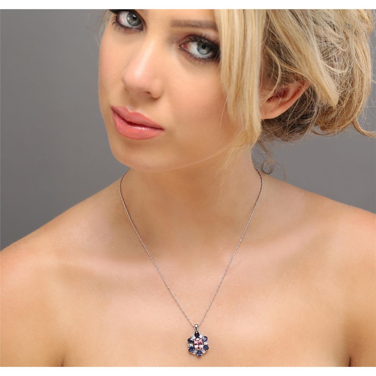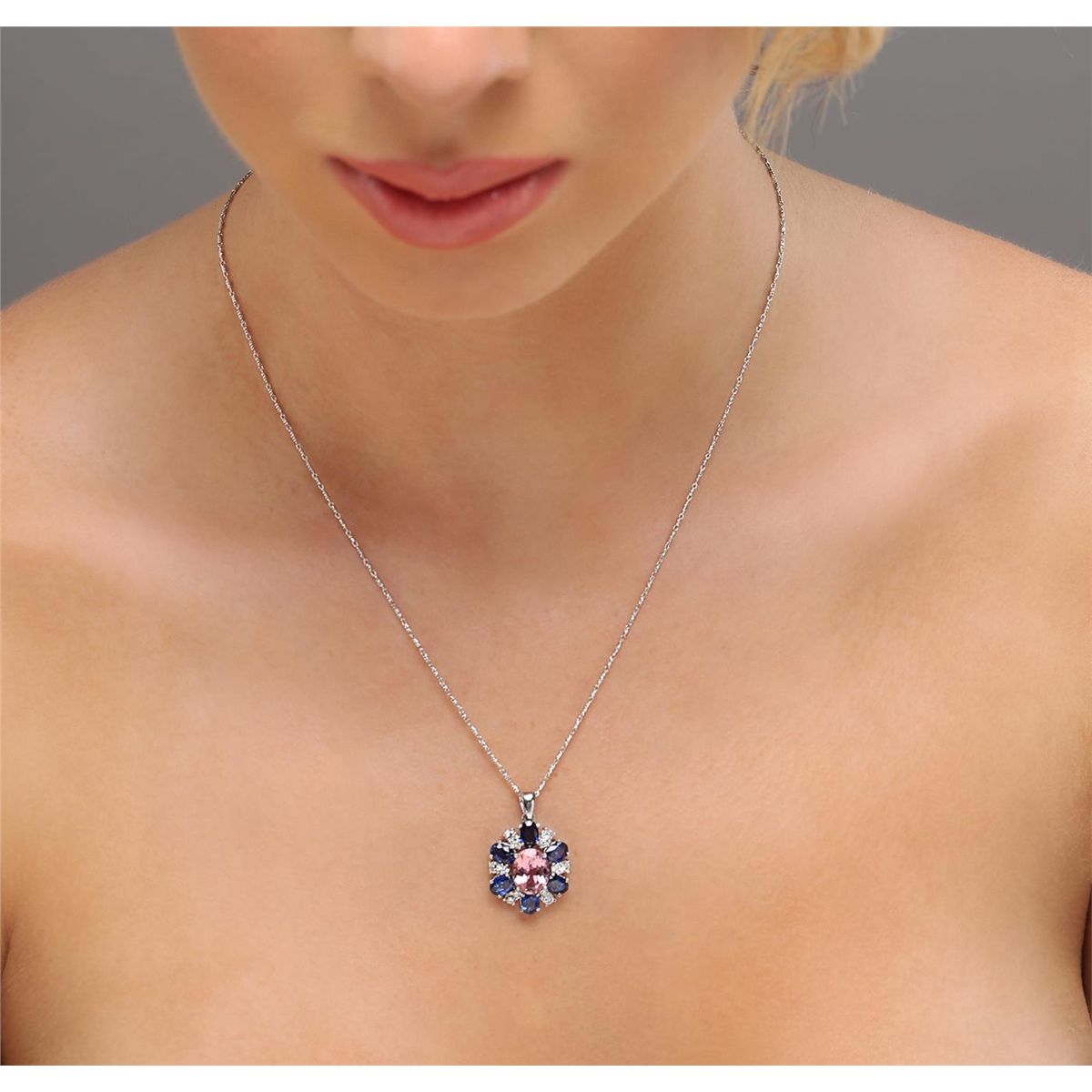 One electronically tested 14KT white gold ladies cast tourmaline, sapphire & diamond pendant & chain 18.0" long, fancy link with a lobster claw clasp with a bright polish finish. Identified with markings of "14K". Condition is new. Containing: One prong set oval modified brilliant cut natural pink tourmaline, measuring 9.91 x 8.00 x 5.20mm, approximate weight of 2.65ct., clarity is eye clean, type II, light, slightly grayish, reddish purple color, (GIA rP 3/2), cut is good. Six prong set oval modified brilliant cut natural blue sapphires, measuring 5.20 x 4.00 x 2.60mm, approximate total weight of 2.70ct., clarity is eye clean, type II, medium, moderately strong, blue color, (GIA B 5/4), cut is good. Twelve prong set round brilliant cut diamonds, measuring 2.20 - 1.50 x 1.11mm (depth est.) approximate total weight of 12 Stones = 0.28ct. Clarity: SI-2. Color: I - J, Cut is Good. Colored gemstones are presumed to have been subjected to commonly used enhancement processes. All diamonds and colored gemstones are graded in the mounting, unless otherwise stated. Total Weight of Colored Stones 5.35ct. Total Weight of Diamonds 0.28ct. Total Weight of Pendant & Chain 8.50 grams. GGL Appraised at $4,095.00.