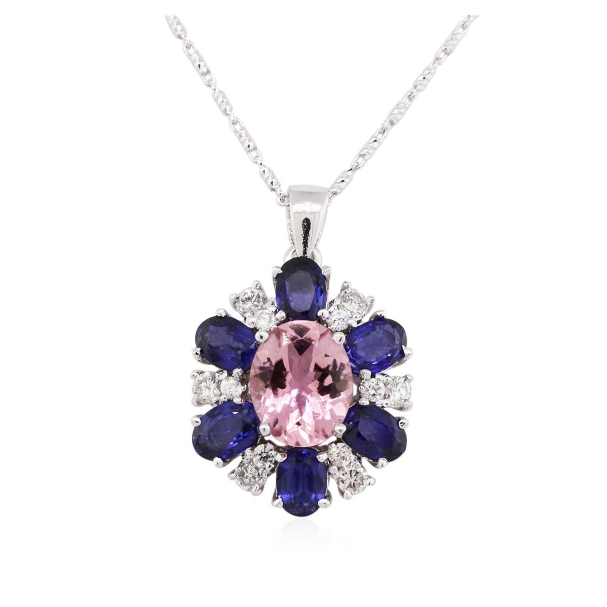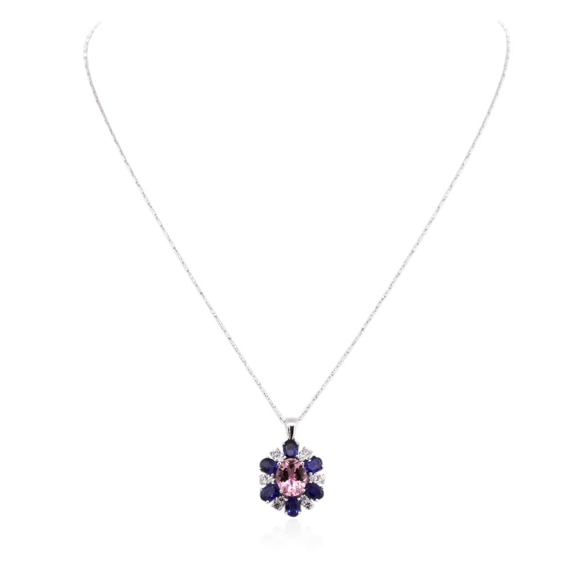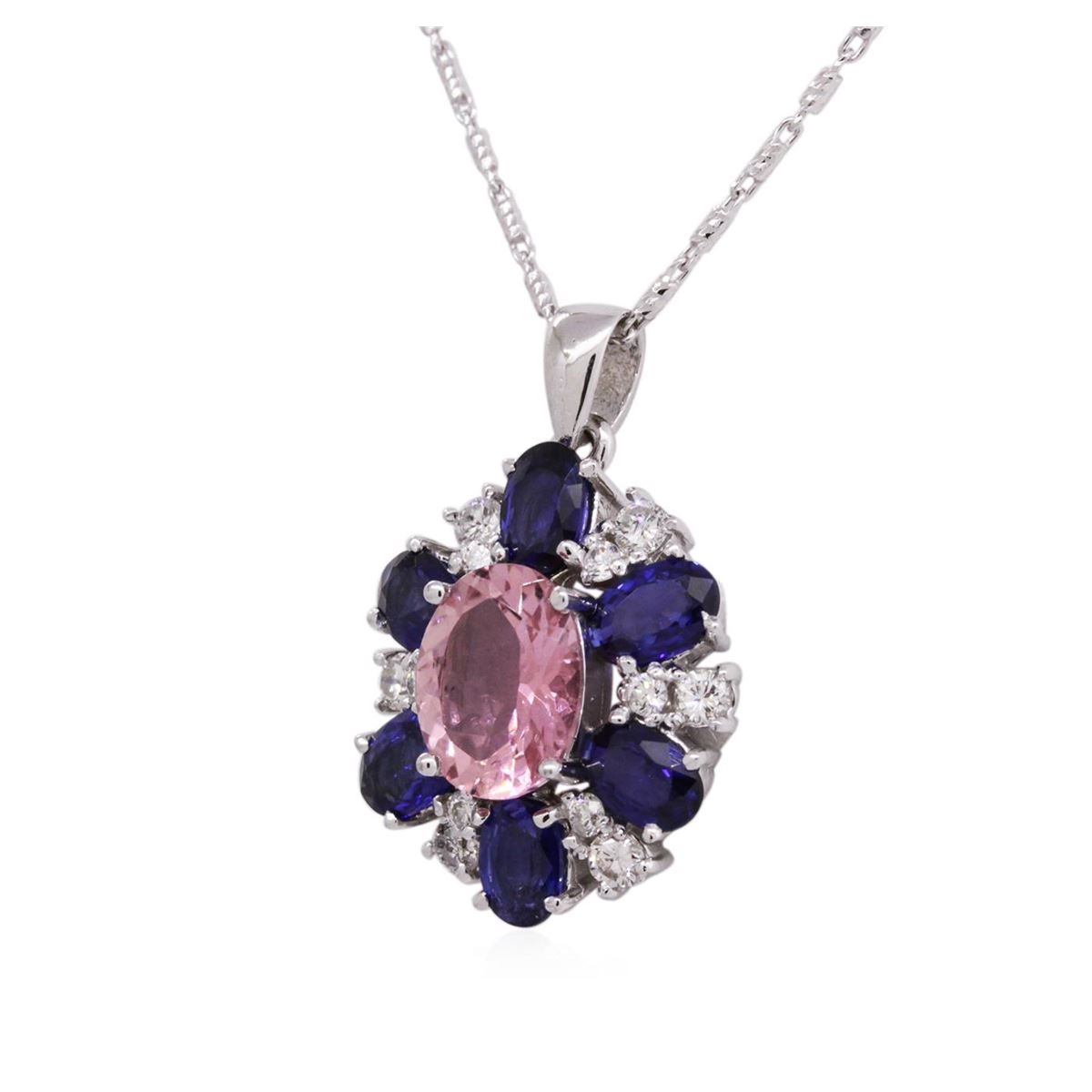 One electronically tested 14KT white gold ladies cast tourmaline, sapphire & diamond pendant & chain 18.0" long, fancy link with a lobster claw clasp with a bright polish finish. Identified with markings of "14K". Condition is new. Containing: One prong set oval modified brilliant cut natural pink tourmaline, measuring 9.91 x 8.00 x 5.20mm, approximate weight of 2.65ct., clarity is eye clean, type II, light, slightly grayish, reddish purple color, (GIA rP 3/2), cut is good. Six prong set oval modified brilliant cut natural blue sapphires, measuring 5.20 x 4.00 x 2.60mm, approximate total weight of 2.70ct., clarity is eye clean, type II, medium, moderately strong, blue color, (GIA B 5/4), cut is good. Twelve prong set round brilliant cut diamonds, measuring 2.20 - 1.50 x 1.11mm (depth est.) approximate total weight of 12 Stones = 0.28ct. Clarity: SI-2. Color: I - J, Cut is Good. Colored gemstones are presumed to have been subjected to commonly used enhancement processes. All diamonds and colored gemstones are graded in the mounting, unless otherwise stated. Total Weight of Colored Stones 5.35ct. Total Weight of Diamonds 0.28ct. Total Weight of Pendant & Chain 8.50 grams. GGL Appraised at $4,095.00.