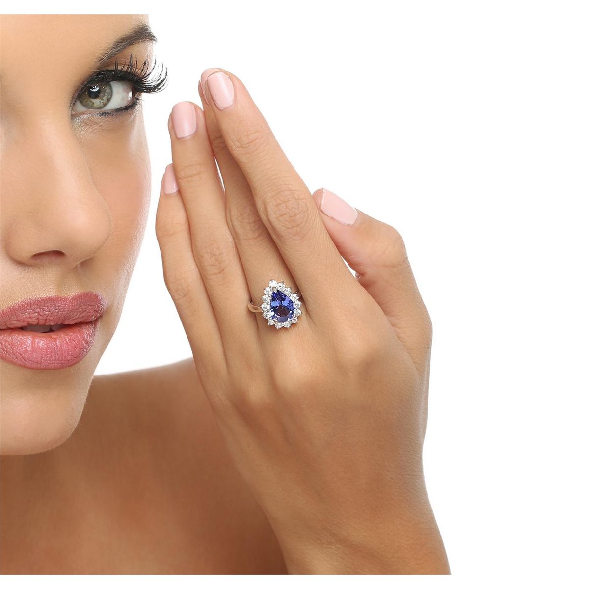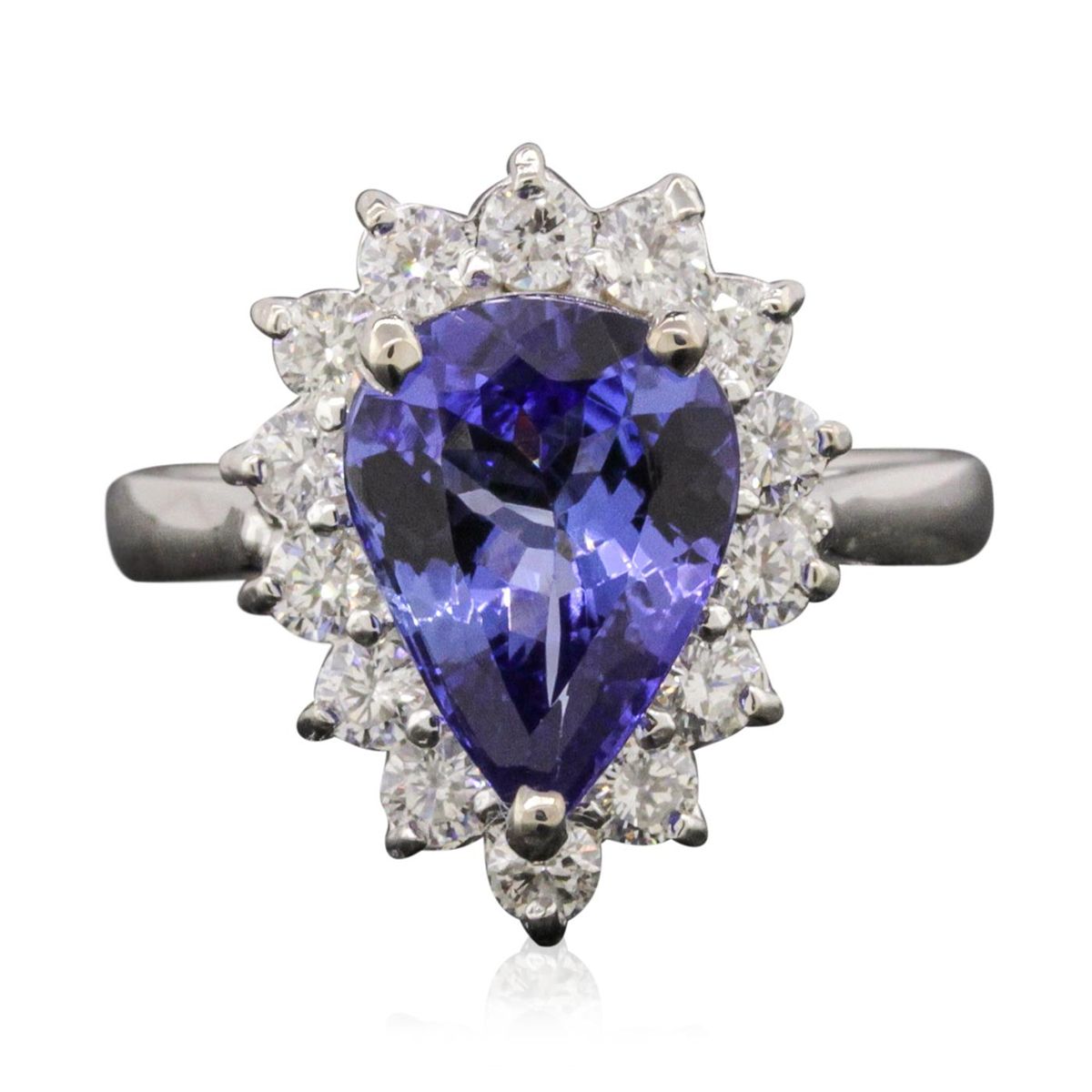 One electronically tested 14KT white gold ladies combination cast & assembled ring with a bright polish finish. Condition is new. Identified with markings of "K14". Containing: One prong set pear modified brilliant cut natural tanzanite, measuring 10.00 x 8.13 x 4.89mm, approximate weight of 2.66ct., clarity is eye clean, type I, medium, moderately strong, bluish violet color, (GIA bV 5/4), cut is good. Fourteen prong set round brilliant cut diamonds, measuring 2.40 - 2.40 x 1.44mm (depth est.) approximate. Total Weight of 14 Stones = 0.71ct. Clarity: SI-1 to I-1. Color: J - K, Cut is Good. Colored gemstones are presumed to have been subjected to commonly used enhancement processes. All diamonds and colored gemstones are graded in the mounting, unless otherwise stated. Total Weight of Colored Stones 2.66ct. Total Weight of Diamonds 0.71ct. Total Weight of Ring 4.80 grams. GGL Appraised at $6,730.00.