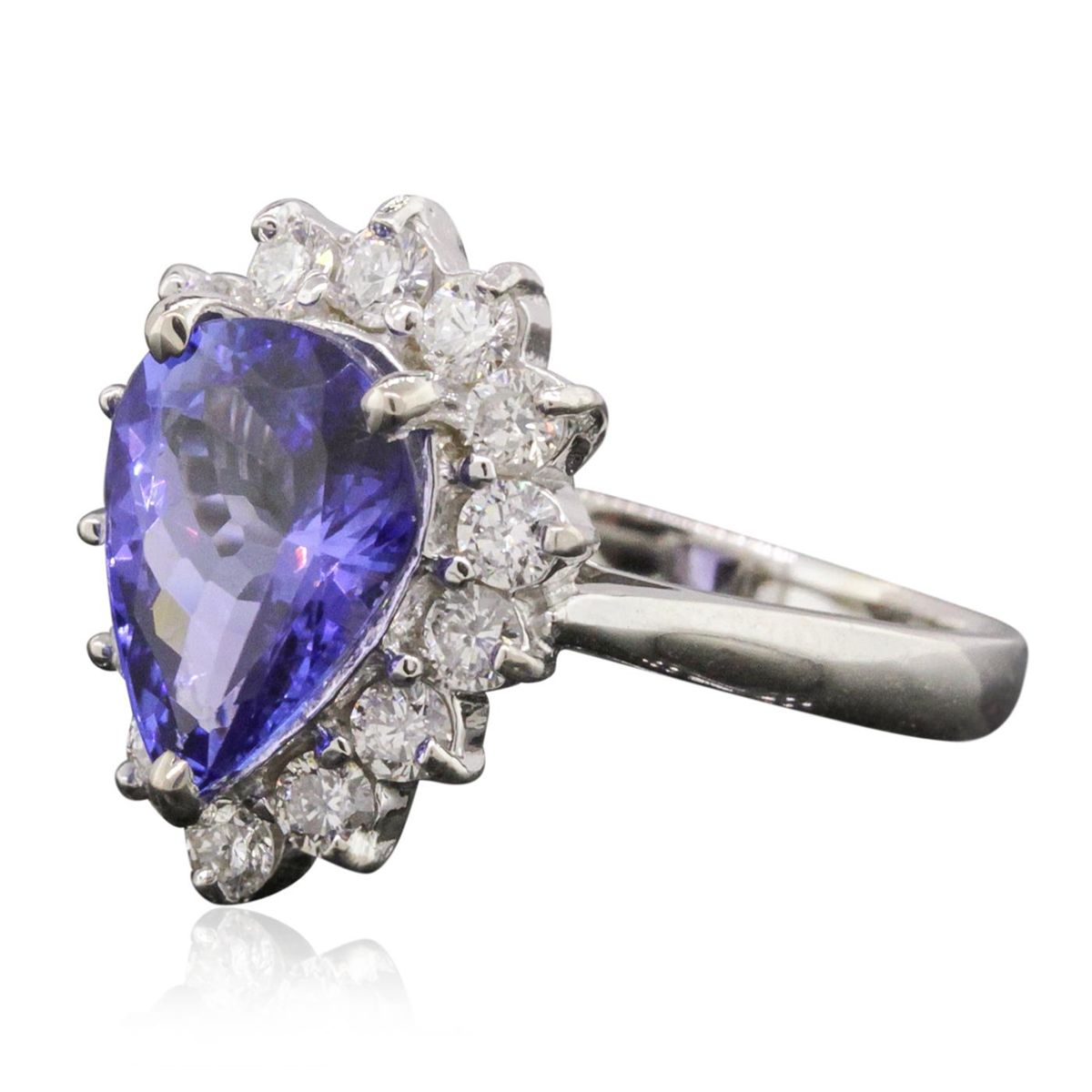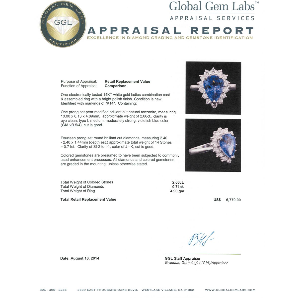 One electronically tested 14KT white gold ladies combination cast & assembled ring with a bright polish finish. Condition is new. Identified with markings of "K14". Containing: One prong set pear modified brilliant cut natural tanzanite, measuring 10.00 x 8.13 x 4.89mm, approximate weight of 2.66ct., clarity is eye clean, type I, medium, moderately strong, violetish blue color, (GIA vB 5/4), cut is good. Fourteen prong set round brilliant cut diamonds, measuring 2.40 - 2.40 x 1.44mm (depth est.) approximate. Total Weight of 14 Stones = 0.71ct. Clarity: SI-2 to I-1. Color: J - K, Cut is Good. Colored gemstones are presumed to have been subjected to commonly used enhancement processes. All diamonds and colored gemstones are graded in the mounting, unless otherwise stated. Total Weight of Colored Stones 2.66ct. Total Weight of Diamonds 0.71ct. Total Weight of Ring 4.90 grams. GGL Appraised at $6,770.00.