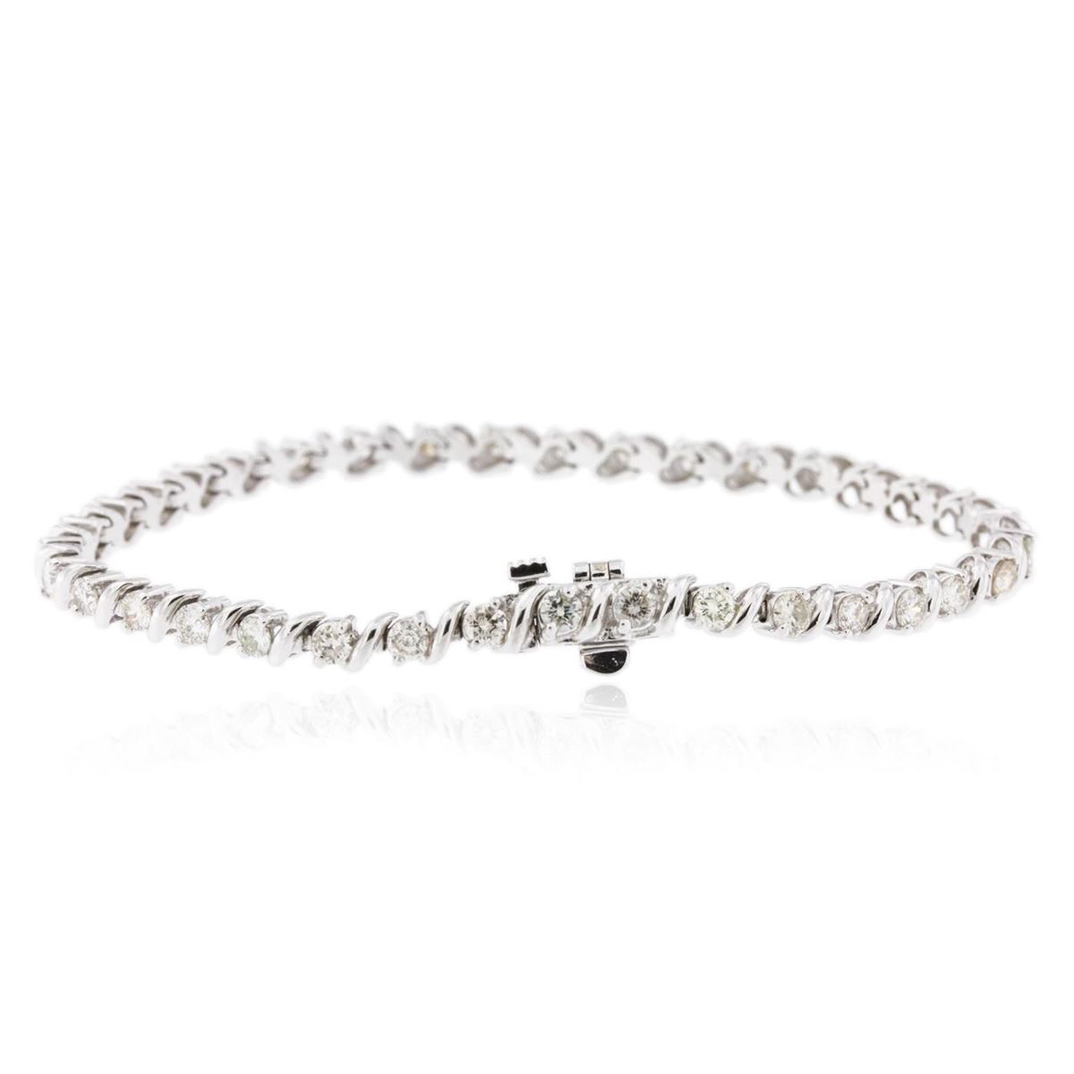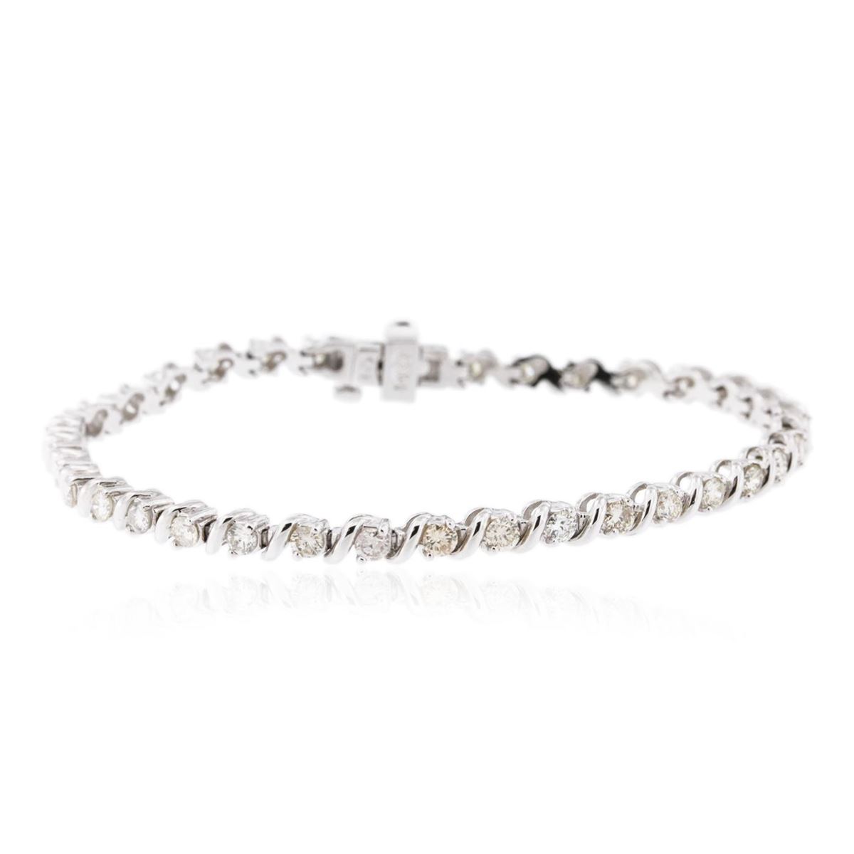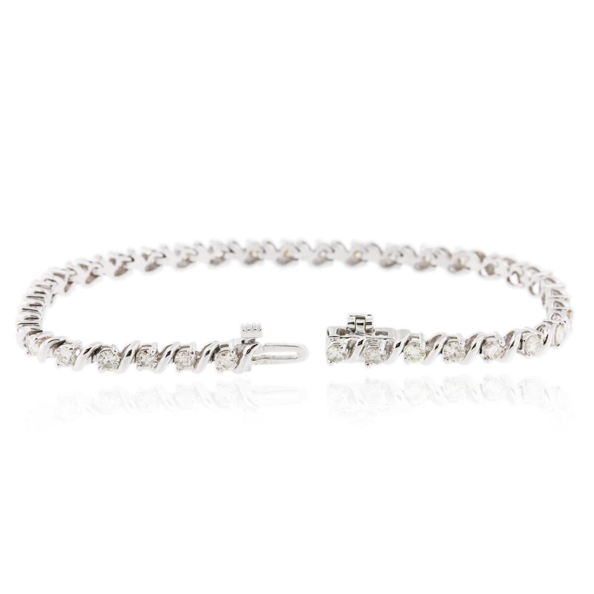 One electronically tested 14KT white gold ladies cast & assembled diamond tennis bracelet with a bright polish finish. Condition is good. The seven inch length bracelet features a continuous ribbon of diamonds interspersed by 14KT white gold bars, terminating in a concealed clasp with safety. Identified with markings of "14K". Tennis bracelet got their unusual name from an incident involving the U.S. professional tennis player Chris Evert during a tennis match in the 1980's. Evert had been wearing an expensive diamond bracelet, an inline string of individually-set diamonds. Previously these bracelets were known as eternity bracelets. When the clasp snapped during play, she asked the officials to stop the tennis match until the bracelet could be found. Since that day, bracelets featuring an inline string of diamonds have been called tennis bracelets. Containing: Thirty-six prong set round brilliant cut diamonds, measuring 2.75 - 2.70 x 1.64mm (depth est.) approximate total weight of 36 Stones = 2.67ct. The color grade reflects the entire range of color for this group. Faint brown secondary color throughout. Graded in the setting. Clarity SI-1 to I-1. Color J - M. Total Weight of Diamonds.2.67ct. Total Weight of Bracelet 10.76 gm. AIG Appraised at $8,725.00.