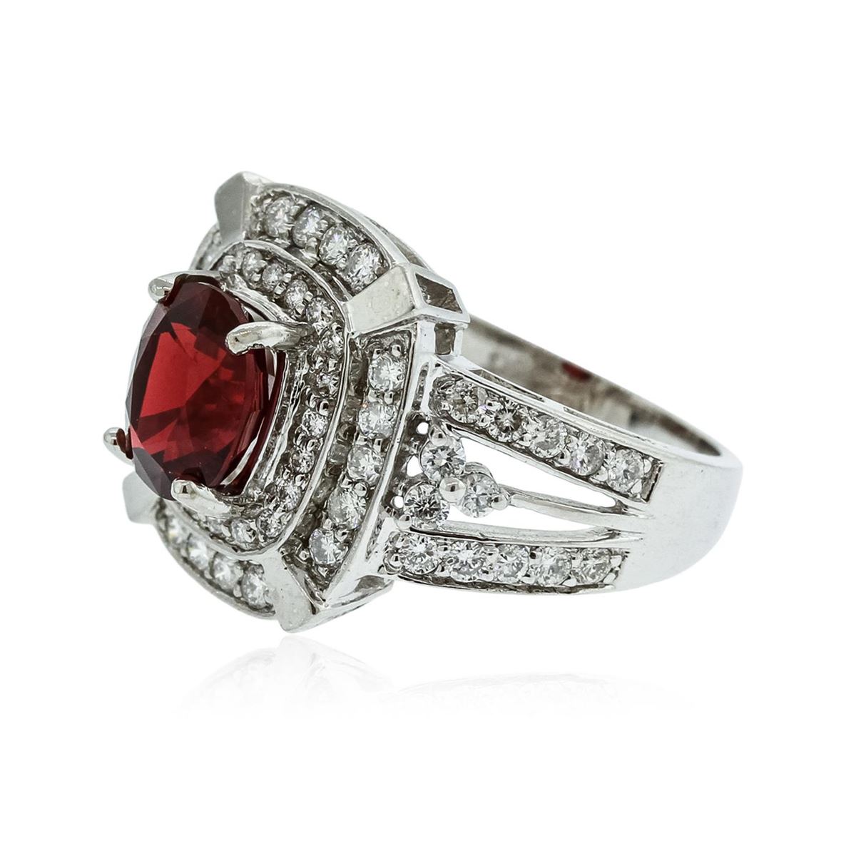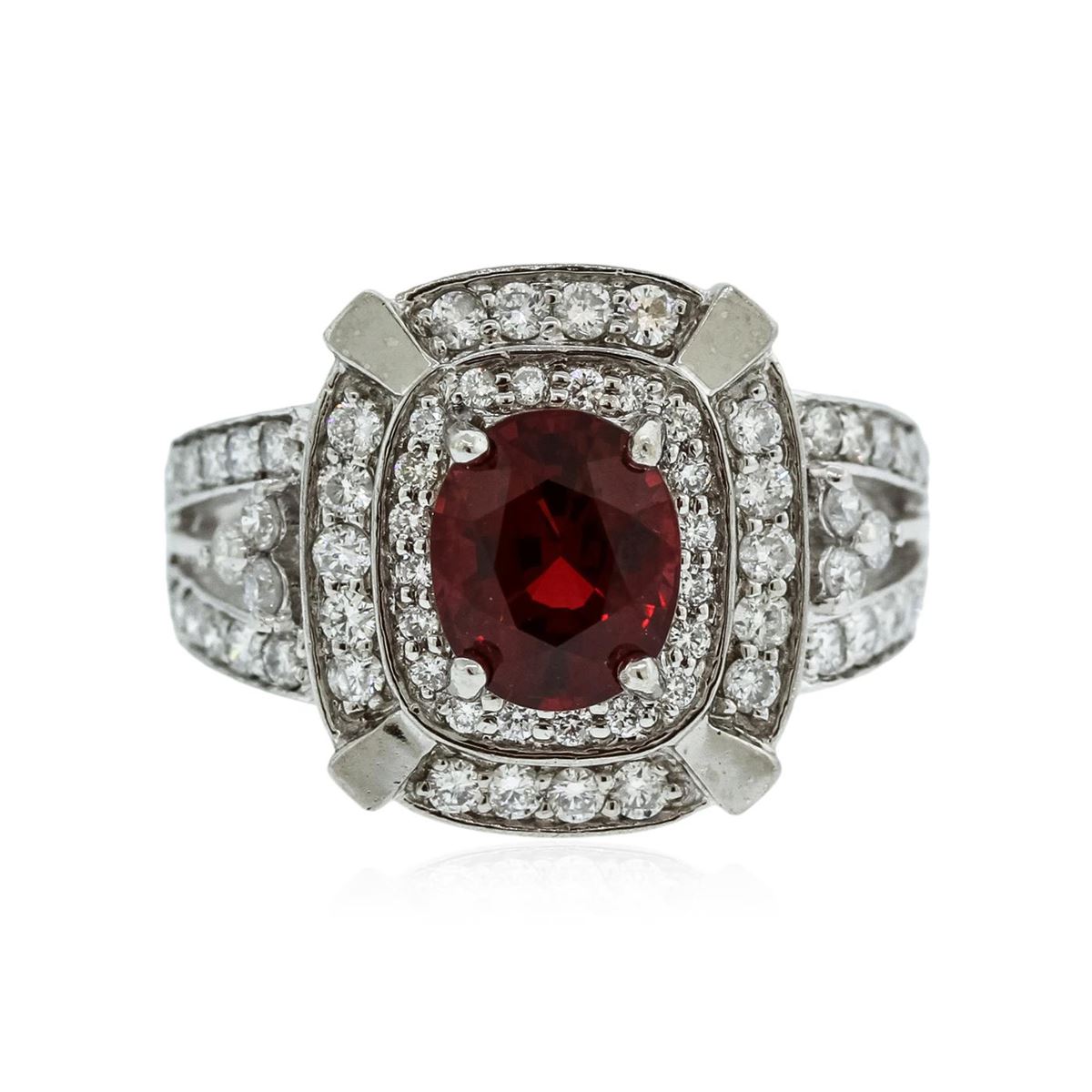 One electronically tested 14KT white gold Ladies combination cast & assembled ballerina ring with a bright polish finish. Condition is excellent. Containing: One prong set oval modified brilliant cut natural red spinel, measuring 8.40 x 7.60 x 5.80mm, approximate weight of 2.67ct., clarity is eye clean, type II, medium dark, moderately strong, orangy red color, (GIA oR 6/4), cut is good. Colored gemstones are presumed to have been subjected to commonly used and possible undetectable color/clarity enhancement processes. Sixty-Four prong set round brilliant cut diamonds, measuring 1.60 - 1.60 x 0.96mm (depth est.) approximate total weight of 64 Stones = 0.95ct. Clarity of SI-2 to I-1, Color of G - H, Cut is Good. Total Weight of Colored Stones 2.67ct. Total Weight of Diamonds 0.95ct. Total Weight of Ring 6.00gm. GGL Appraised at $13,025.00.