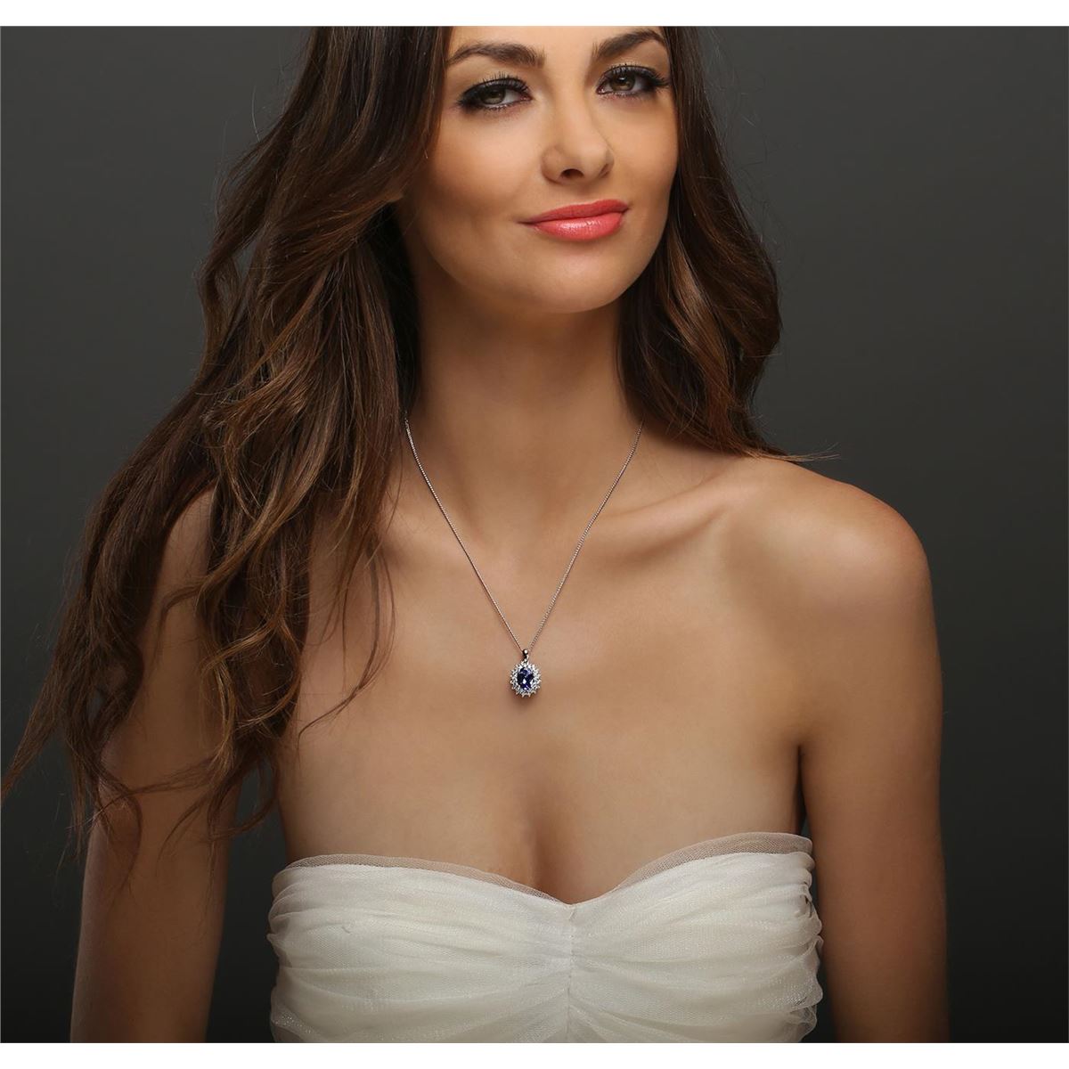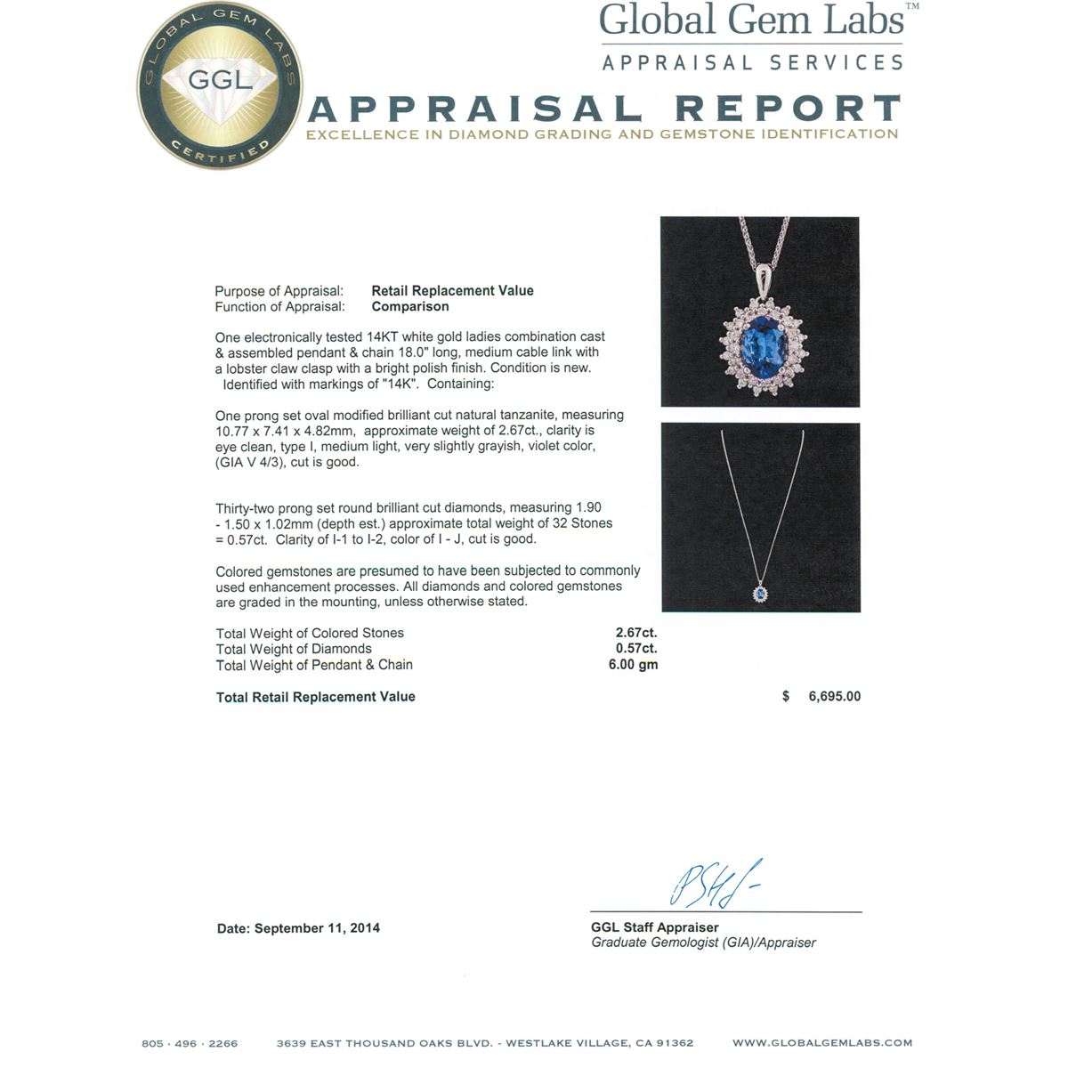 One electronically tested 14KT white gold ladies combination cast & assembled pendant & chain 18.0" long, medium cable link with a lobster claw clasp with a bright polish finish. Identified with markings of "14K". Condition is new. Containing: One prong set oval modified brilliant cut natural tanzanite, measuring 10.77 x 7.41 x 4.82mm, approximate weight of 2.67ct., clarity is eye clean, type I, medium light, very slightly grayish, violet color, (GIA V 4/3), cut is good. Thirty-Two prong set round brilliant cut diamonds, measuring 1.90 - 1.50 x 1.02mm (depth est.) approximate total weight of 32 Stones = 0.57ct. . Clarity: I-1 to I-2. Color: I - J, Cut is Good. Colored gemstones are presumed to have been subjected to commonly used enhancement processes. All diamonds and colored gemstones are graded in the mounting, unless otherwise stated.. Total Weight of Colored Stones 2.67ct.. Total Weight of Diamonds 0.57ct.. Total Weight of Pendant & Chain 6.00 grams. GGL Appraised at $6,695.00.