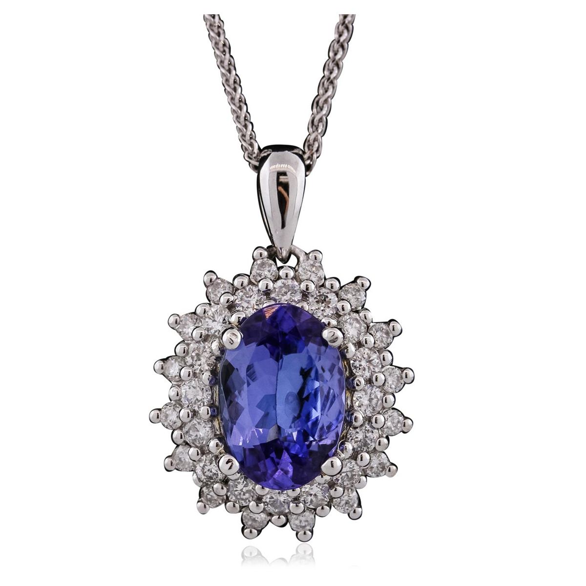 One electronically tested 14KT white gold ladies combination cast & assembled pendant & chain 18.0" long, medium cable link with a lobster claw clasp with a bright polish finish. Identified with markings of "14K". Condition is new. Containing: One prong set oval modified brilliant cut natural tanzanite, measuring 10.77 x 7.41 x 4.82mm, approximate weight of 2.67ct., clarity is eye clean, type I, medium light, very slightly grayish, violet color, (GIA V 4/3), cut is good. Thirty-Two prong set round brilliant cut diamonds, measuring 1.90 - 1.50 x 1.02mm (depth est.) approximate total weight of 32 Stones = 0.57ct. . Clarity: I-1 to I-2. Color: I - J, Cut is Good. Colored gemstones are presumed to have been subjected to commonly used enhancement processes. All diamonds and colored gemstones are graded in the mounting, unless otherwise stated.. Total Weight of Colored Stones 2.67ct.. Total Weight of Diamonds 0.57ct.. Total Weight of Pendant & Chain 6.00 grams. GGL Appraised at $6,695.00.