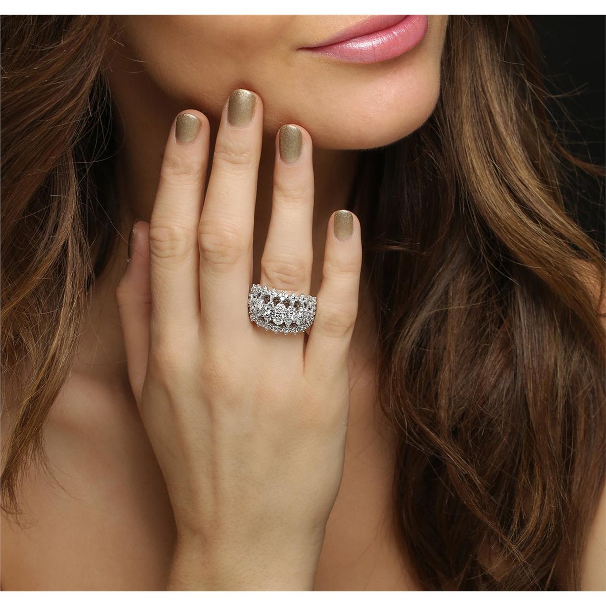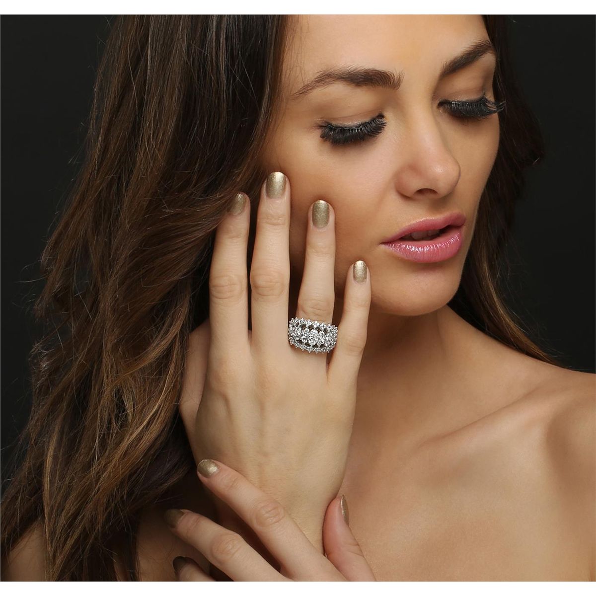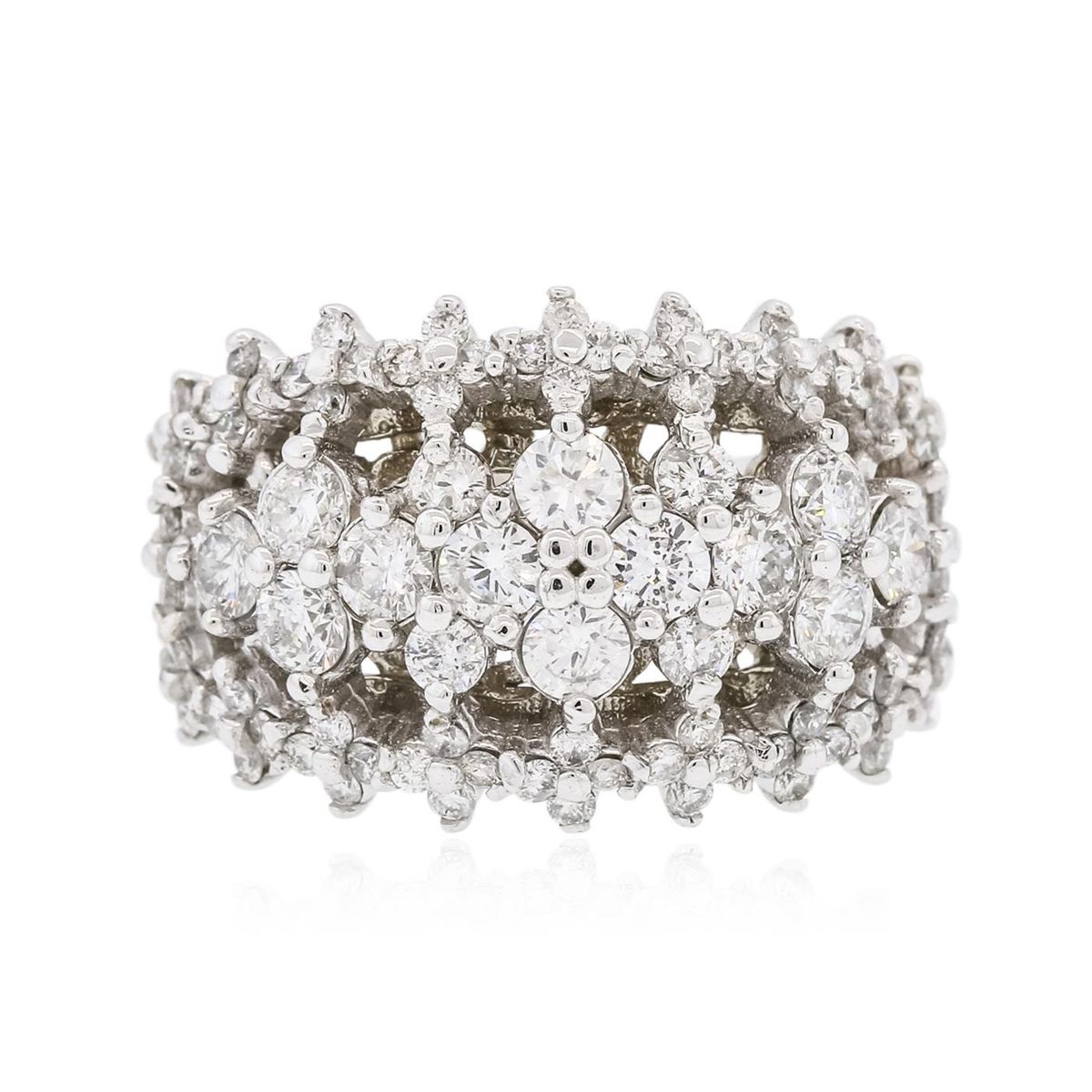 One electronically tested 14KT white gold ladies cast diamond ring with a bright polish finish. The ring features a diamond curvature set within mirroring diamond ribbons supported by split shoulders and an elaborate under gallery, completed by a four millimeter wide band. Identified with markings of "14K". Condition is new, good workmanship. Containing: Twelve prong set round brilliant cut diamonds, measuring 3.30 - 3.20 x 1.95mm (depth est.) approximate total weight of 12 Stones = 1.60ct. Graded in the setting. Clarity: SI-2 to I-1. Color: G - I Four prong set round brilliant cut diamonds, measuring 2.50 - 2.40 x 1.47mm (depth est.) approximate total weight of 4 Stones = 0.25ct. Graded in the setting. Clarity: SI-2 to I-1. Color: G - I Eighty prong set round brilliant cut diamonds, measuring 1.40 - 1.30 x 0.81mm (depth est.) approximate total weight of 80 Stones = 0.82ct. Graded in the setting. Clarity: SI-1 to I-1. Color: G - I. Total Weight of Diamonds 2.67ct. Total Weight of Ring 10.91 grams. AIG Appraised at $10,100.00.