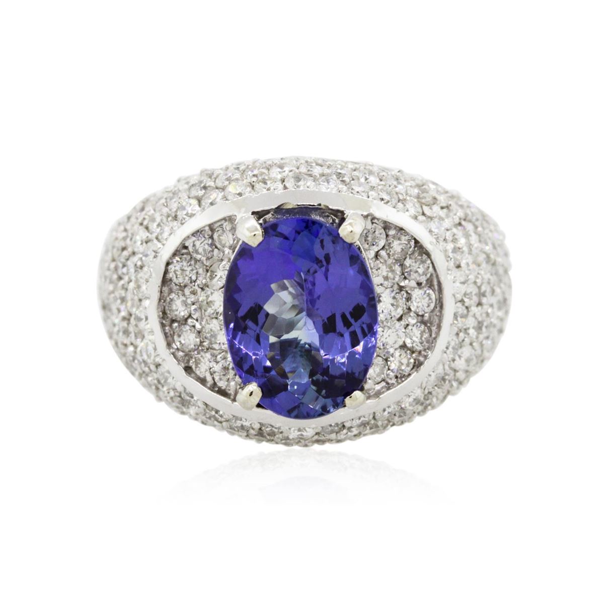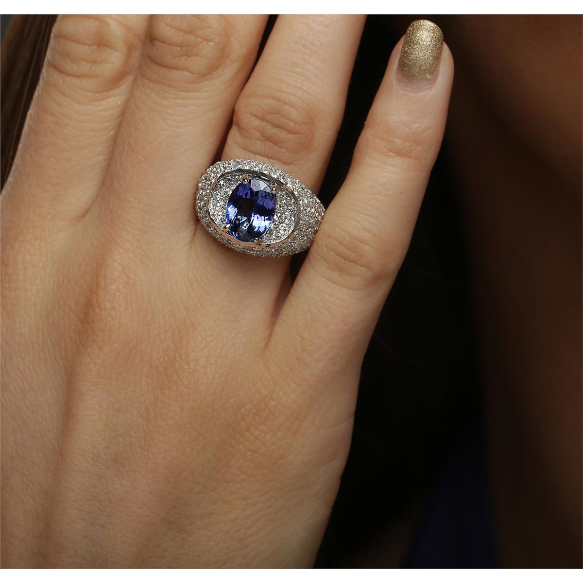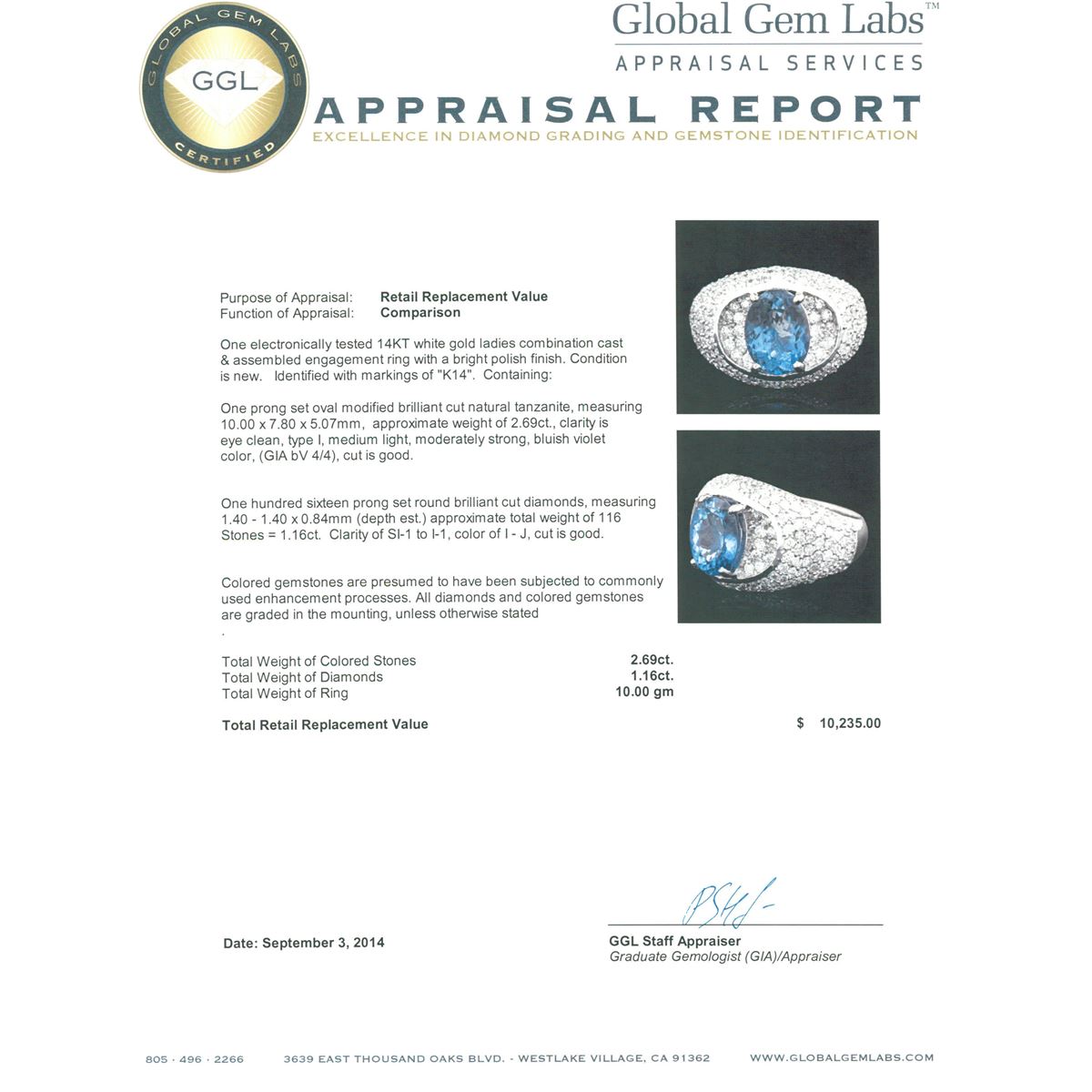 One electronically tested 14KT white gold ladies combination cast & assembled engagement ring with a bright polish finish. Identified with markings of "K14". Condition is new. Containing: One prong set oval modified brilliant cut natural tanzanite, measuring 10.00 x 7.80 x 5.07mm, approximate weight of 2.69ct., clarity is eye clean, type I, medium light, moderately strong, bluish violet color, (GIA bV 4/4), cut is good. One Hundred Sixteen prong set round brilliant cut diamonds, measuring 1.40 - 1.40 x 0.84mm (depth est.) approximate total weight of 116 Stones = 1.16ct. Clarity: SI-1 to I-1. Color: I - J, Cut is Good. Colored gemstones are presumed to have been subjected to commonly used enhancement processes. All diamonds and colored gemstones are graded in the mounting, unless otherwise stated. Total Weight of Colored Stones 2.69ct. Total Weight of Diamonds 1.16ct. Total Weight of Ring 10.00 grams. GGL Appraised at $10,235.00.