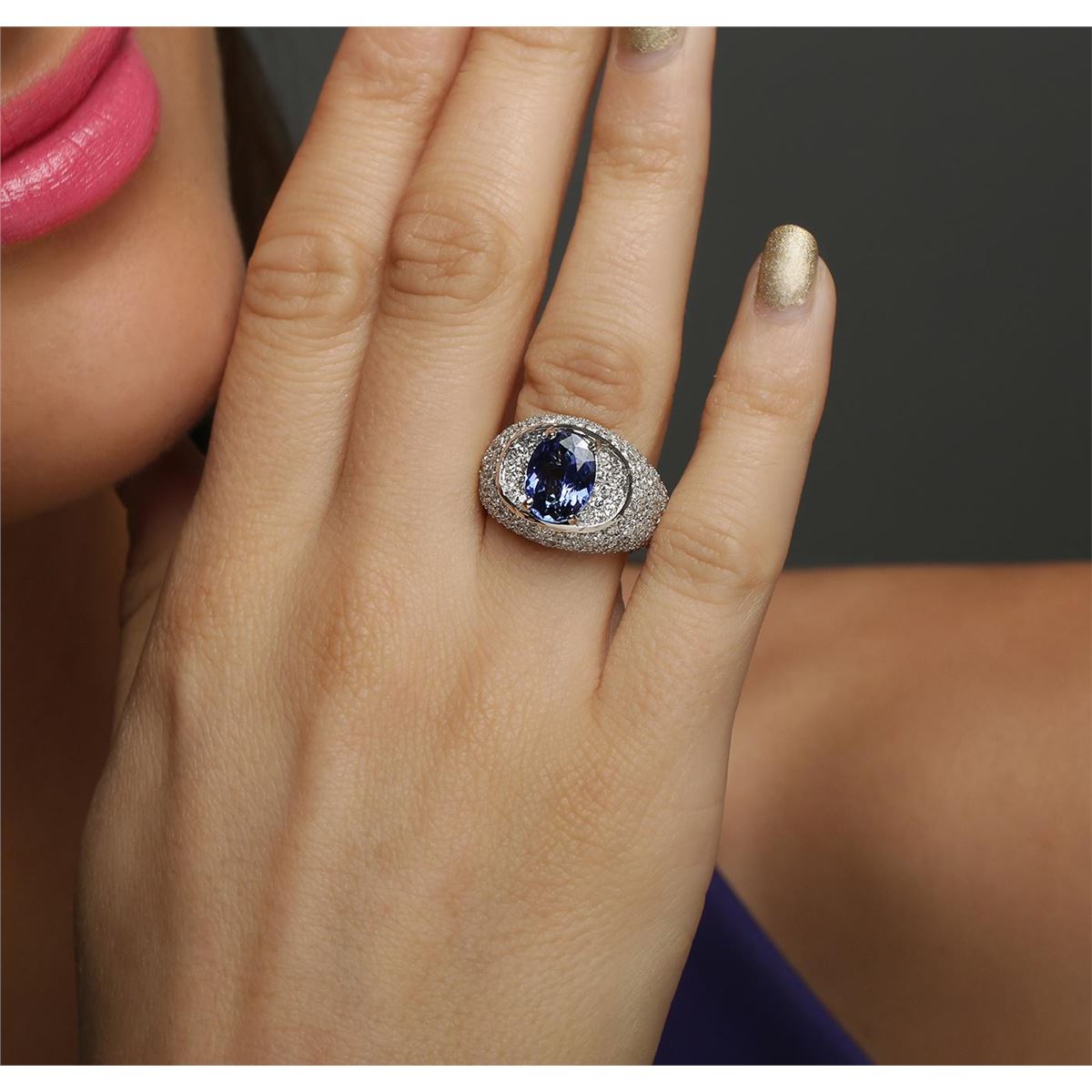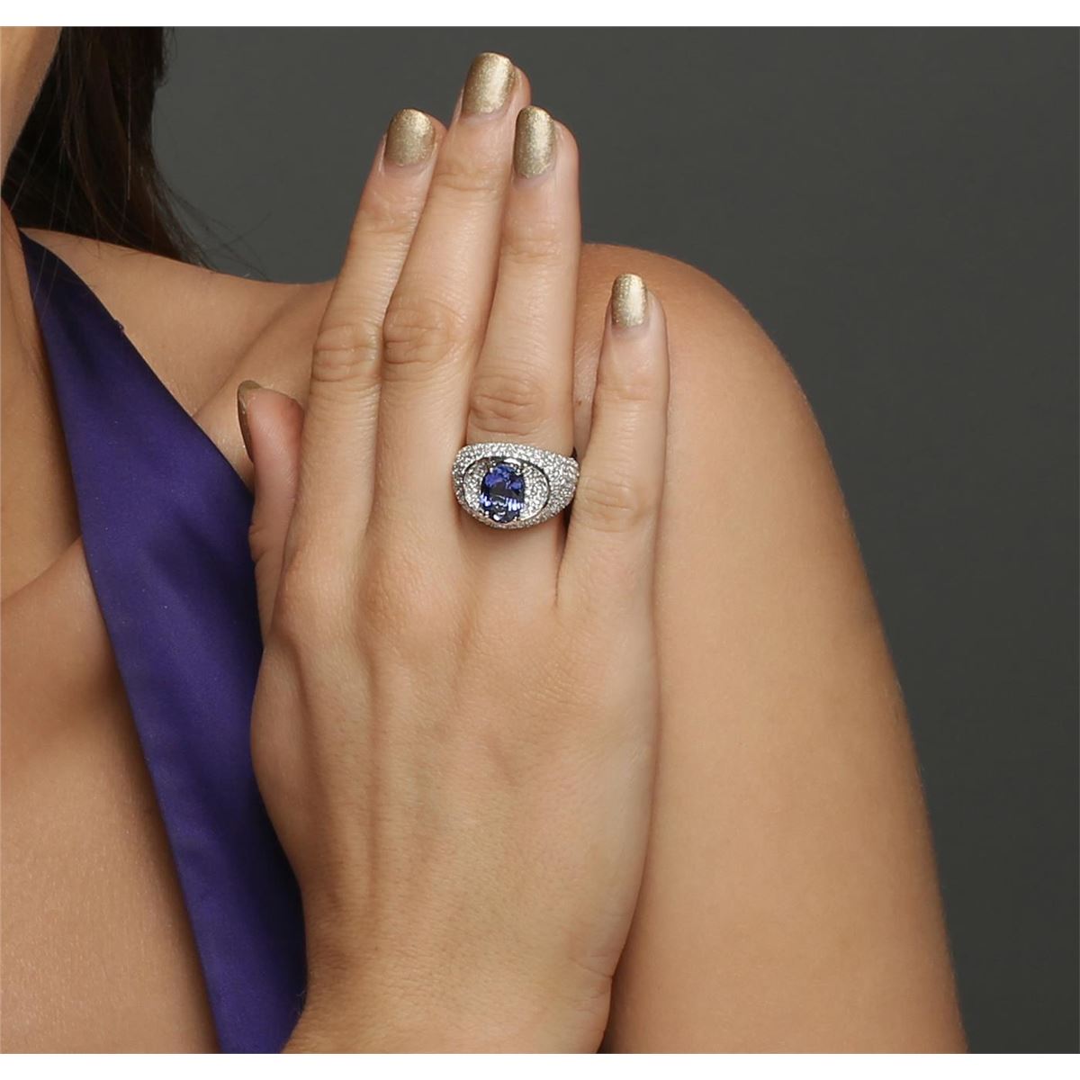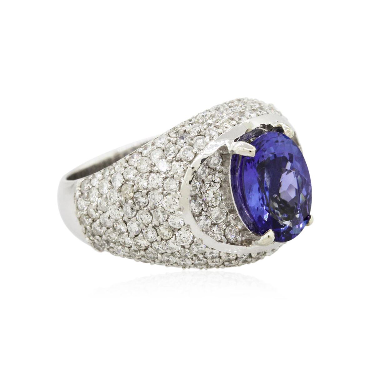 One electronically tested 14KT white gold ladies combination cast & assembled engagement ring with a bright polish finish. Identified with markings of "K14". Condition is new. Containing: One prong set oval modified brilliant cut natural tanzanite, measuring 10.00 x 7.80 x 5.07mm, approximate weight of 2.69ct., clarity is eye clean, type I, medium light, moderately strong, bluish violet color, (GIA bV 4/4), cut is good. One Hundred Sixteen prong set round brilliant cut diamonds, measuring 1.40 - 1.40 x 0.84mm (depth est.) approximate total weight of 116 Stones = 1.16ct. Clarity: SI-1 to I-1. Color: I - J, Cut is Good. Colored gemstones are presumed to have been subjected to commonly used enhancement processes. All diamonds and colored gemstones are graded in the mounting, unless otherwise stated. Total Weight of Colored Stones 2.69ct. Total Weight of Diamonds 1.16ct. Total Weight of Ring 10.00 grams. GGL Appraised at $10,235.00.