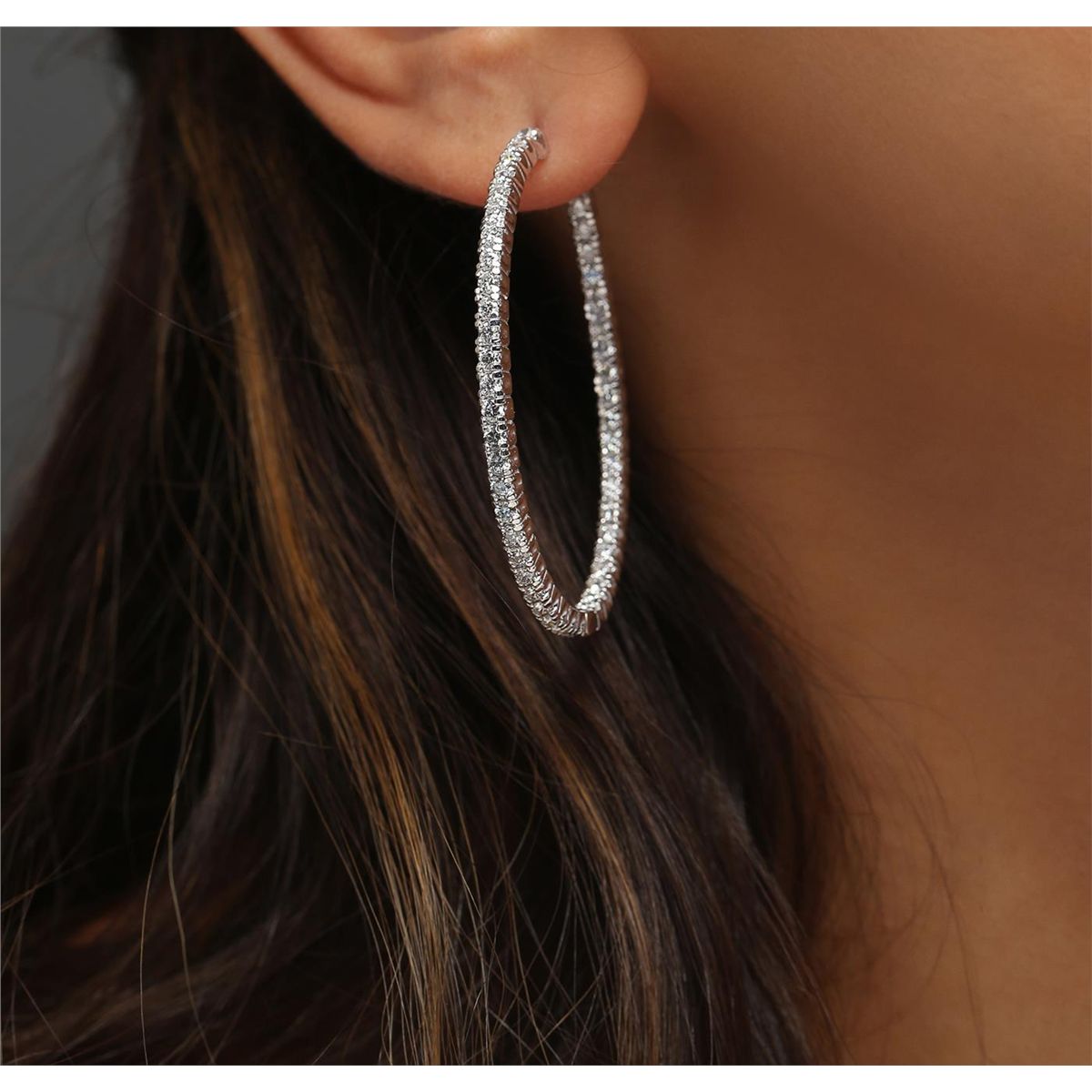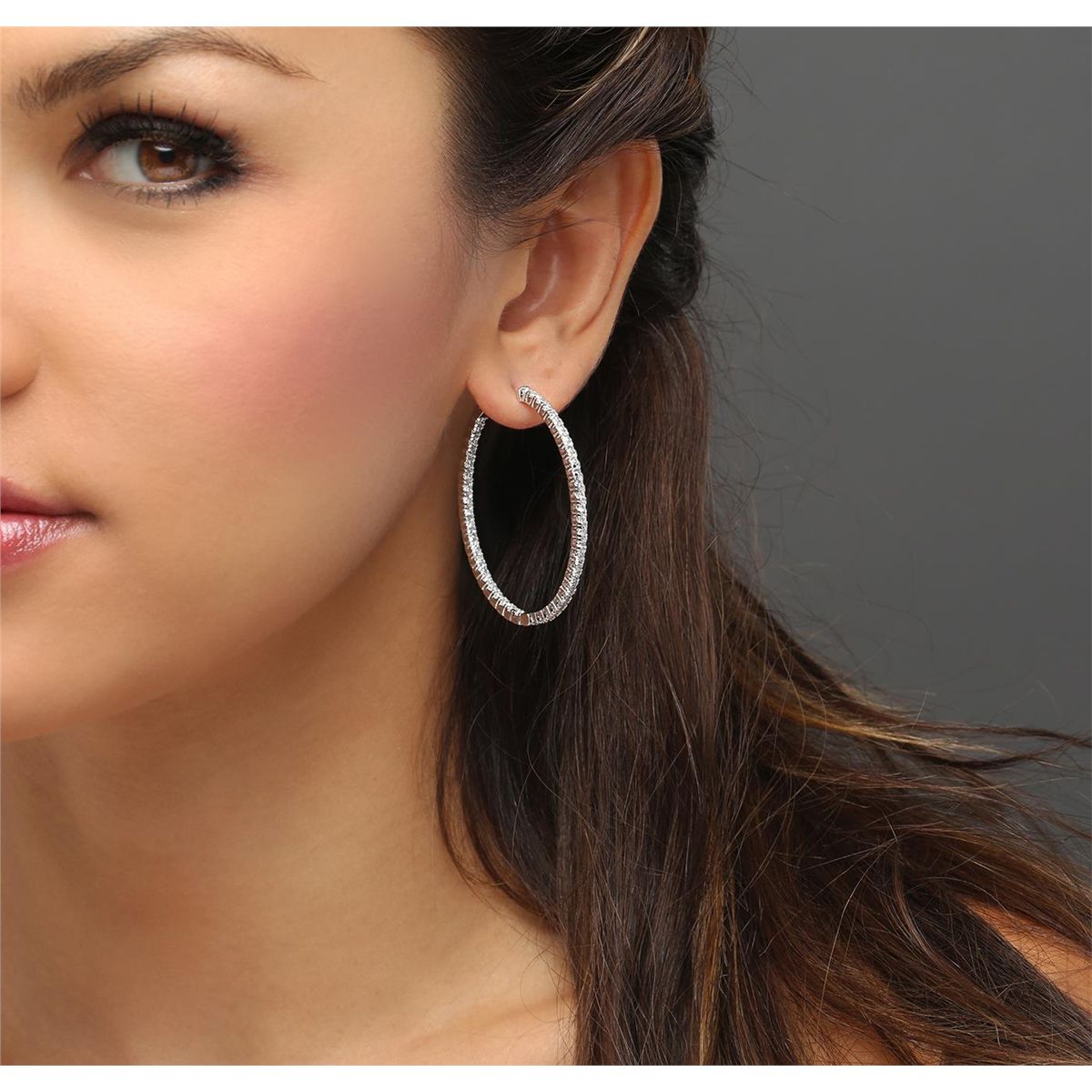 One pair electronically tested 14KT white gold ladies combination cast & assembled hoop earrings with hinged clip backs with a bright polish finish. Identified with markings of "14K". Condition is new. Containing: Ninety-Two prong set round brilliant cut diamonds, measuring 2.00 - 2.00 x 1.20mm (depth est.) approximate total weight of 92 Stones = 2.69ct. Clarity: I-1 to I-2. Color: I - J, Cut is Good. All diamonds are graded in the mounting, unless otherwise stated. Total Weight of Diamonds 2.69ct. Total Weight of Earrings 13.20 grams. GGL Appraised at $8,250.00.