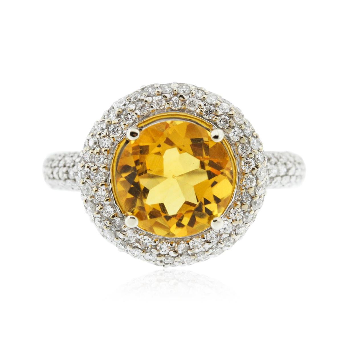 One electronically tested 14KT white gold Ladies combination cast & assembled ring with a bright polish finish. Condition is new. Identified with markings of "14K". Containing: One prong set round modified brilliant cut natural citrine quartz, measuring 9.10 - 9.10 x 6.10 mm, exact weight 2.70ct., clarity is eye clean, type I, medium light, moderately strong, orangy yellow color, (GIA oY 4/4), cut is very good. Colored gemstones are presumed to have been subjected to commonly used color/clarity enhancement processes. One Hundred Seventy-One bead set round brilliant cut diamonds, measuring 1.00 - 1.00 x 0.60mm (depth est.) approximate. Total Weight of 171 Stones = 1.29ct. Clarity: I-2 to I-3. Color: I - J, Cut is Good. Total Weight of Colored Stones 2.70ct. Total Weight of Diamonds 1.29ct. Total Weight of Ring 5.80 grams. GGL Appraised at $4,935.00.